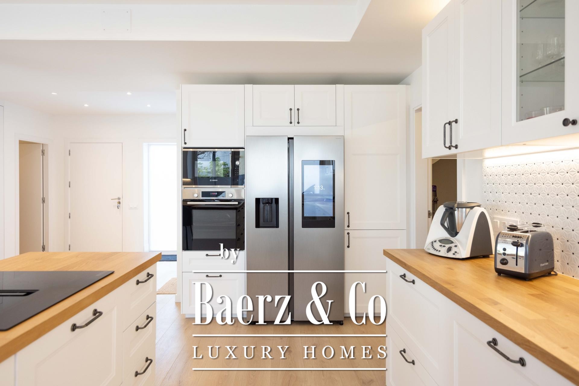 A seamless flow between the living room and a bespoke open-plan kitchen, equipped with Bosch appliances and an American-style refrigerator, enables both private family life and sophisticated entertaining. An elegant wood-burning fireplace anchors the main living area, while the interiors reflect understated luxury and functional design.