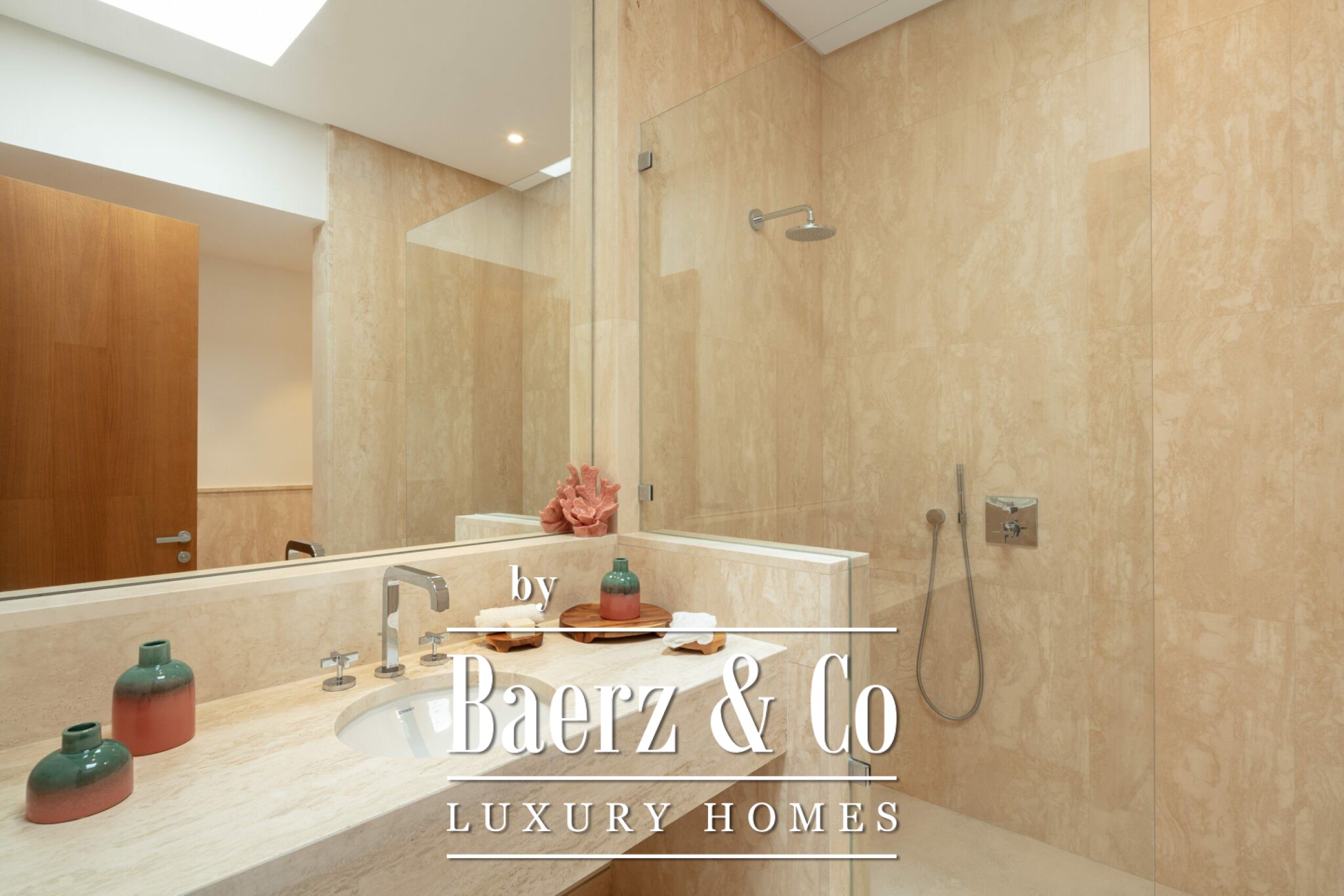 Bedrooms are thoughtfully placed: two on the ground level with garden access, and four above, connected by a gallery walkway bathed in sky-lit natural light. Each bedroom claims a private bathroom and upper garden access, while the master suite offers long, uninterrupted views.