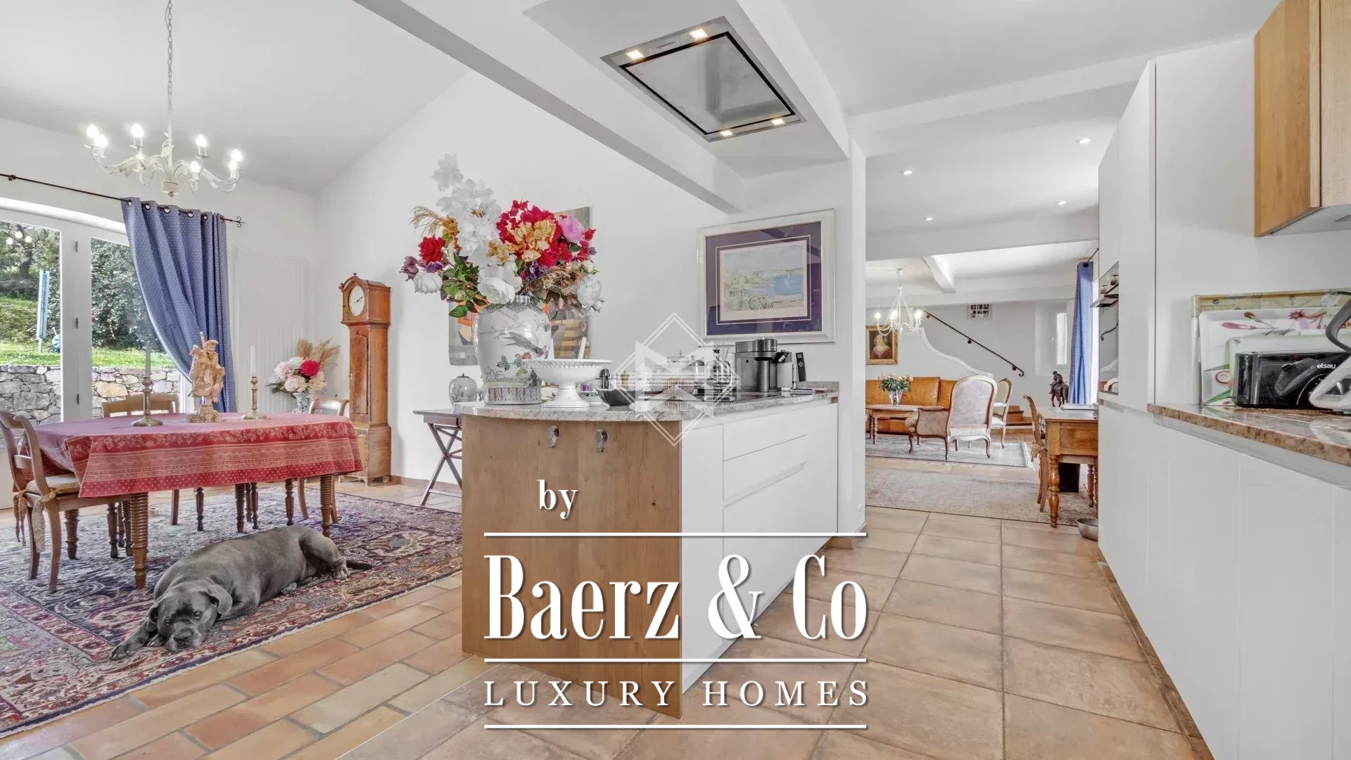 The interconnected living area flows into a welcoming kitchen, while a dedicated dining space with a fireplace and an adjacent covered terrace with barbecue invite gatherings throughout the seasons. Light fills the primary living room, where another fireplace brings comfort on winter evenings.