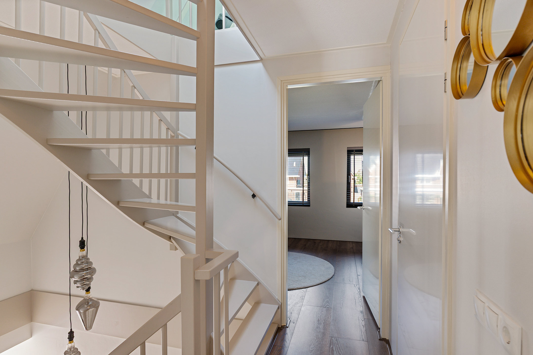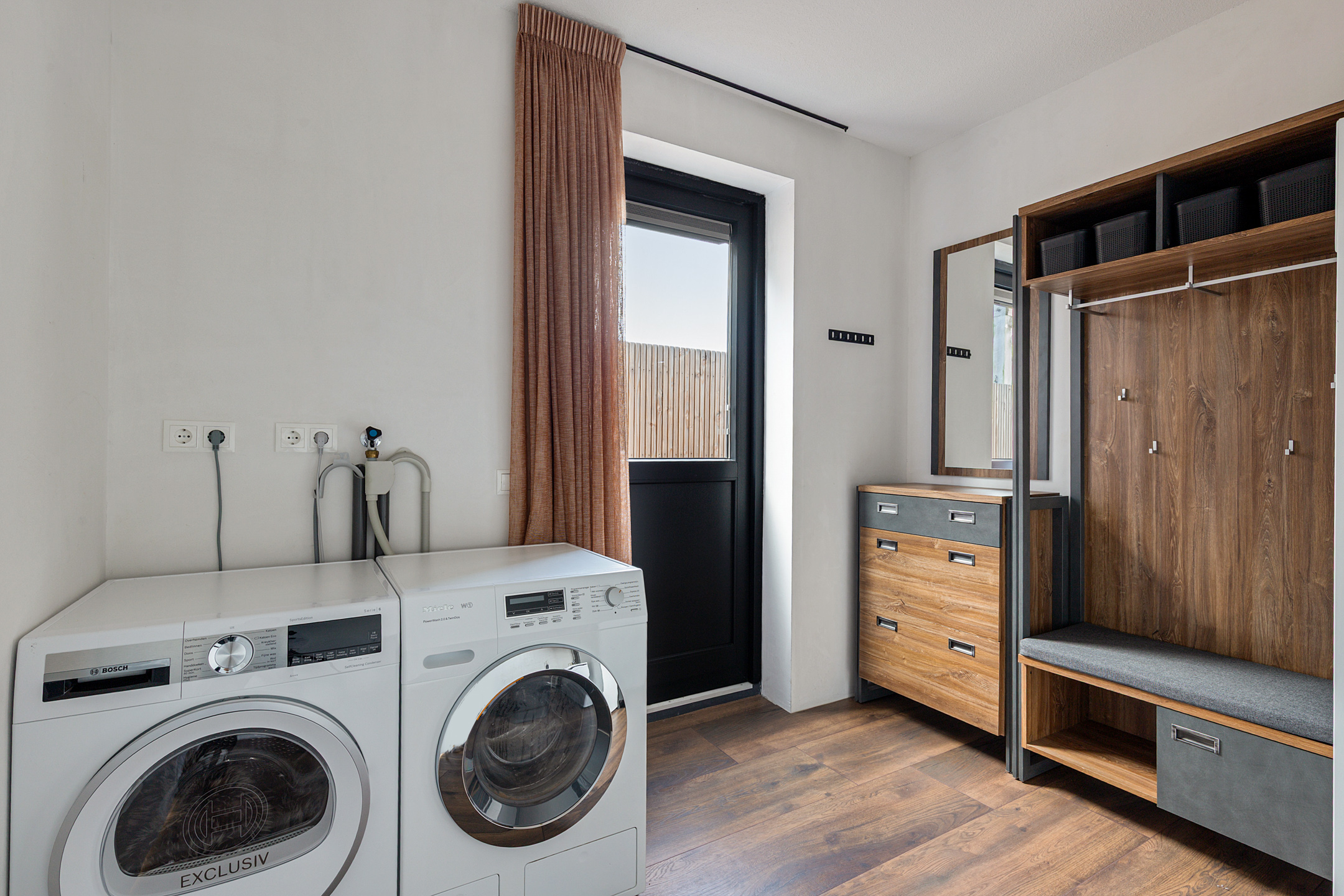 The utility room houses the advanced heat pump system with 190-litre boiler and laundry connections. The whisper-quiet air-source heat pump is discreetly placed outside. Throughout the ground floor, a refined laminate floor with underfloor heating and cooling ensures both style and comfort.