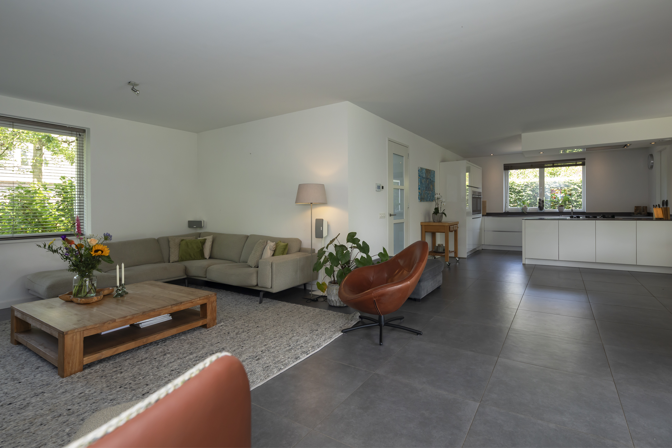 The dining area is also beautifully spacious. While seated at the table, you can enjoy the view of the beautiful garden. Double patio doors in the dining room open onto the generously sized covered terrace.