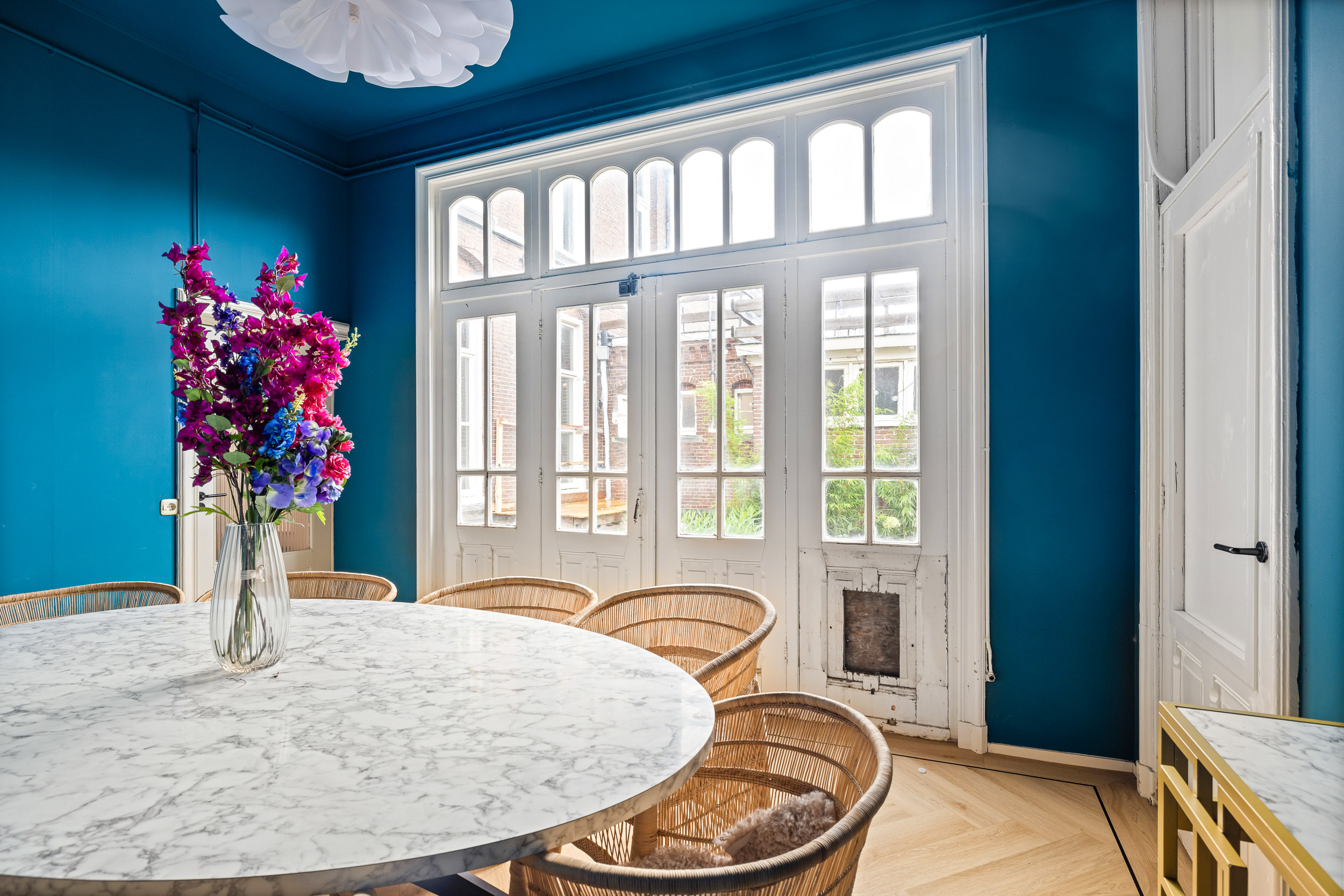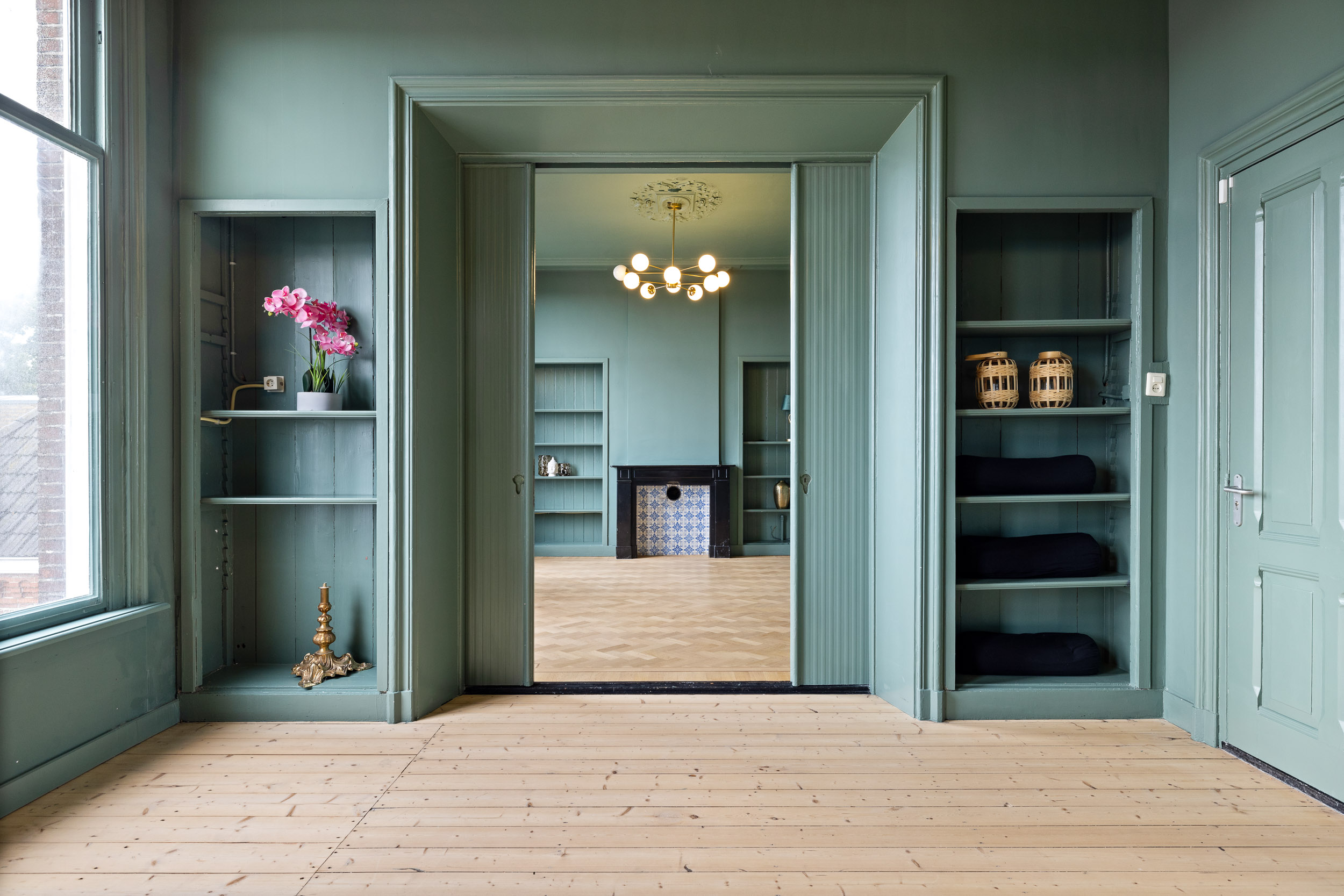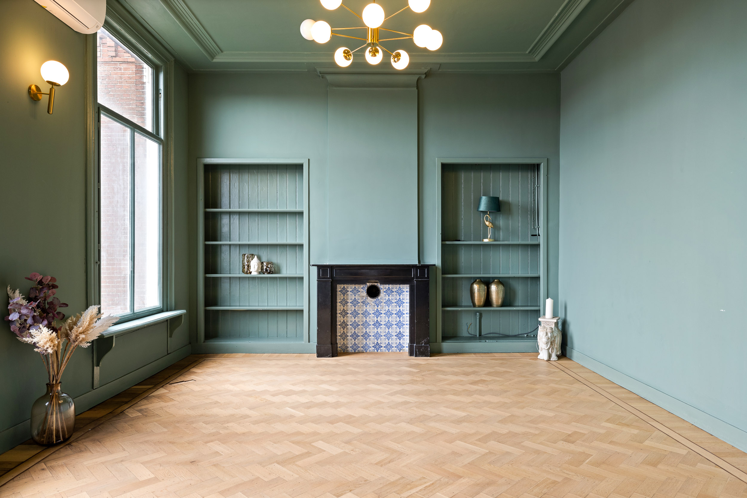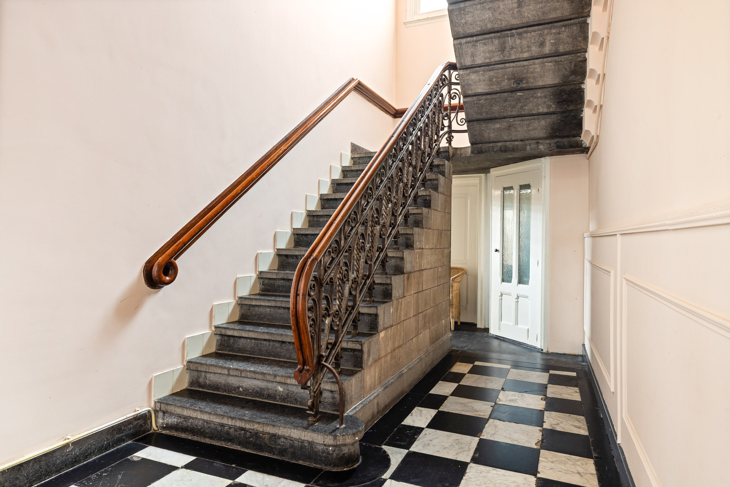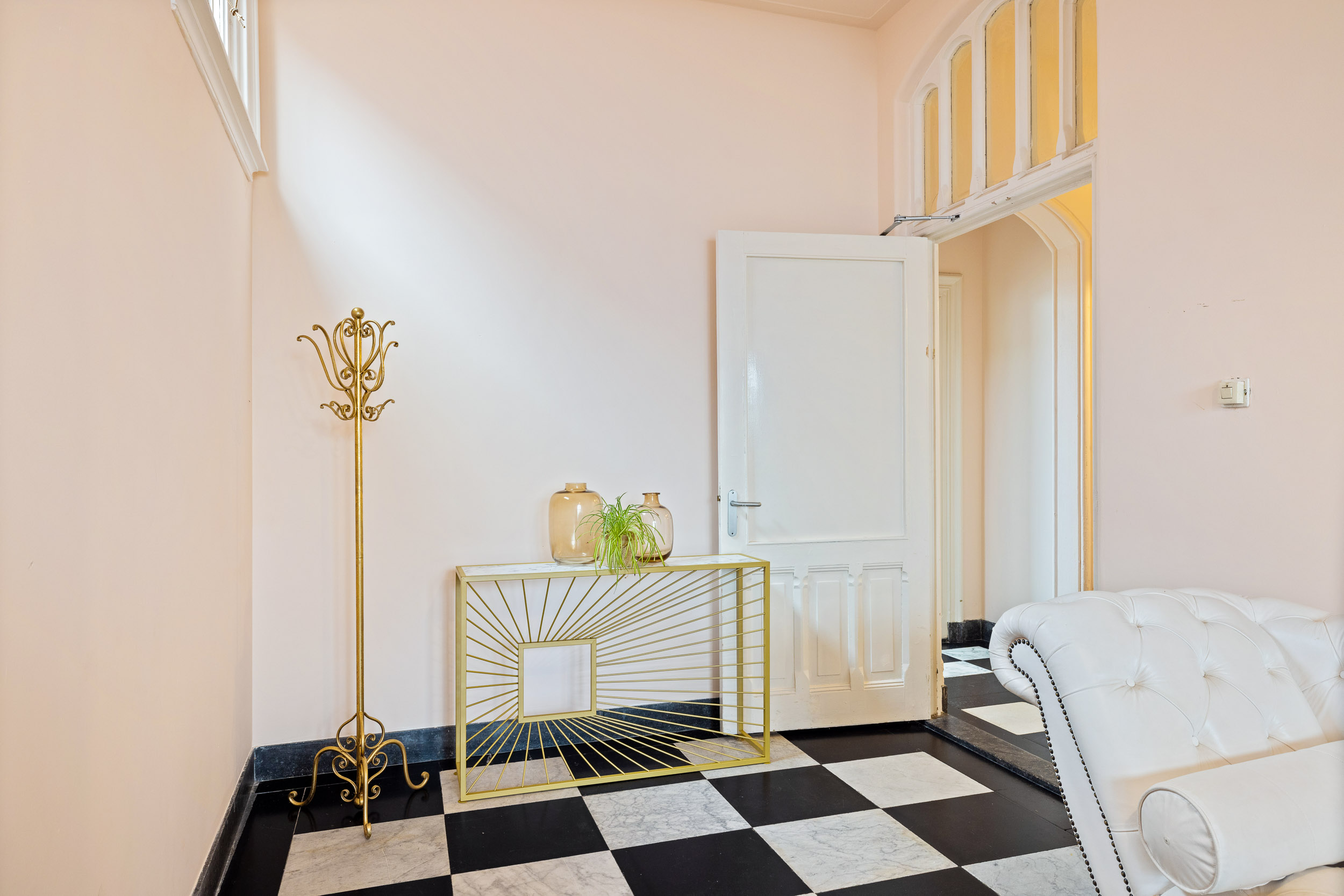 The monumental natural stone staircase with cast-iron balusters leads to the first floor, which has largely retained its original layout. From the landing, an ornate wooden door opens into the tiled hallway. To the right are the rooms en suite with sliding doors featuring brass fittings from Joure’s historic brass foundry. Original details, geometric ceiling mouldings, rosettes, parquet floors and a black marble fireplace, have been beautifully preserved.