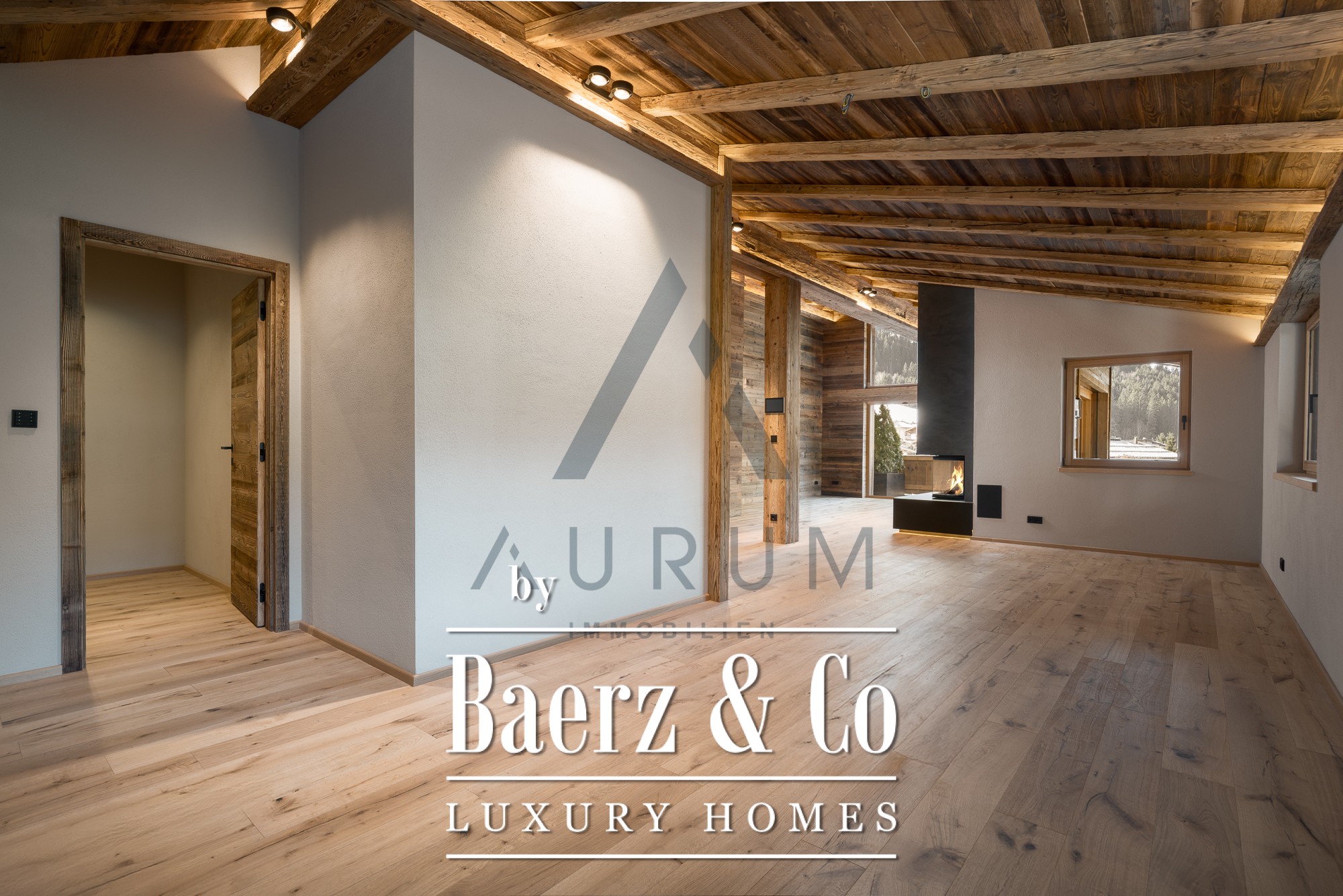 A grand staircase or private elevator ushers you into 200 m² of living space, where reclaimed wood, natural stone, and glass compose a facade attuned to Kitzbühel's modern vernacular. Inside, the first level’s three fully furnished bedrooms each offer bespoke carpentry, built-in wardrobes, and en-suite bathrooms, all connected by a thoughtfully proportioned hall. The master bedroom leads directly to a sun-bathed balcony, lending a distinct sense of retreat.