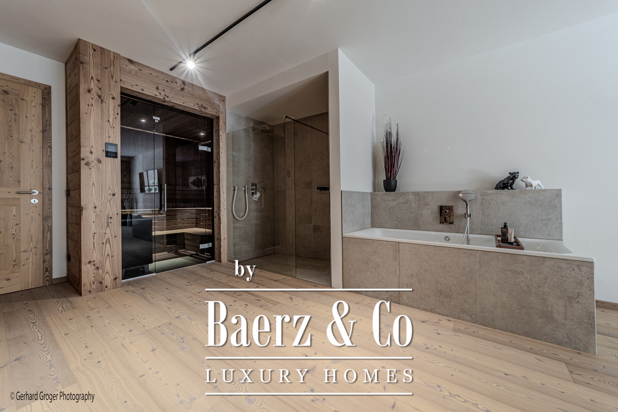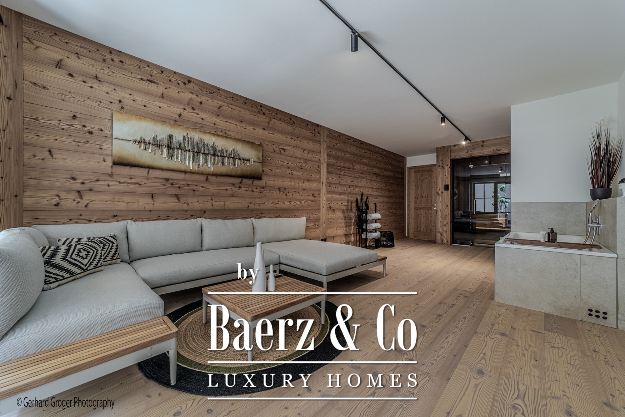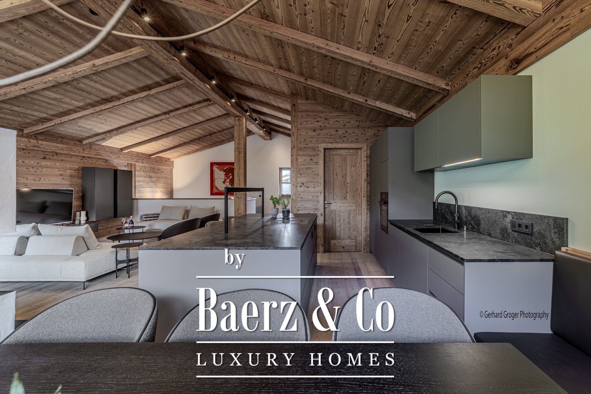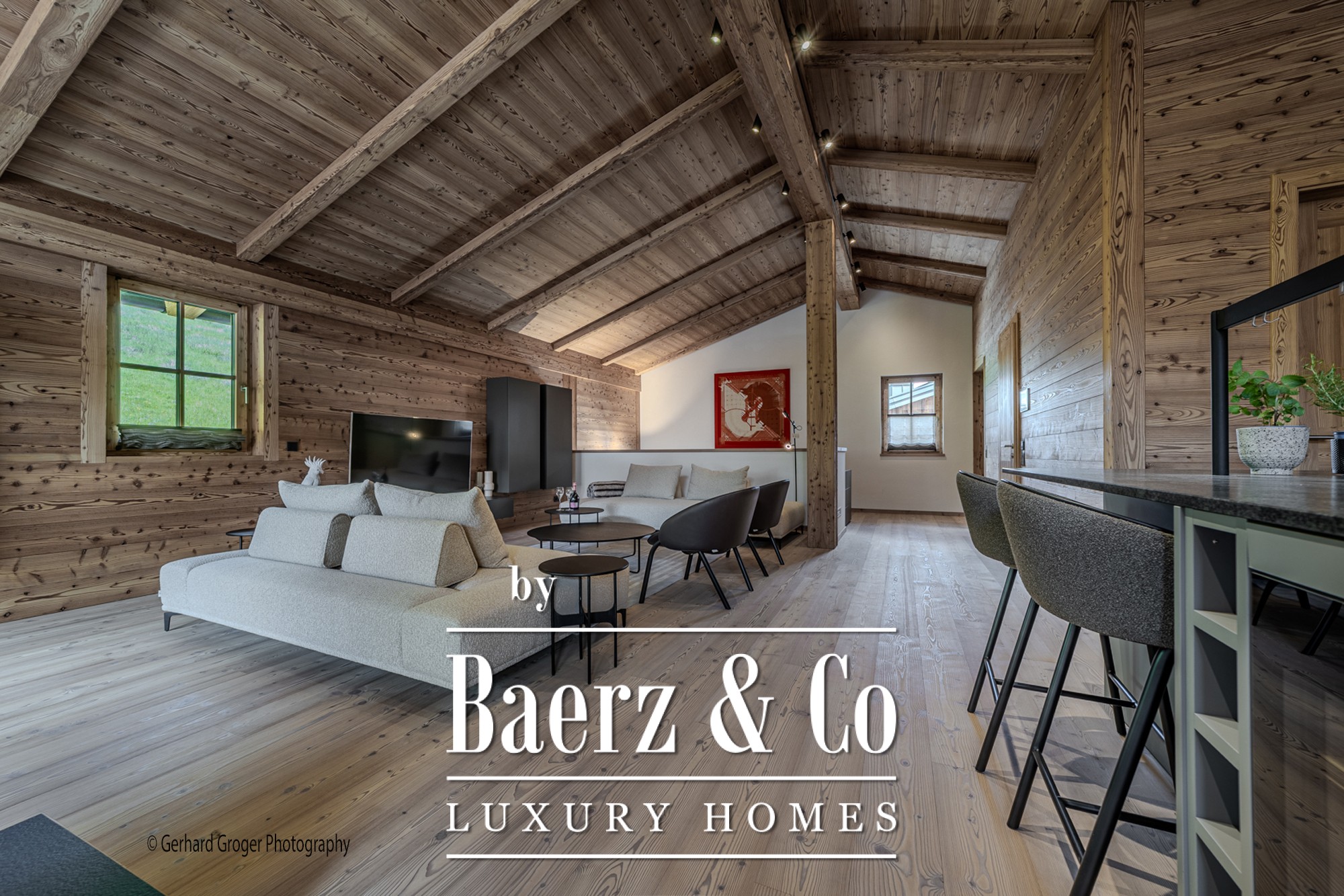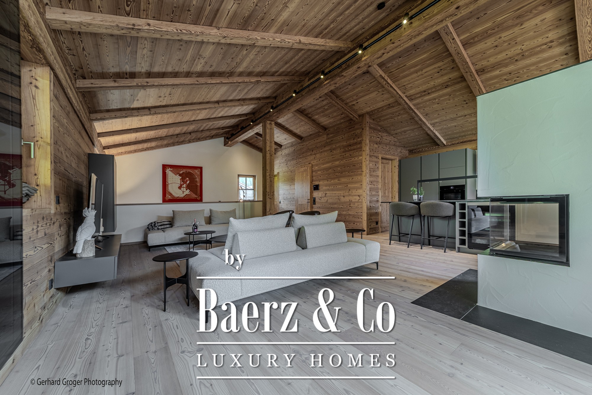 On the basement level, residents will find a secluded bedroom with en-suite bath and an elegant wellness retreat, including a sauna. Two additional bedrooms with private baths are arranged on the ground floor, ensuring comfort for both family and guests. The upper floor offers a light-filled living and dining area, enhanced by an open fireplace and exposed roof trusses, leading out to expansive terraces that frame the alpine panorama.