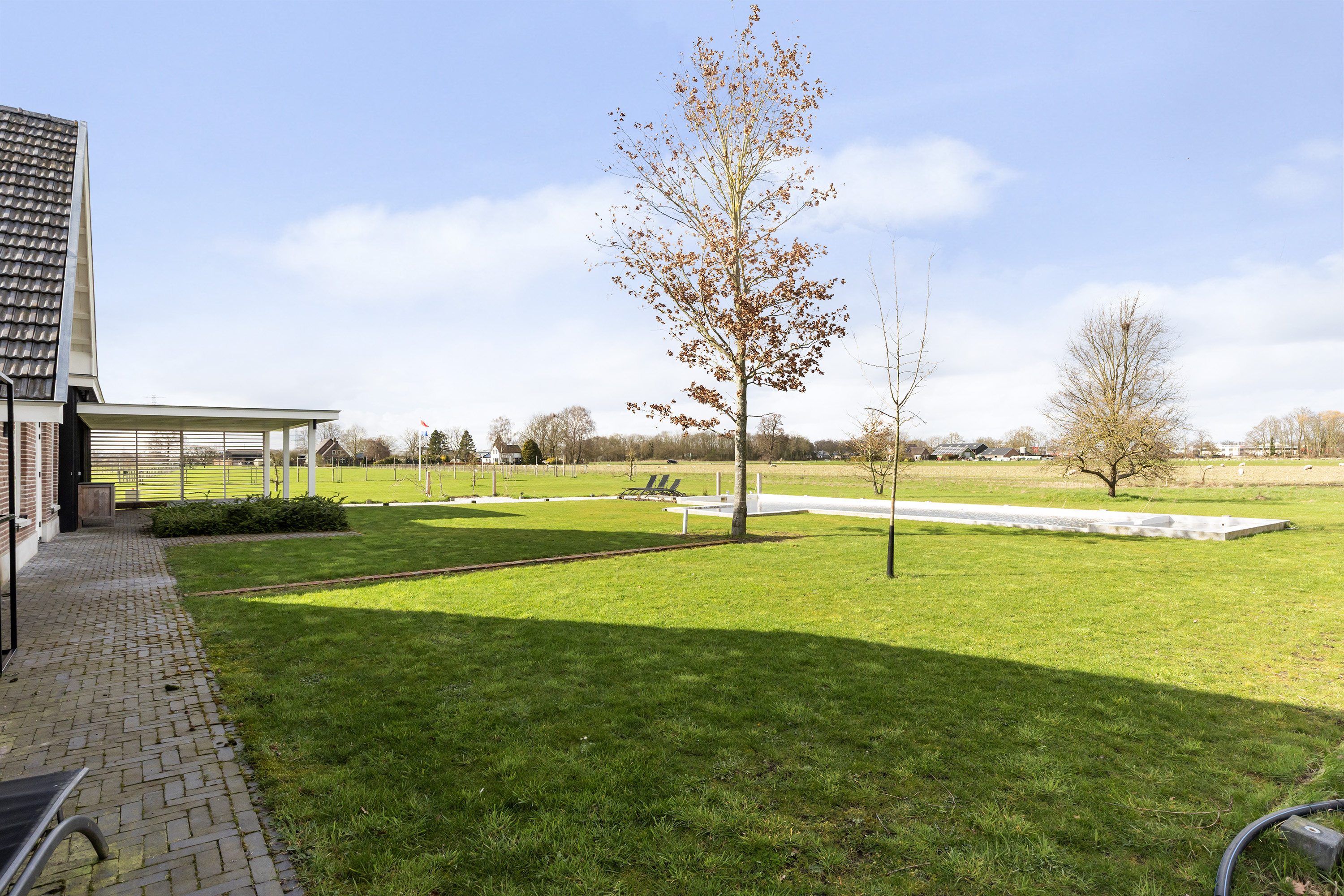 The farmhouse stands on approximately 2,500 m² of private land and forms part of an exclusive rural estate of around 4 hectares, designed in accordance with a thoughtfully implemented landscape and nature plan. Here, you enjoy wide, open views, mature greenery and a remarkable sense of freedom, without the responsibility of maintaining the surrounding grounds.