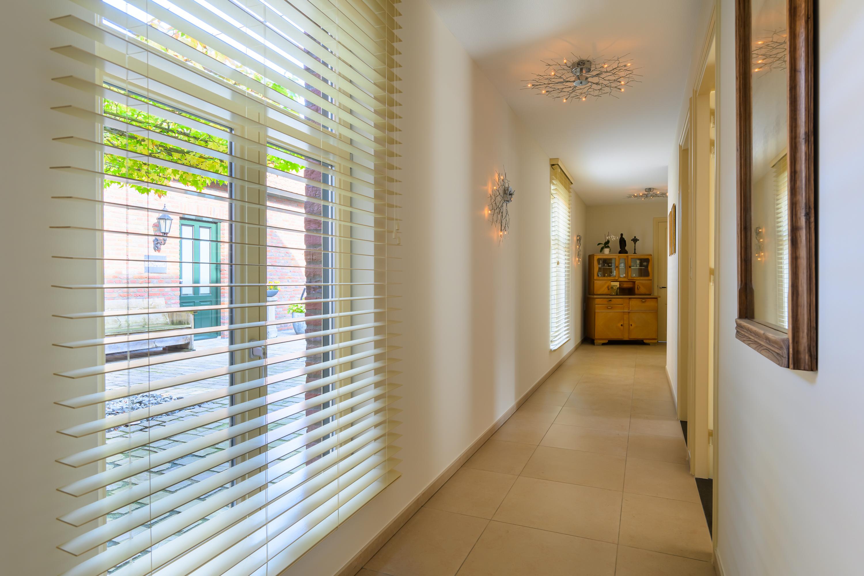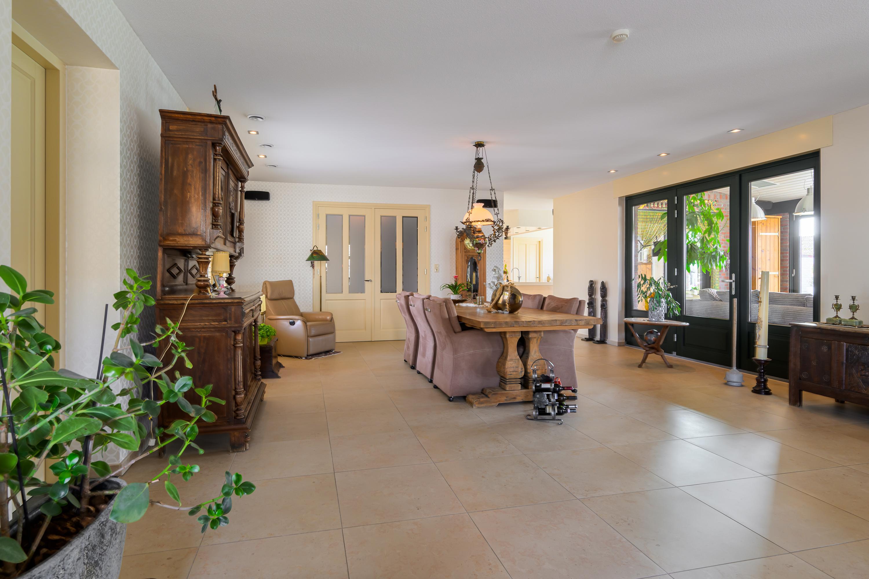 Deze luxe afgewerkte woning is gebouwd in een U-vorm met een sfeervolle binnenplaats. Aan de linkerzijde ligt het woongedeelte. Bij binnenkomst in de royale hal valt direct de prachtige plavuizenvloer op, samen met de meterkast, trapopgang naar de eerste verdieping en een stijlvol toilet met fonteintje. Vanuit de hal komen we in de ruime woonkamer, gekenmerkt door strak gestucte wanden, inbouwspots en openslaande tuindeuren naar de binnenplaats. Warme kleuren, zachte stoffen en naturel materialen; allemaal ingrediënten die bijdragen aan een huiselijk 'ik kom thuis'-gevoel. Dit alles vind je zeker terug in deze prachtige woonkamer. Alles is netjes, maar vooral sfeervol en luxe afgewerkt.
