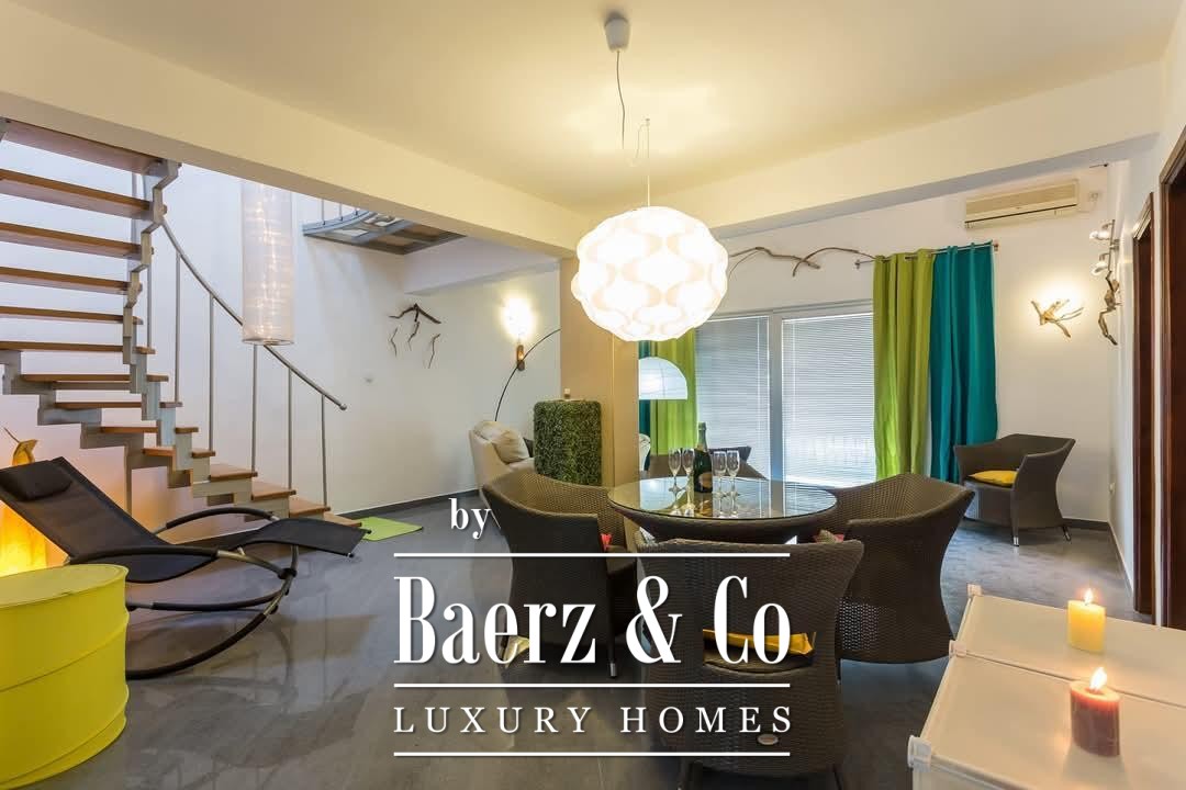The residence spans 110 m² and balances privacy with openness. The lower level unfolds into a living room, a separate kitchen, two bedrooms, a bathroom, and two terraces. The larger terrace frames direct, uninterrupted sea views and the silhouette of Kotor’s medieval skyline. The upper level includes a third bedroom, a second bathroom, and a smaller living room, offering versatile space for family or guests. Each room is fully furnished and carefully prepared for immediate use.