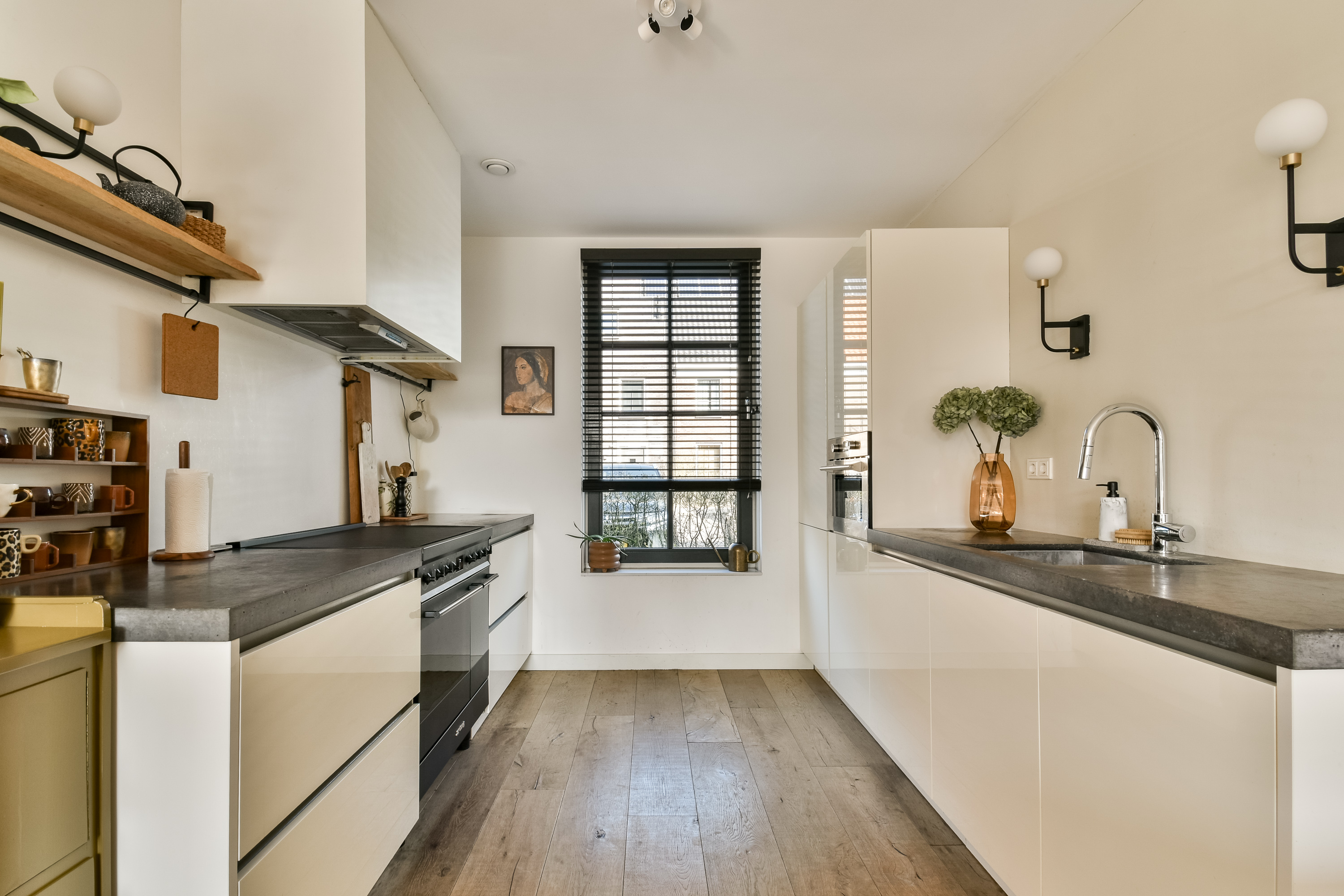 Through the entrance you enter the hallway with meter cupboard and a modern wall-mounted toilet with washbasin. At the front of the house is the open kitchen, equipped with various built-in appliances and a spacious countertop. The living room is located at the rear, with French doors providing access to the beautifully landscaped backyard. The ground floor also features a practical storage cupboard under the stairs.