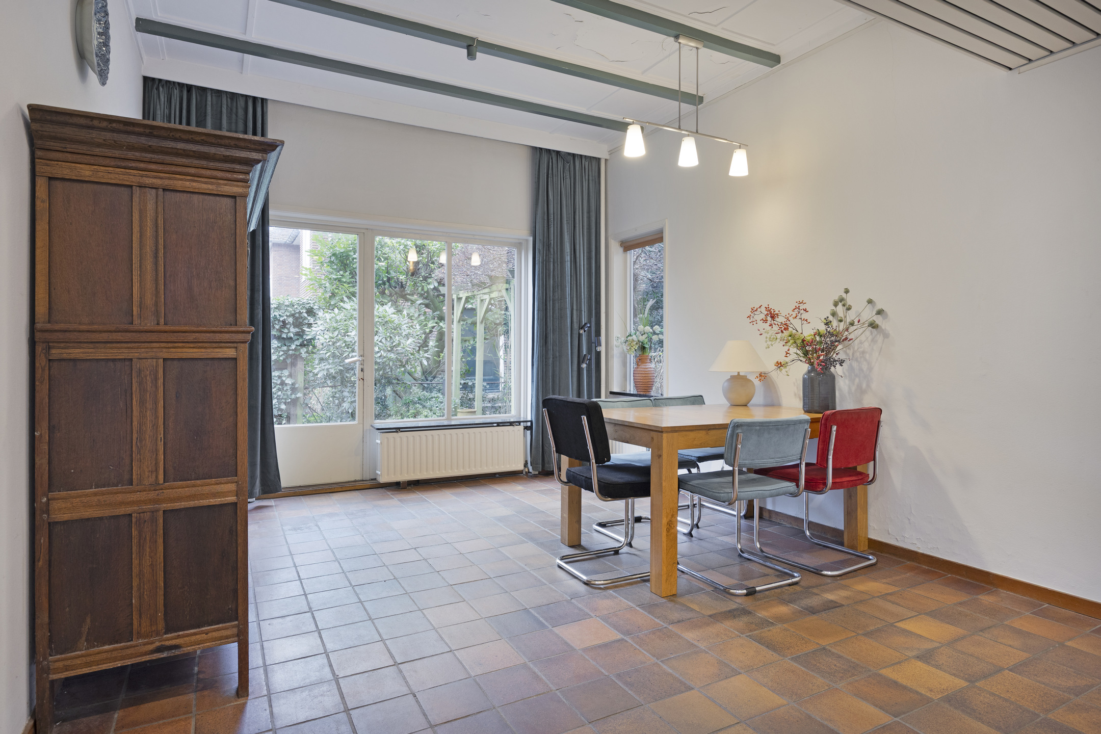 Aan de achterzijde van de woning ligt de keuken met alle ruimte voor de keukenopstelling en een grote eettafel. De deur naar de tuin staat bij mooi weer waarschijnlijk altijd open en zal voor een zoete inval van vrienden en familie zorgen. Aansluitend aan de keuken bevindt zich de bijkeuken met achterdeur naar de tuin. Wasmachine, droger, extra koel-vriescombinatie, wijnklimaatkast: er is ruimte genoeg!