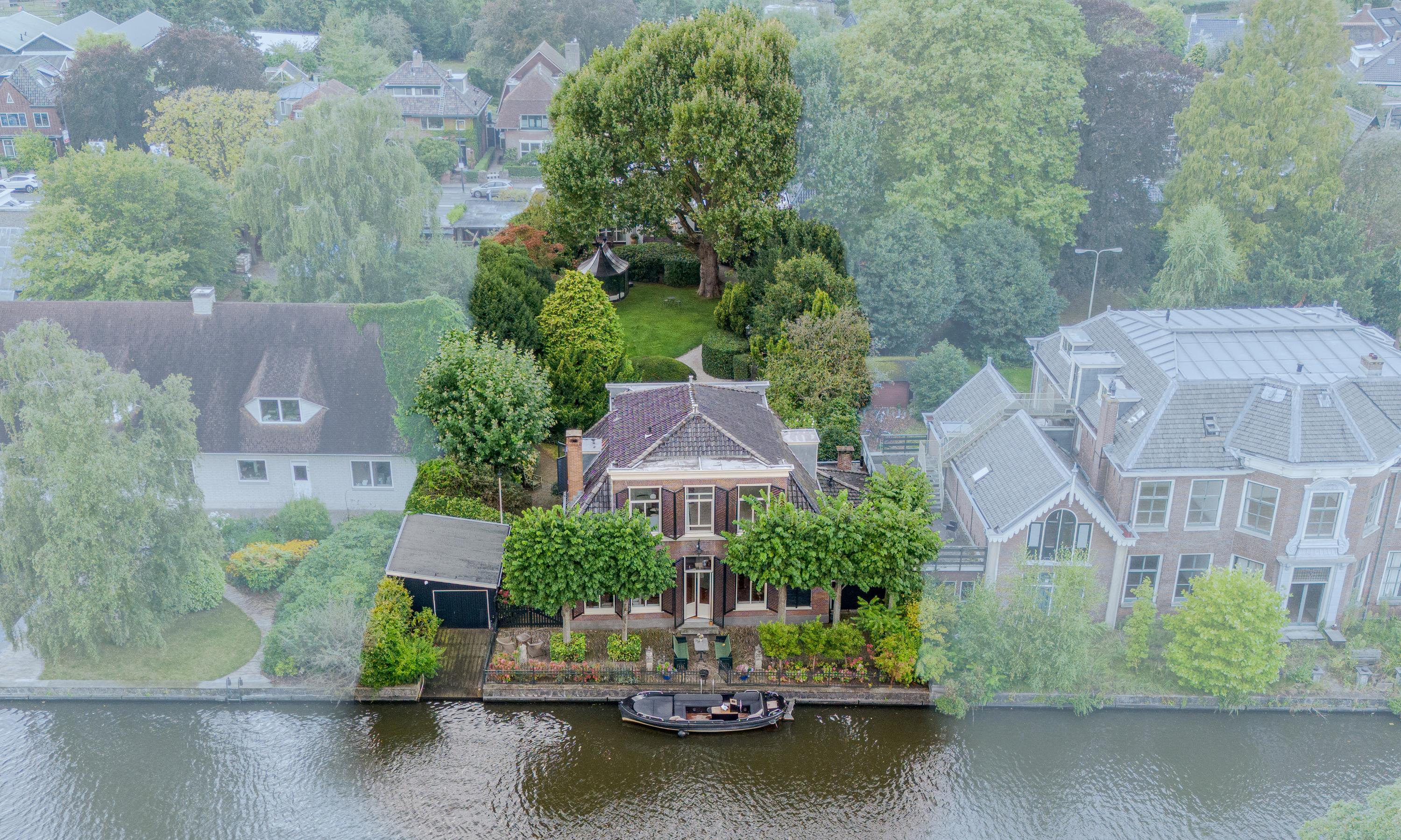 The main building from 1820 is characterised by the classic style elements from that period: a central entrance with two windows with shutters on either side and on the first floor the beginning of the roof with a central facade with three windows with shutters. The characteristics characteristic of this construction period are also present inside; high stately ceilings and windows on all sides provide beautiful light at any time of the day. On the ground floor there is an L-shaped living room en suite, fireplace with a conservatory on the garden side and a view of the Rhine on the water side. The central hall runs from front to back and has French doors to the garden with terrace on the water side. On the left side of the hall are the kitchen with utility room with a passage to the barn, the spacious basement and the formal dining room with again a beautiful view of the Rhine and the passing boats.