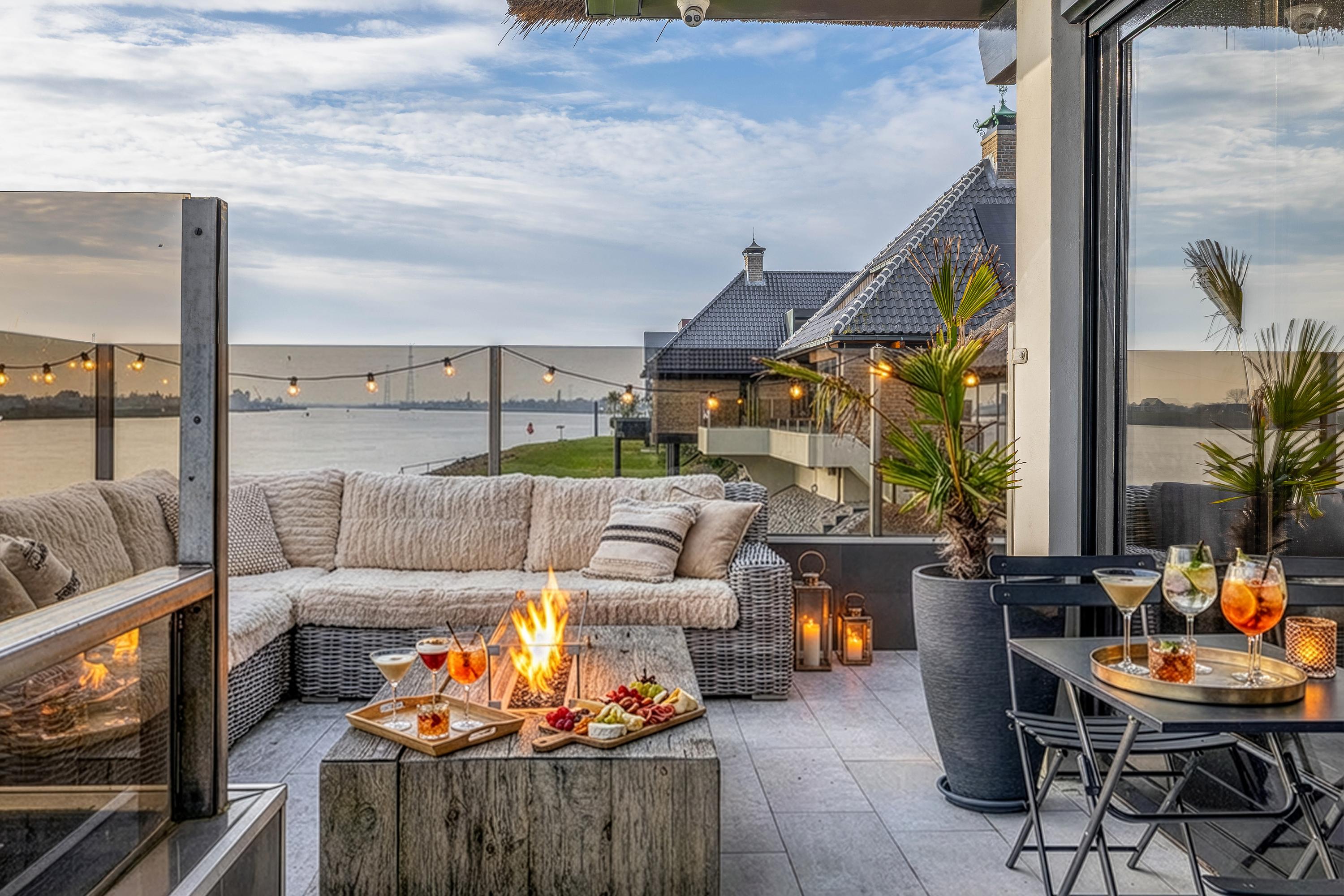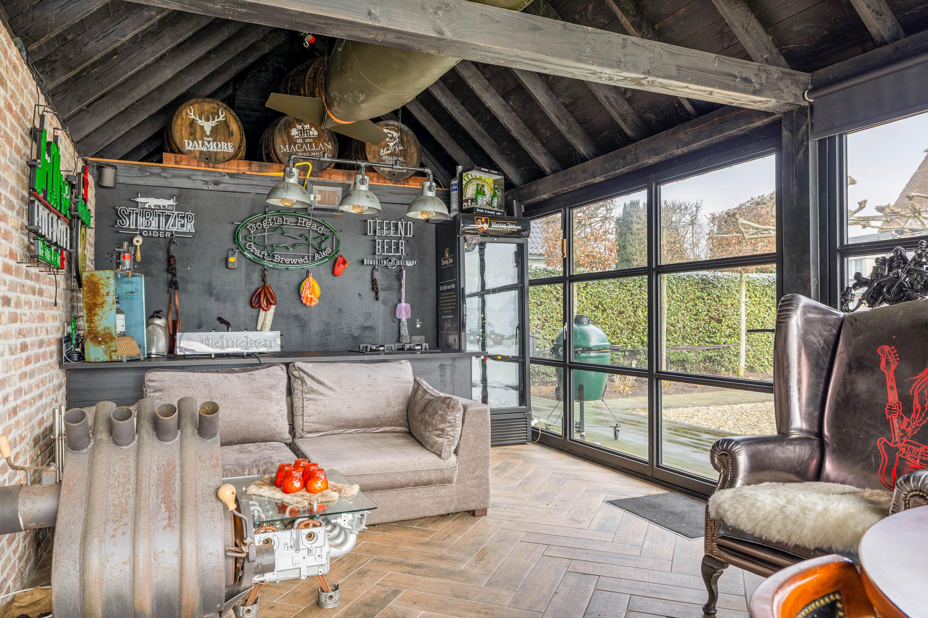 The garden surrounding the villa has been carefully landscaped and offers multiple places to enjoy outdoor living. An absolute highlight is the new outdoor lounge with bar and open fireplace. Here you can sit sheltered and in a cozy atmosphere, even when the evenings grow longer and temperatures drop. This is the perfect place for long dinners, drinks with friends and relaxing moments with a view of the Lek.