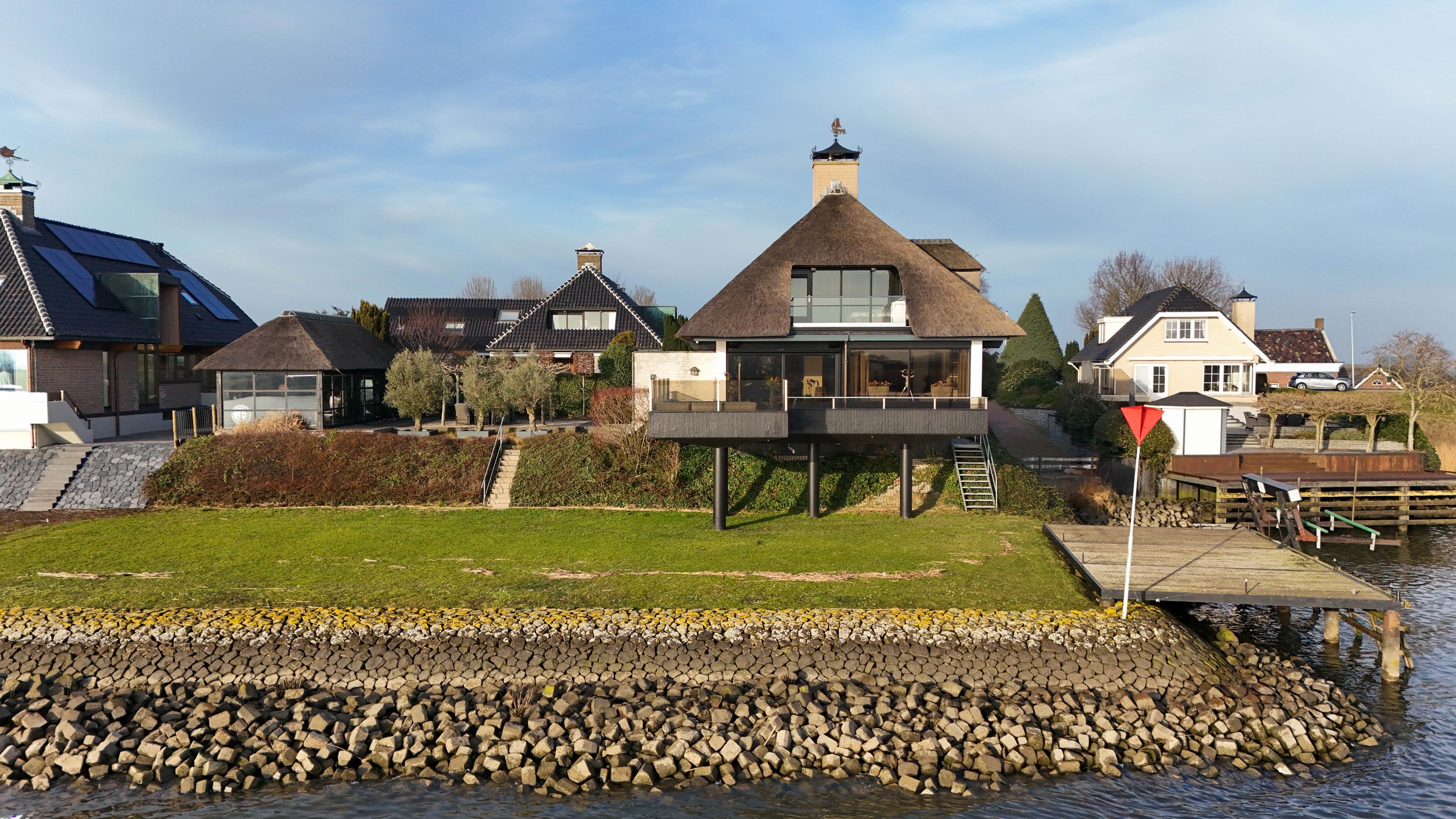 De Werf 5 in Lekkerkerk is a home for people who know what they want. Peace, space, water at your feet and comfort at a high level. This thatched villa is located in a truly rare spot, directly on the river Lek, with its own private jetty and boat lift. Here, you can step straight from your garden onto the boat and sail towards the Biesbosch, Dordrecht or Rotterdam. The view over the water never gets old and changes every moment of the day. This is living with allure, freedom and privacy.