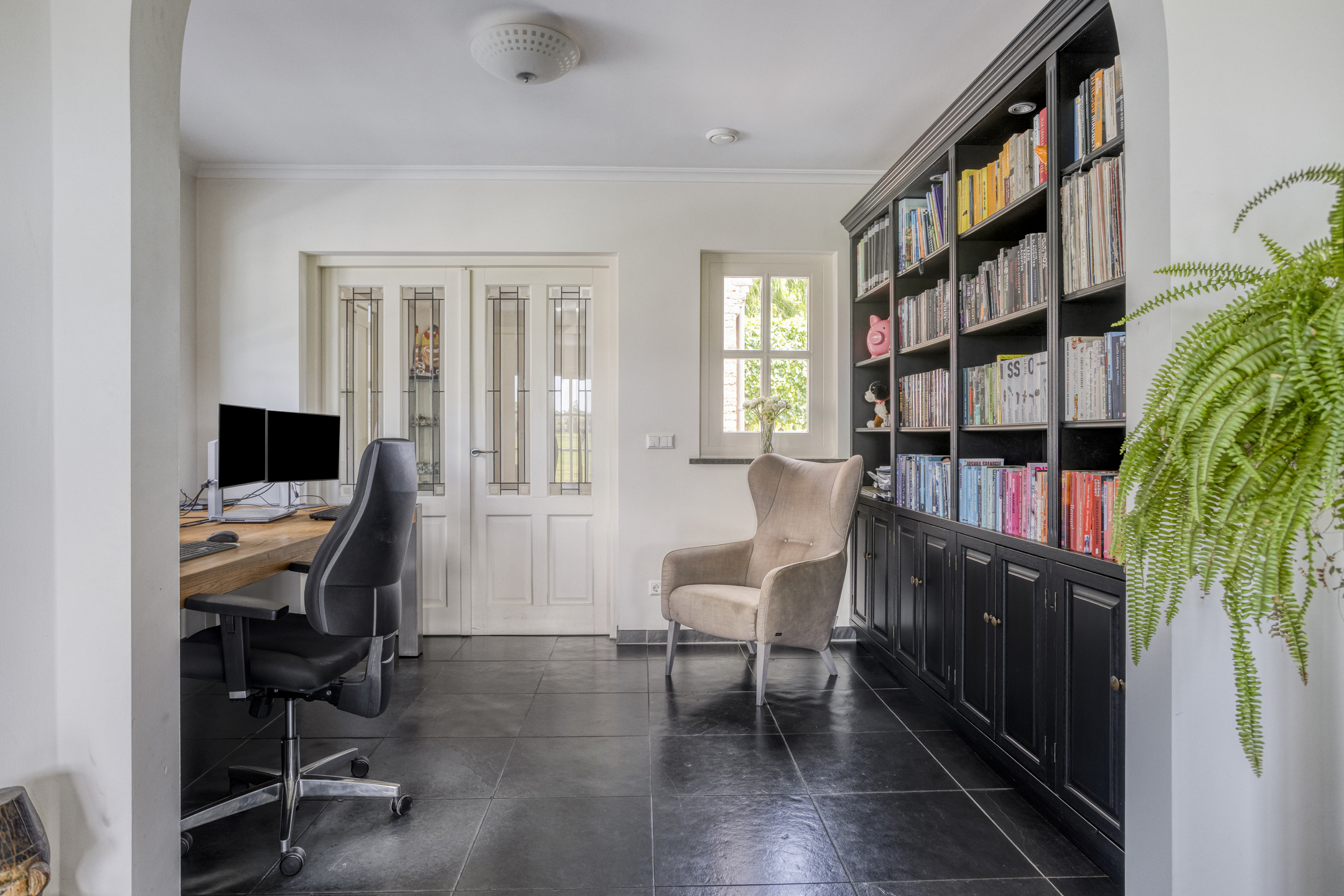 woonkamer (ca. 75 m² incl. keuken en werkhoek) voorzien van een drietal schuifpuien, houthaard en een werk-/leeshoek met inbouwkastenwand, wandafwerking stucwerk, natuurstenen vloer, plafond afgewerkt met stucwerk vv. inbouwspots;