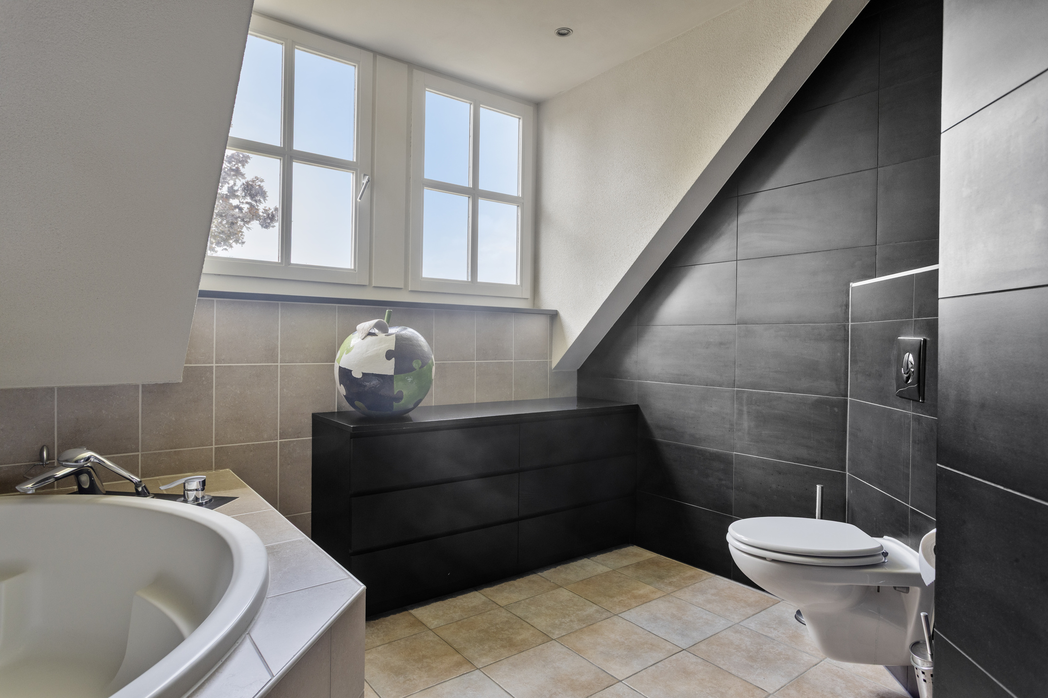 royale badkamer voorzien van een 2-persoonsligbad, inloopdouche, infraroodpaneel, badkamermeubel met dubbele wastafel, elektrische designradiator, dakkapel en vloerverwarming;