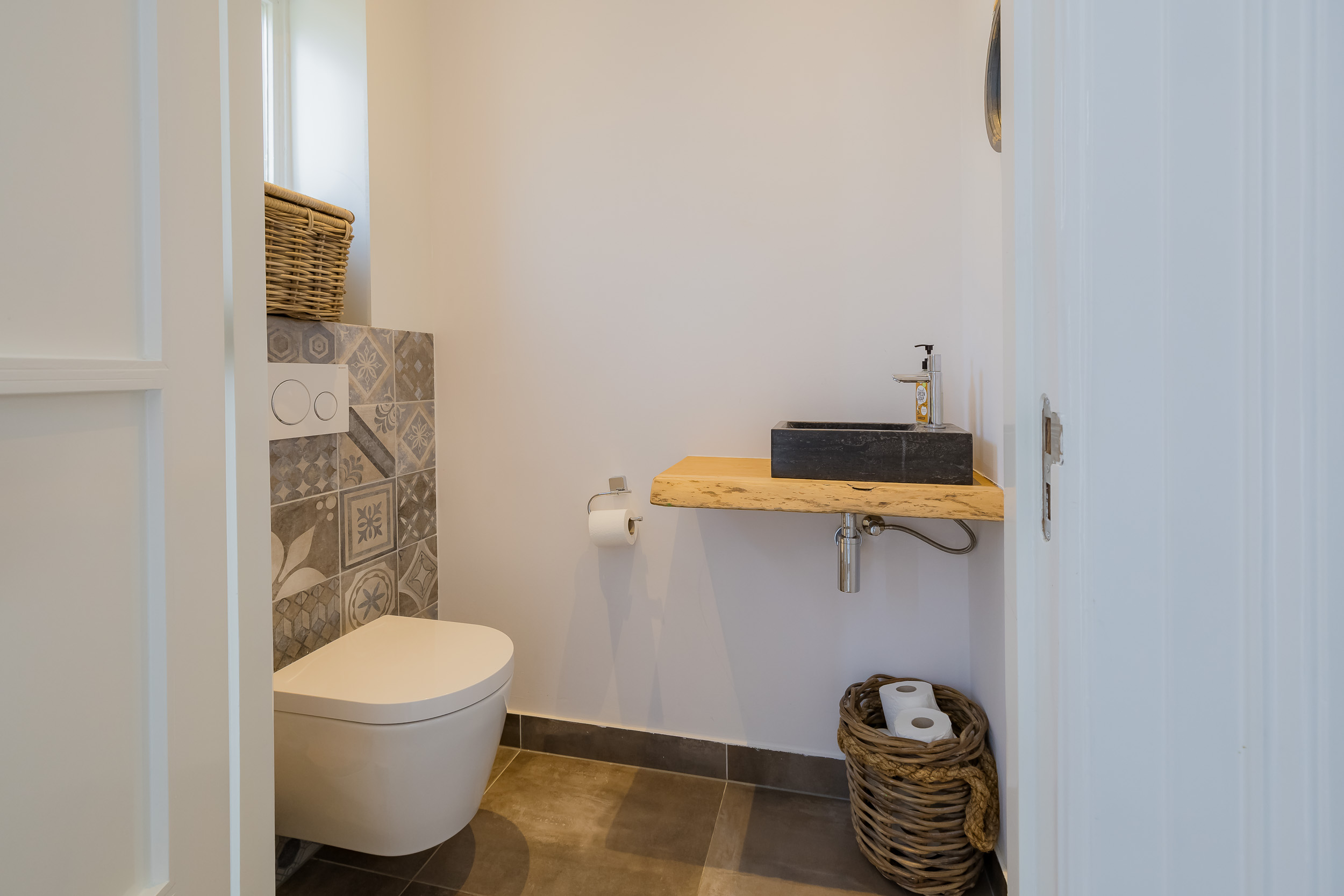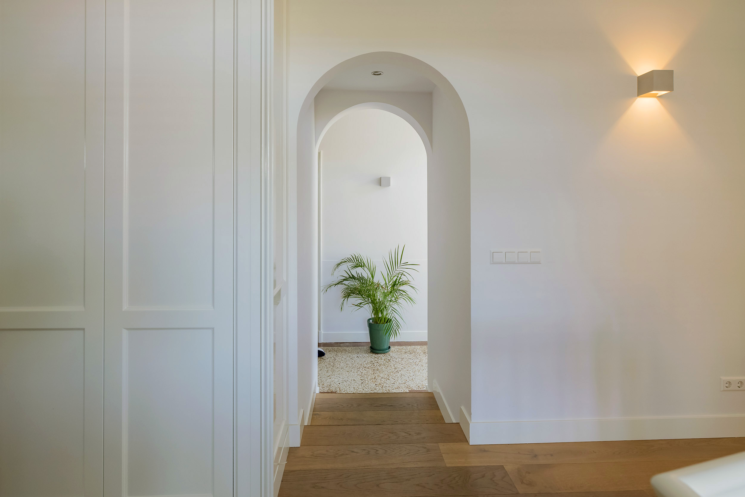 Beautiful porch in which the striking high front door, imposing long hall with the restored authentic granito floor, checkroom and toilet room and a door to the garden. To the left of the hall a very spacious living/living kitchen with luxury kitchen design in matte white, beautiful cooking and sink island with wooden breakfast bar and all appliances including a beautiful wine refrigerator. Also a cozy gas fireplace and the large rear facade with lots of glass and French doors to the garden are not lacking. To the right of the hall there is a TV/sitting room with a gas fireplace and double doors give access to the upstairs room. This upstairs room with a large custom-made closet wall is very suitable as a play/or work room and has a staircase to the large dry cellar with standing height. In the former cell complex is a beautiful study created, a storage room, a technical room and there is one cell preserved in its original state. The indoor garage is large and includes an electric segment door with wicket door and a fixed staircase to spacious storage attic.