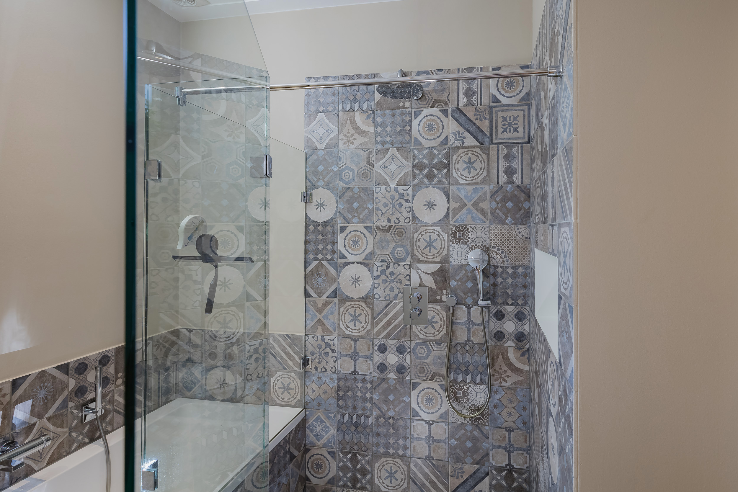 The master bedroom covers the entire floor and features a walled balcony/loggia facing west, walk-in wardrobe and a luxury bathroom with bathtub, walk-in shower, 3rd toilet and wide sink with two taps on wooden furniture.
