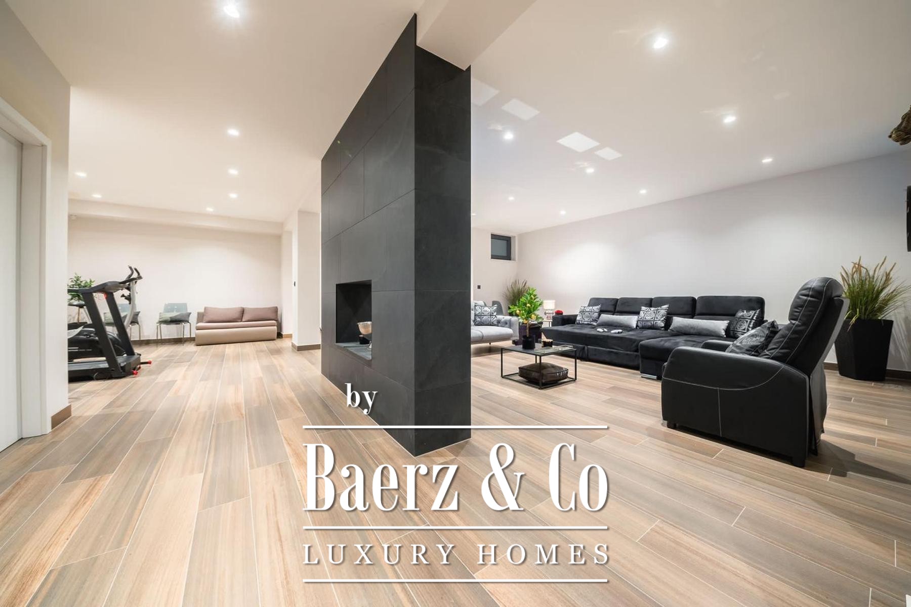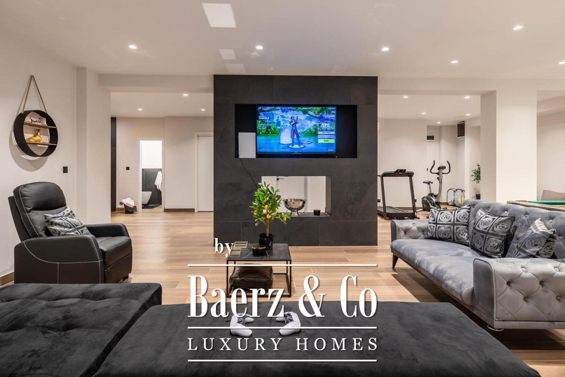 The architecture unfolds over three levels. The basement is dedicated to leisure, featuring fitness equipment, a billiard table, a generous sofa and television, a sauna with shower, a separate toilet, and storage. The ground floor welcomes with an open kitchen, dining, and living area, complemented by a bathroom and a guest bedroom. Upstairs, three bedrooms each enjoy private en-suite bathrooms and access to a dedicated laundry space, allowing for privacy and ease.