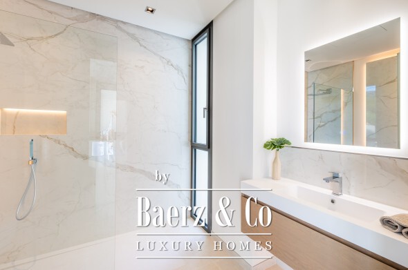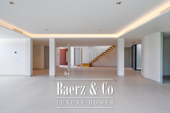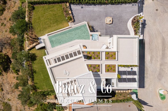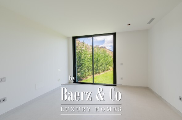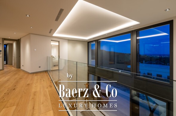 Outdoor living is integral here. Two distinct gardens, a saltwater infinity pool, and a jacuzzi offer seamless transitions between indoor elegance and the lush outdoors. The solarium, designed with a small garden, provides 360º views over the sea, golf course, and mountains. With the possibility of an elevator from basement to solarium, every level is accessible and inviting.
