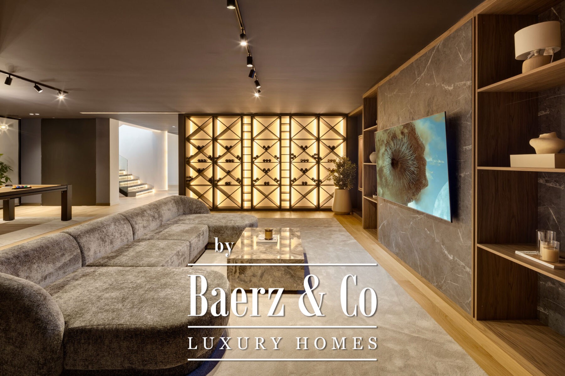 The villa’s interior is distinguished by high-grade oak flooring, large-format porcelain tiles, and state-of-the-art appliances from Gaggenau and Siemens. Leisure pursuits are indulged through a private heated swimming pool, a dedicated cinema room, and a gym. The garage meets modern needs, and the property is offered fully furnished in a contemporary style, with furniture available separately at €250,000.