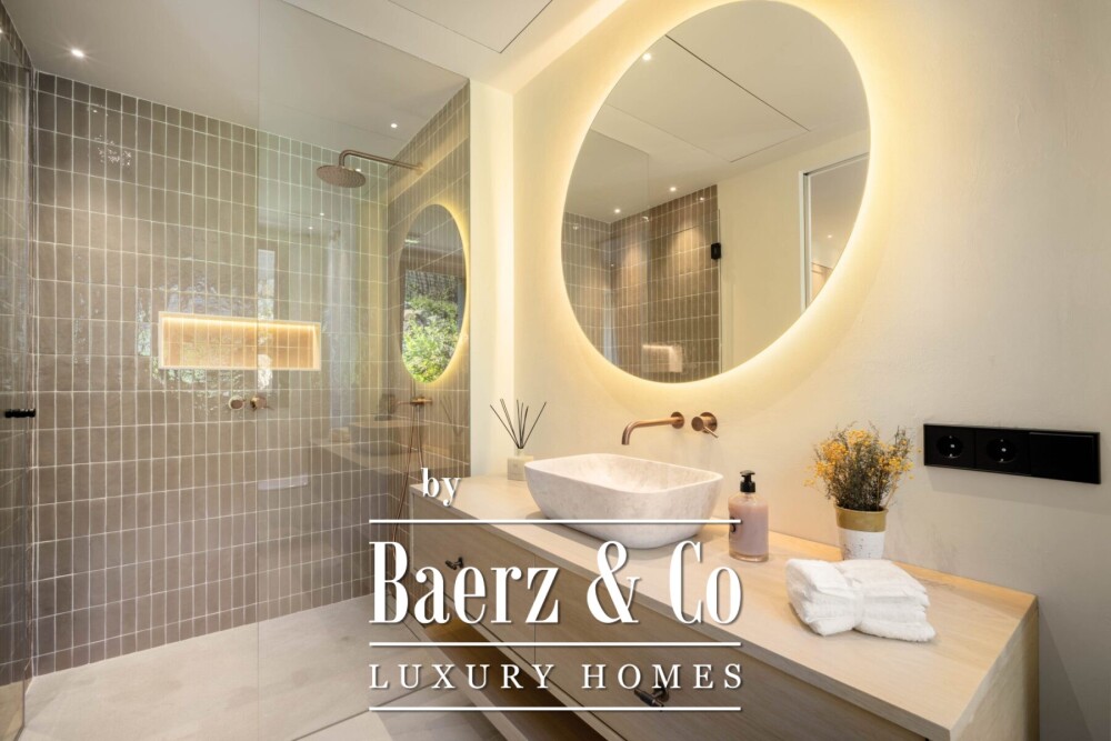 Villa Marbella with Sea and Mountain Views sits quietly in Nueva Andalucía, minutes from Los Naranjos Golf Course and close to Marbella’s celebrated beaches and dining. This fully renovated single-level villa, with 241 m² of living space and set on an 855 m² elevated plot, captures the essence of Mediterranean life. The main living area is defined by its open-plan design, vaulted ceilings, and a palette of soothing natural tones. Light moves freely throughout, courtesy of floor-to-ceiling glass doors that lead to a generous terrace, where an infinity-edge pool appears suspended above the valley. From both inside and the rooftop terrace, expansive views reach across the valley to meet the sea.