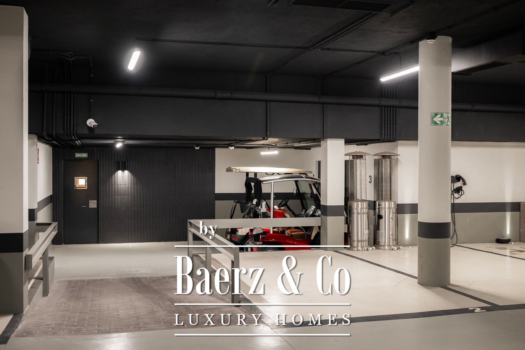 Arriving through a central hall, the apartment’s layout divides efficiently between social and private zones. The open-plan living area flows into a kitchen appointed with Gaggenau and Miele appliances, a striking floor-to-ceiling wine display, and fully automated glazing that merges indoor living with the terrace. In the private wing, the master suite features a walk-in wardrobe and full bathroom, accompanied by two further en-suite bedrooms facing the tranquil gardens. Additional amenities include a laundry room, smart home systems, premium materials throughout, and two garage spaces with a registered electric buggy and storage room.