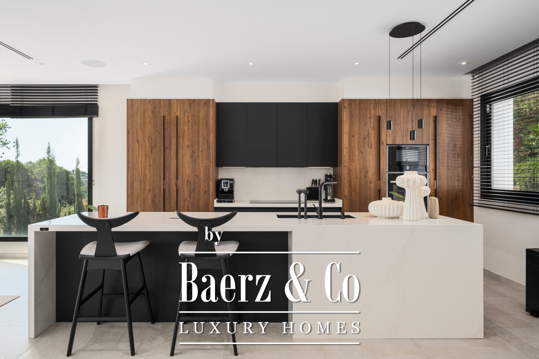 The residence’s architecture balances contemporary clarity with warmth, employing ceramic stone and wood finishes to create a poised atmosphere. Miele appliances, solar panels, electric blinds, and an advanced irrigation system speak to its sustainable detailing. Terraces open from all bedrooms and main spaces, leading to a covered swimming pool, outdoor barbecue area, and sauna, while panoramic golf course and Mediterranean Sea views act as a constant aesthetic backdrop.