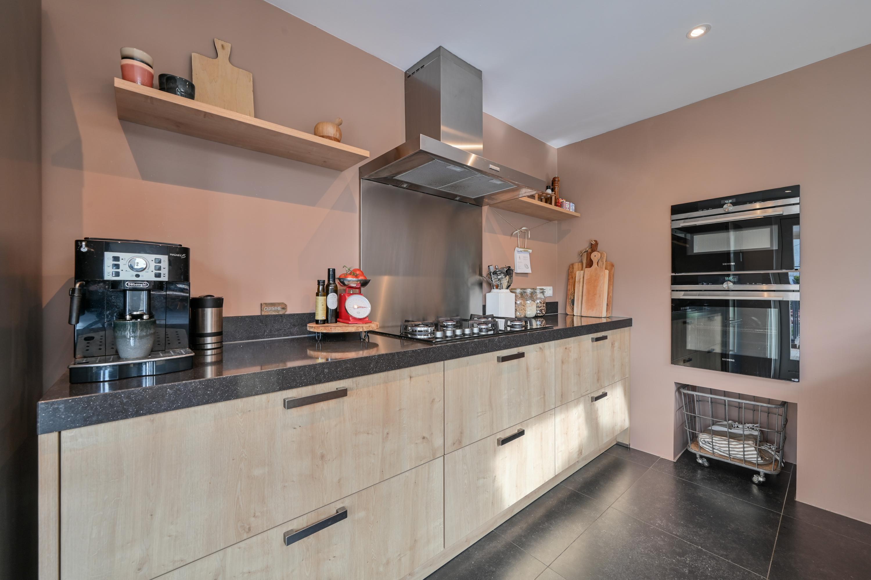 The living room has a cozy L-shaped layout. At the front, a large window provides pleasant natural light and an open connection to the quiet street. The seating area with fireplace forms the warm heart of the home — a place to truly unwind. On the side, a large window offers unique views over the meadows, beautifully blending indoor and outdoor living. The wooden flooring enhances the calm and timeless atmosphere.