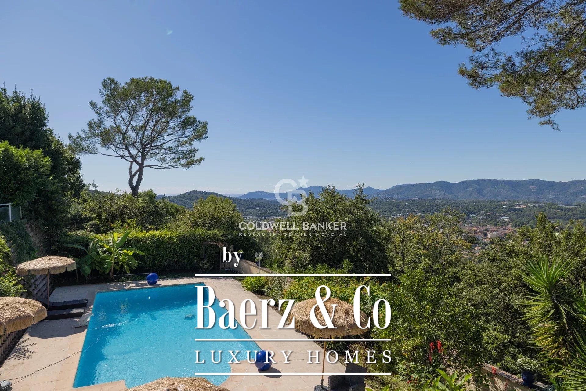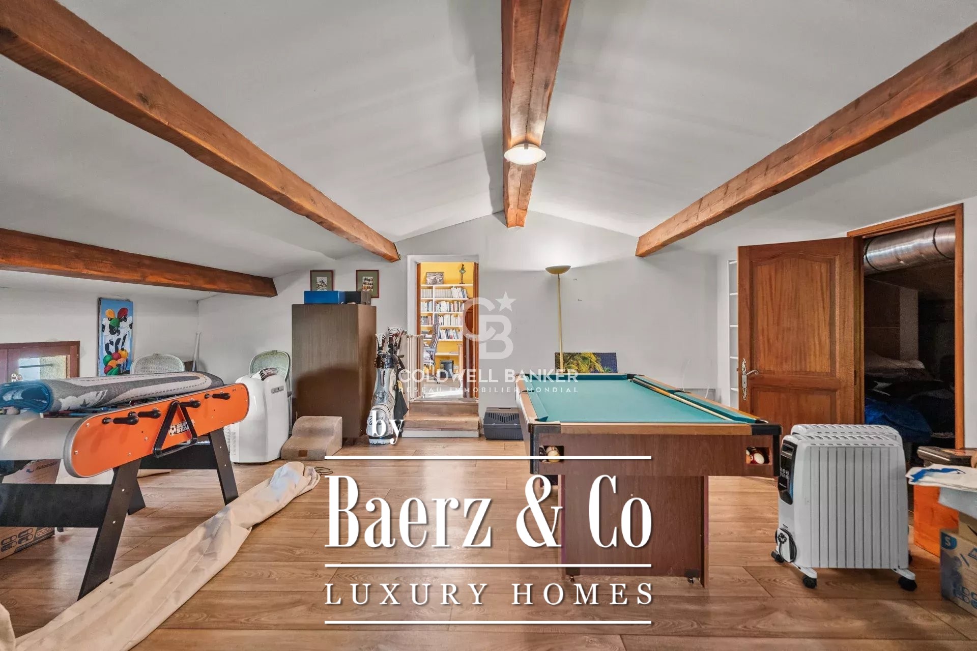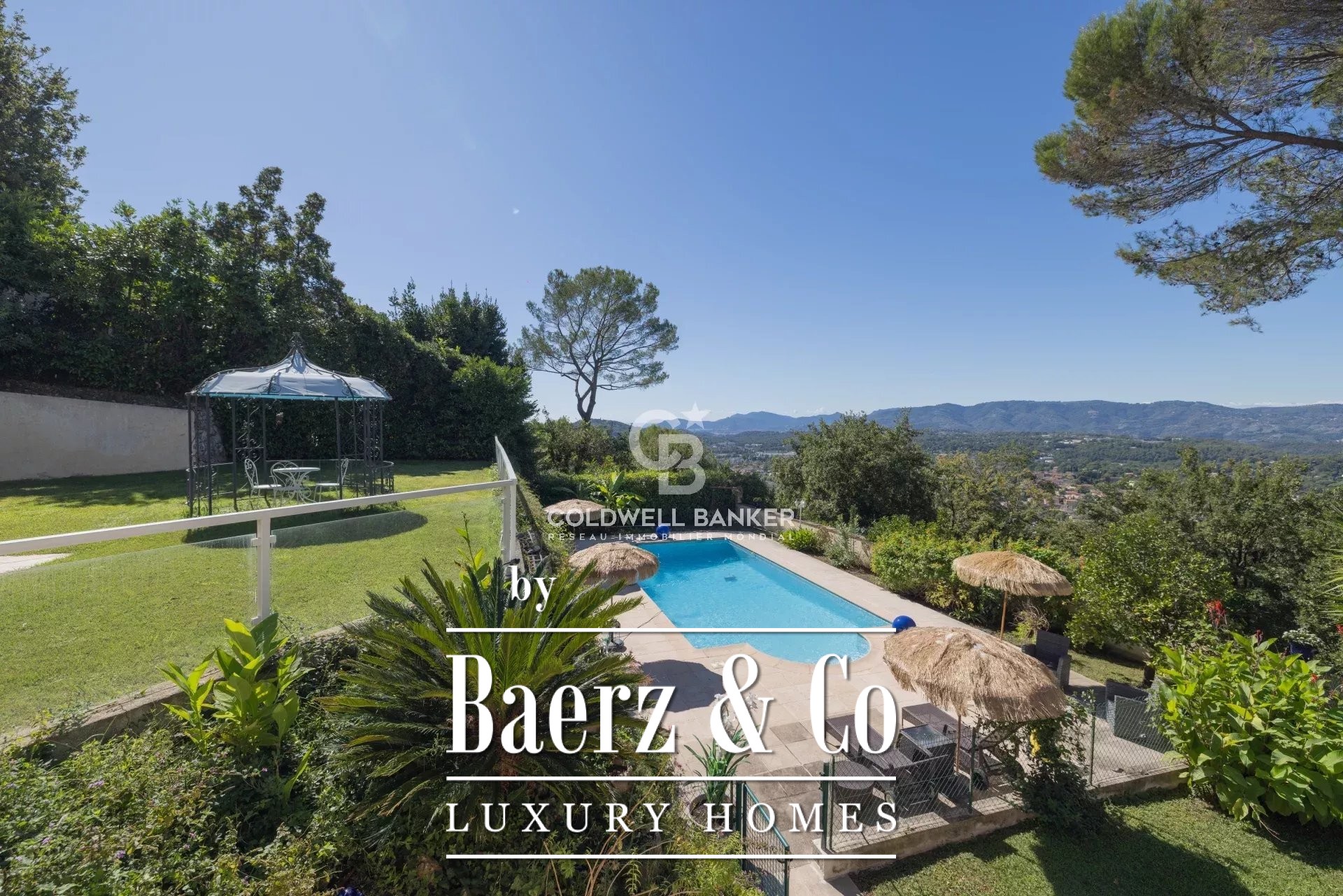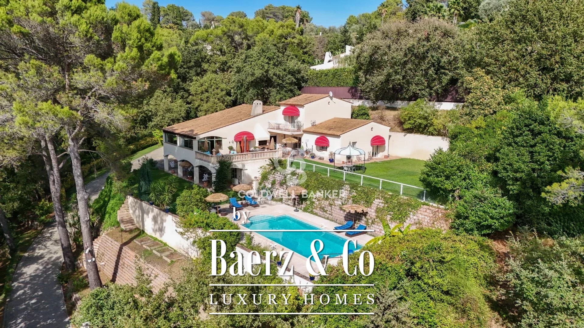 Wide terraces spill out into the landscaped garden, anchored by a striking swimming pool. The 370 m² villa also features air-conditioning, a fireplace, double glazing, alarm and electric gate for security, and thoughtful amenities. A carport for four vehicles and a 60 m² enclosed garage, easily adaptable as a guest or caretaker’s residence, provide further autonomy. This luxury villa for sale in Mougins offers an understated sanctuary with sea views and enduring quality.