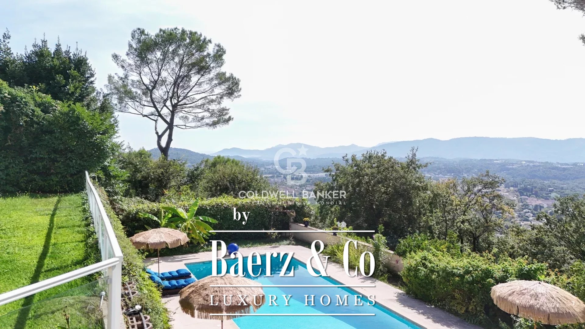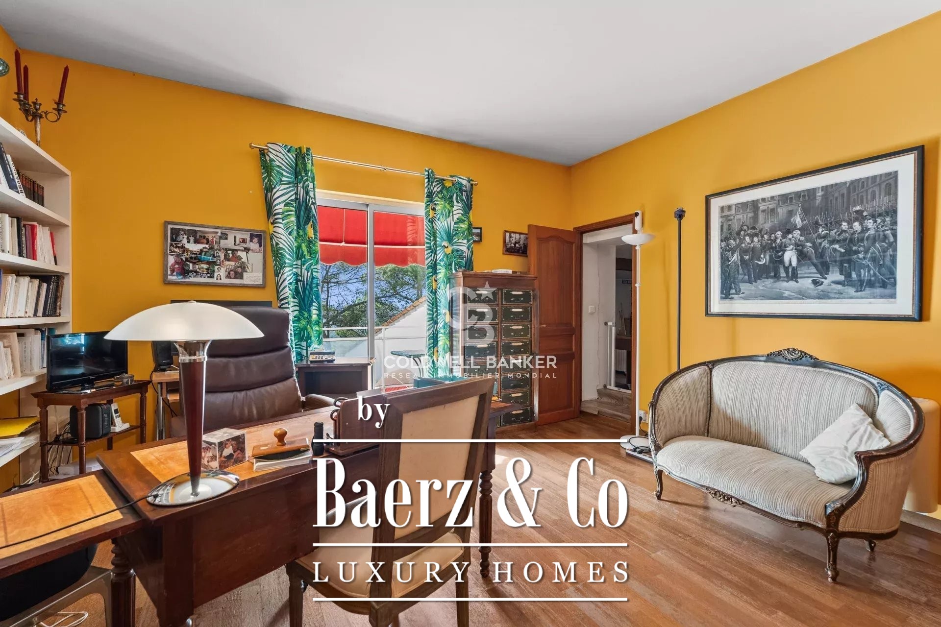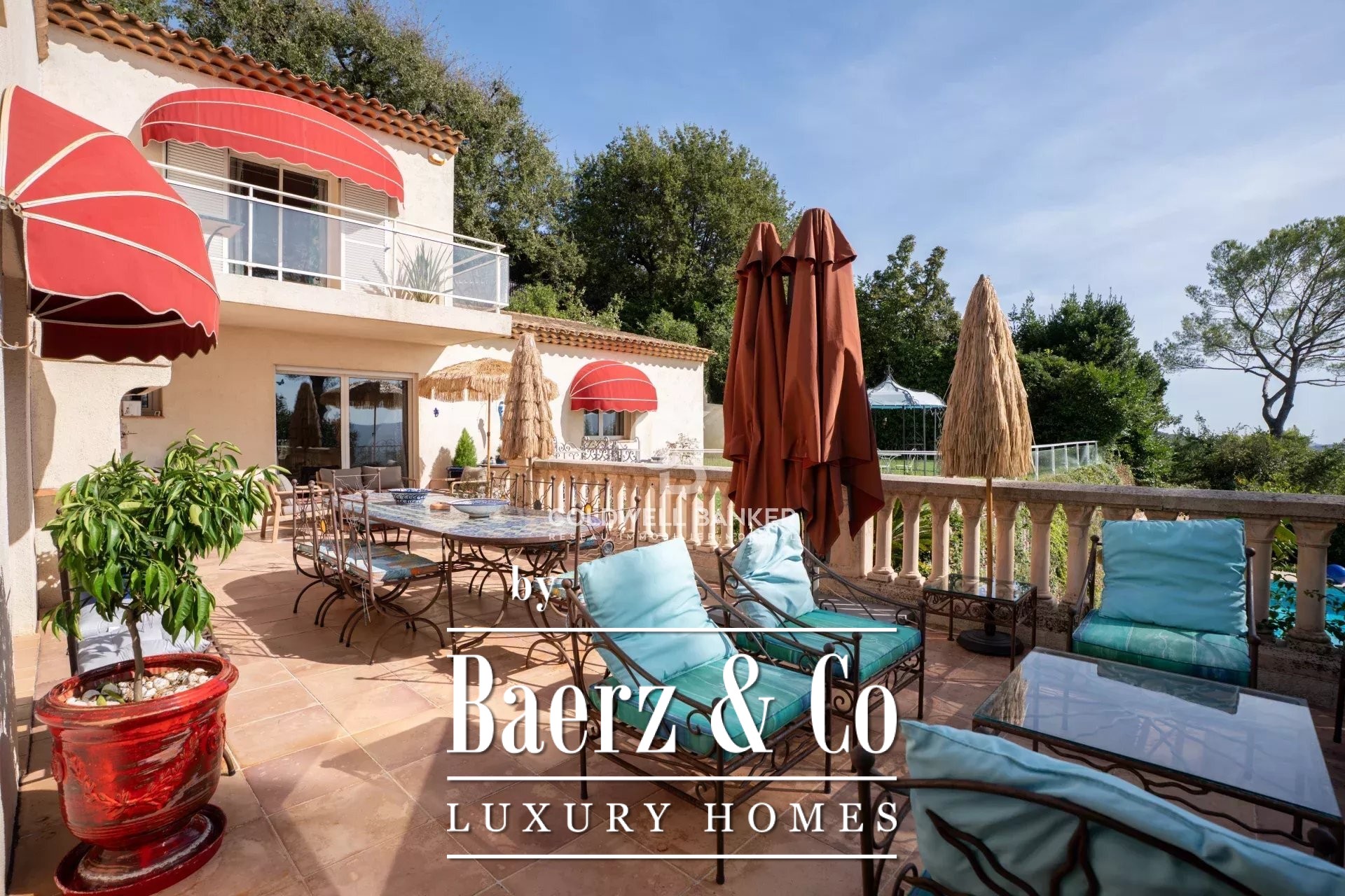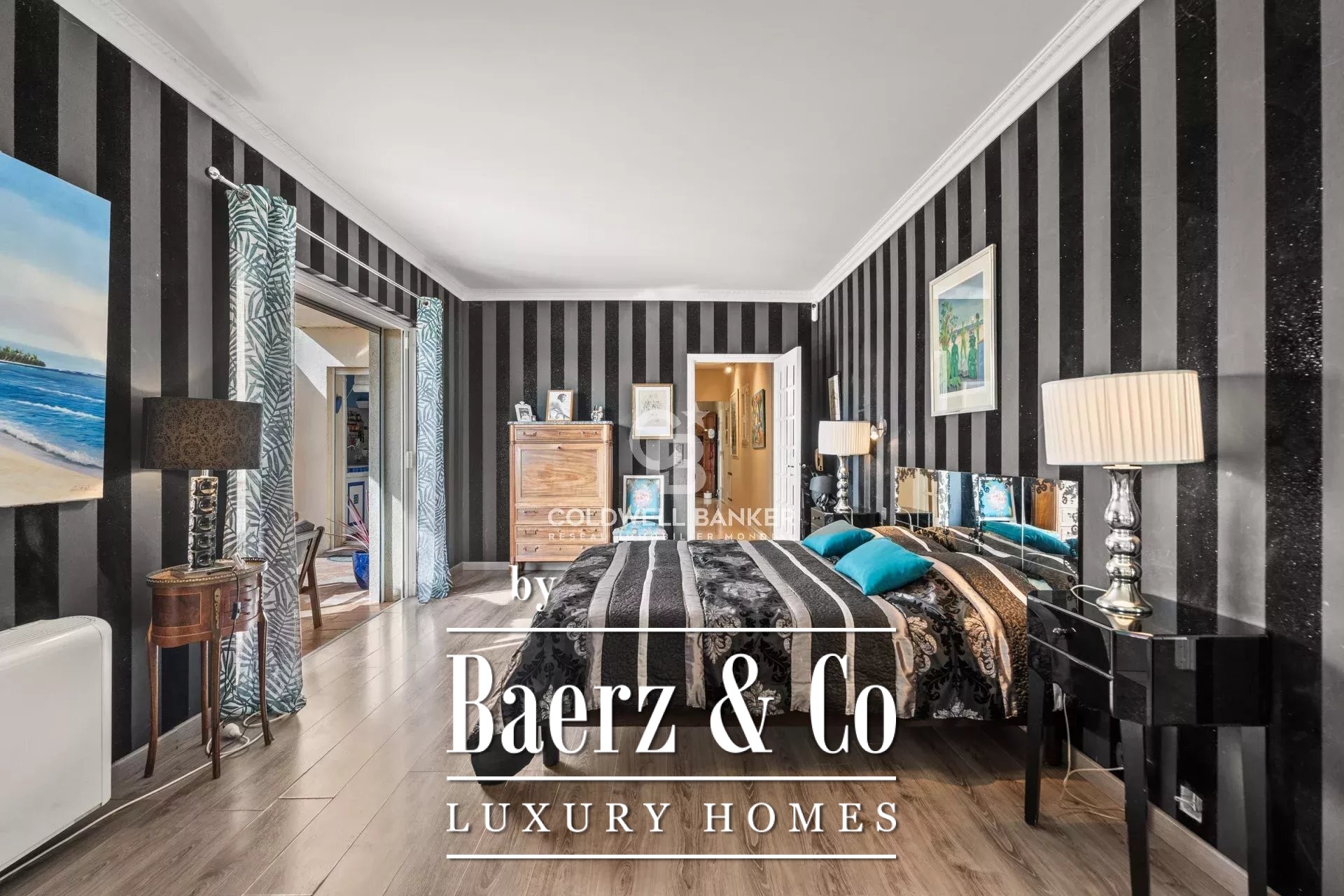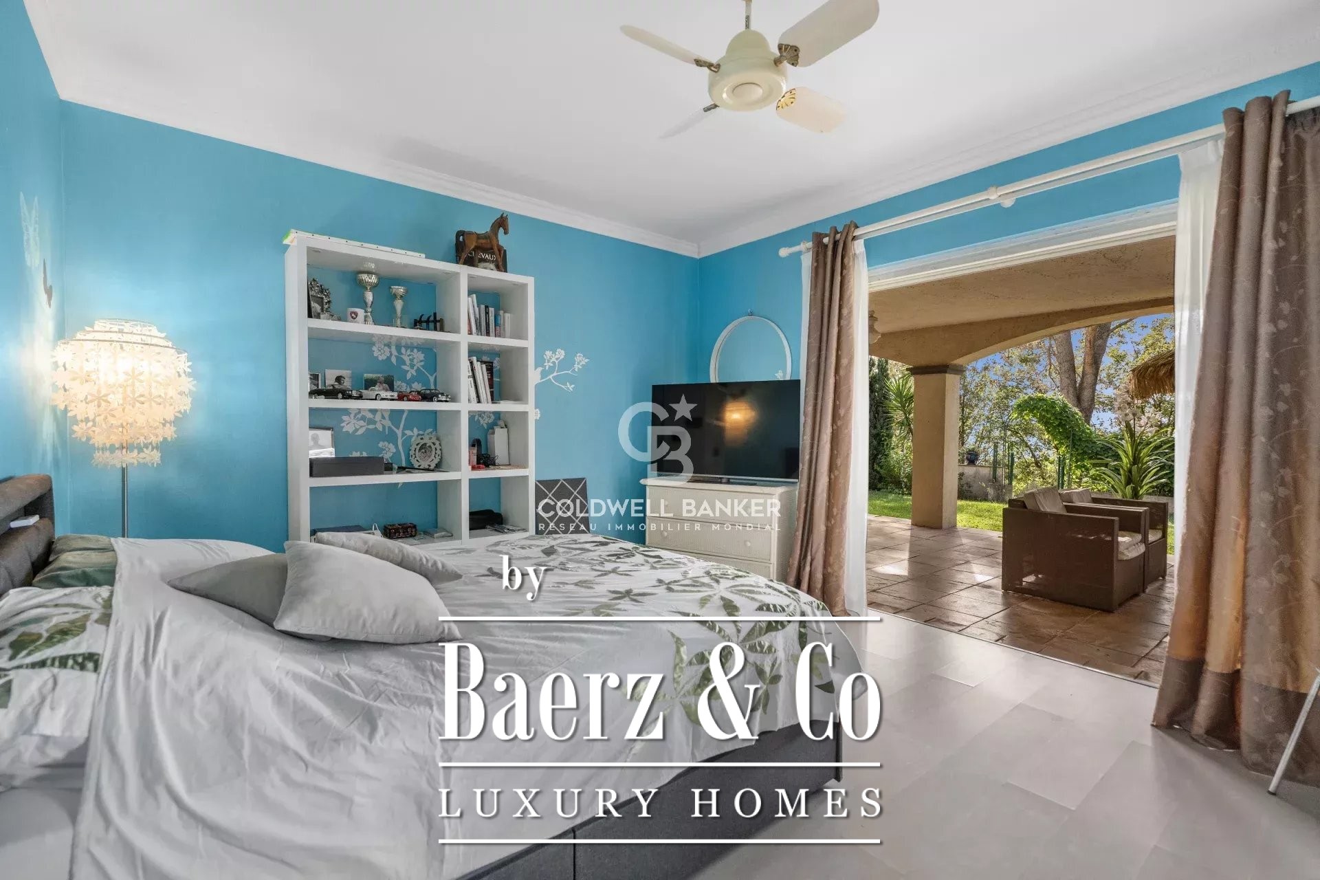 Wide terraces spill out into the landscaped garden, anchored by a striking swimming pool. The 370 m² villa also features air-conditioning, a fireplace, double glazing, alarm and electric gate for security, and thoughtful amenities. A carport for four vehicles and a 60 m² enclosed garage, easily adaptable as a guest or caretaker’s residence, provide further autonomy. This luxury villa for sale in Mougins offers an understated sanctuary with sea views and enduring quality.