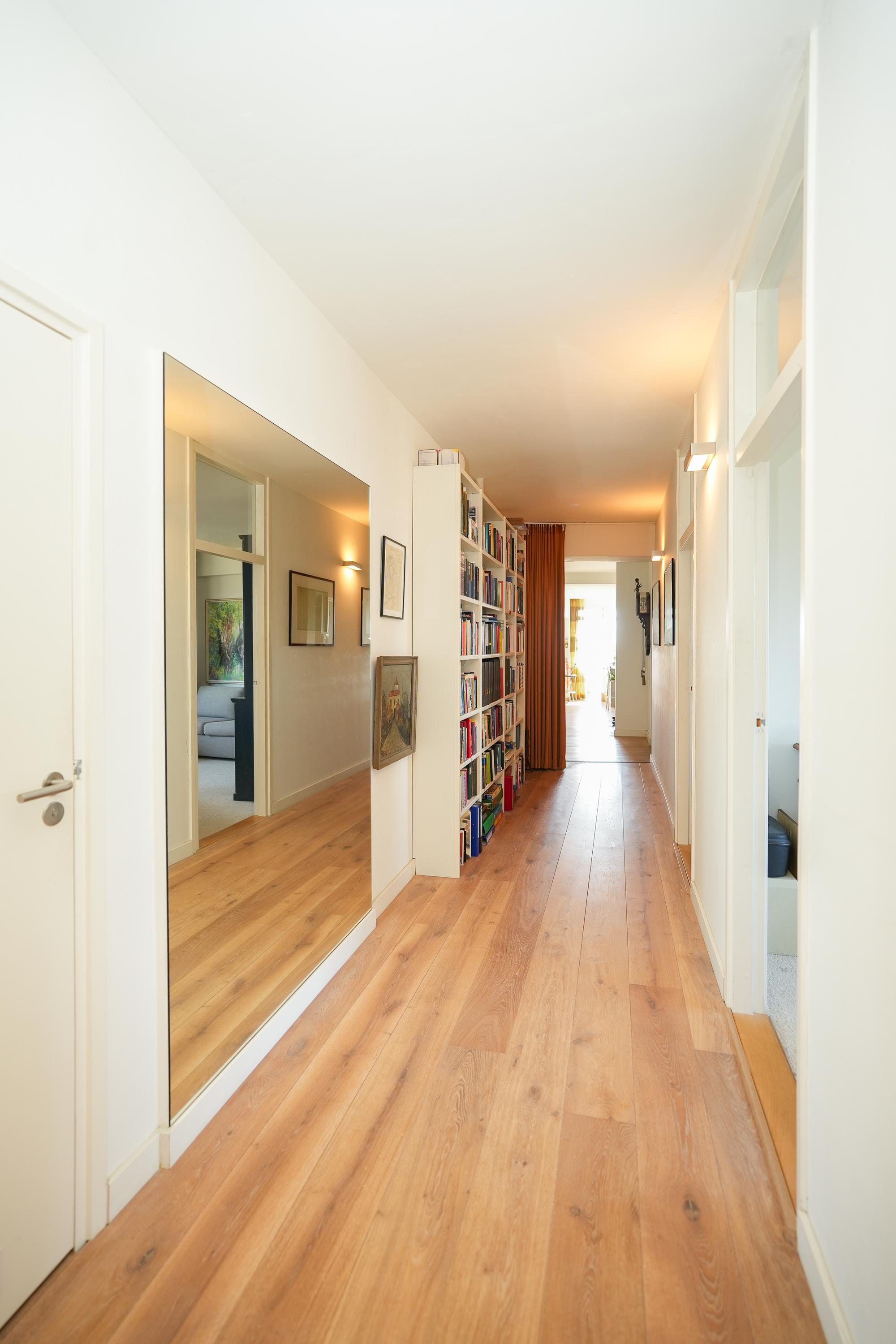 The apartment was created in 2009 by combining two separate units (numbers 44 and 46), resulting in an exceptionally spacious and well-organised home with a clear separation between the living area (44) and the sleeping wing (46). During this process, the apartment was fully and high-quality renovated. A solid oak floor in the living room and hallway, combined with clean finishes and abundant natural light, creates a warm and luxurious atmosphere. Large windows on all sides provide impressive sightlines and panoramic views over the Waal Bridge, the Ooijpolder and the city. Privacy, comfort and refined finishes come together here in a truly unique living experience.