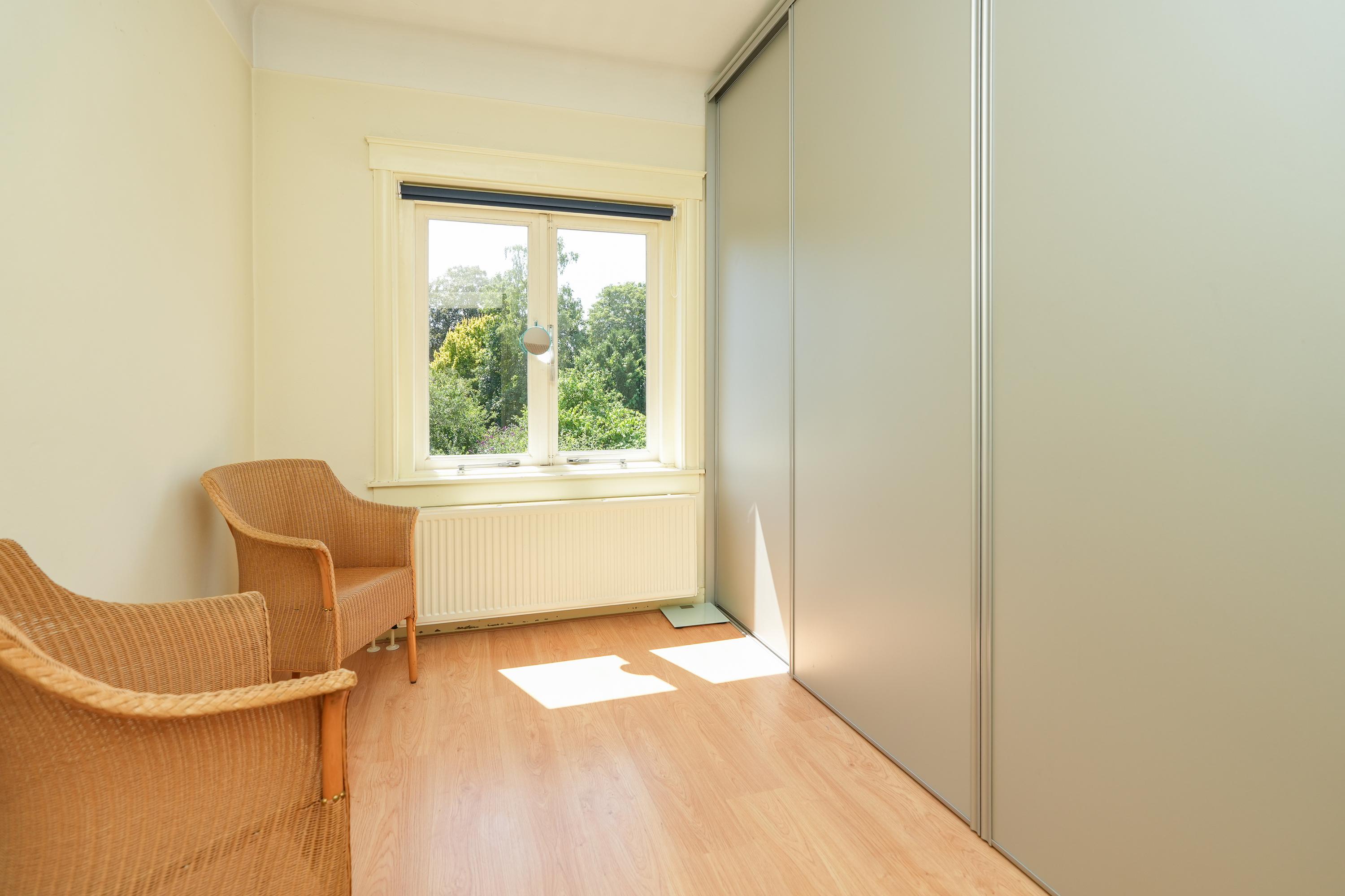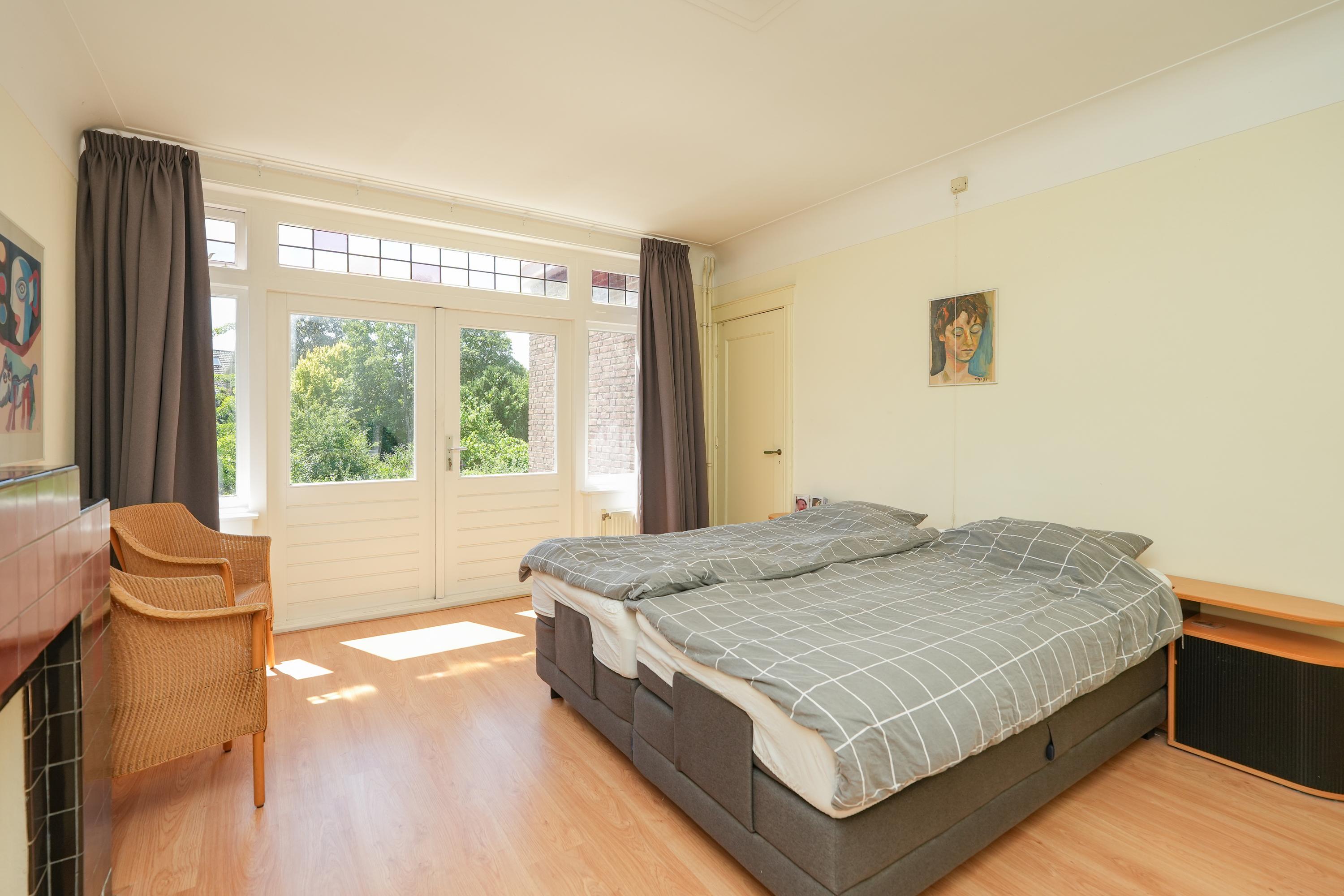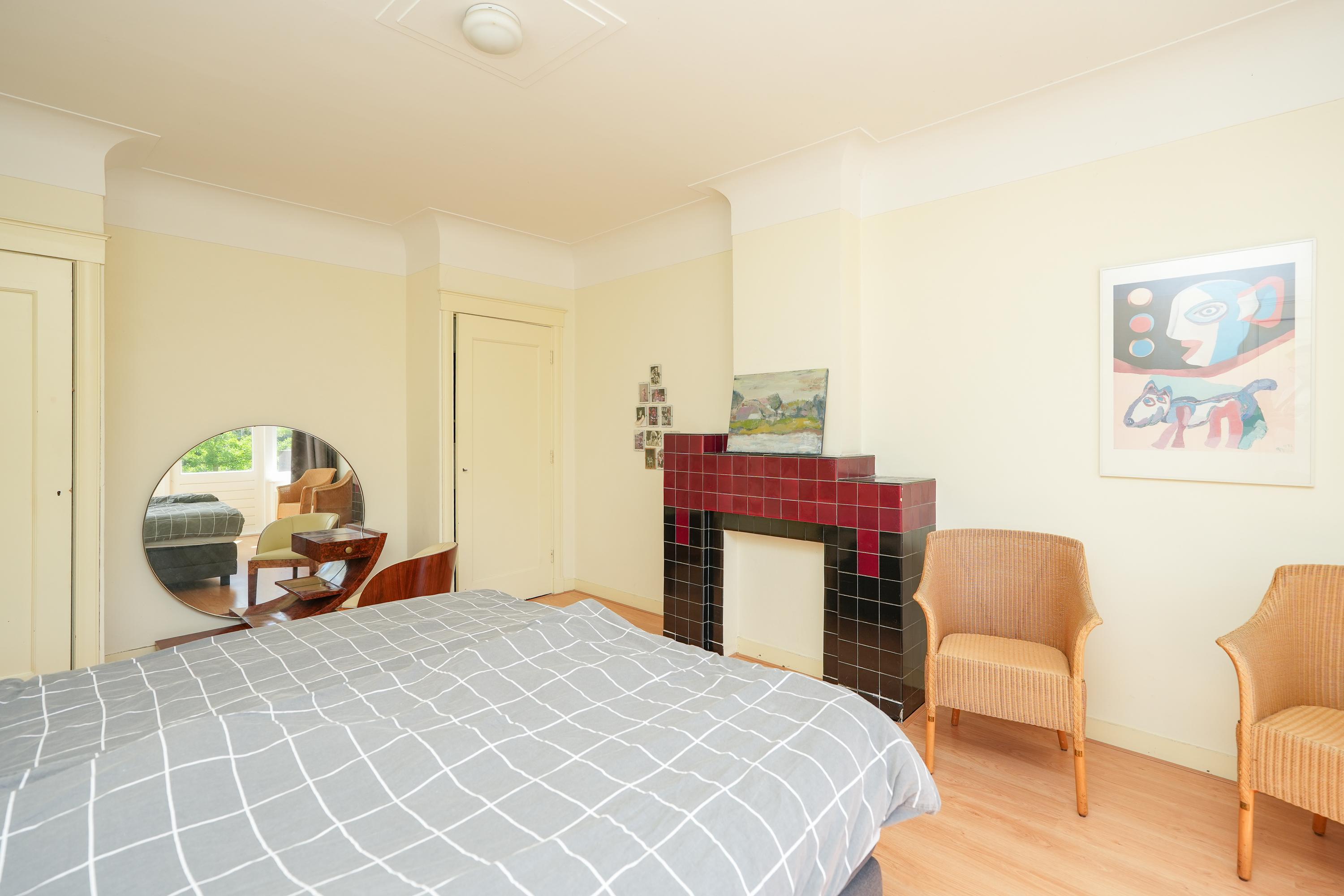 Overloop met bergkast en vaste trap naar de 2e verdieping. Op deze etage bevinden zich drie van de zes slaapkamers. De slaapkamer aan de voorzijde beschikt over vaste kasten en openslaande deuren naar het balkon. De grootste slaapkamer aan de achterzijde is voorzien van vaste kasten, een fraaie schouw en openslaande deuren naar het dakterras, vanwaar je mooi uitkijkt over de groene achtertuin. De derde slaapkamer heeft een praktische kastenwand. De ruime badkamer is uitgerust met een ligbad, een douche en een dubbele wastafel. Daarnaast is er een separaat toilet met fonteintje.