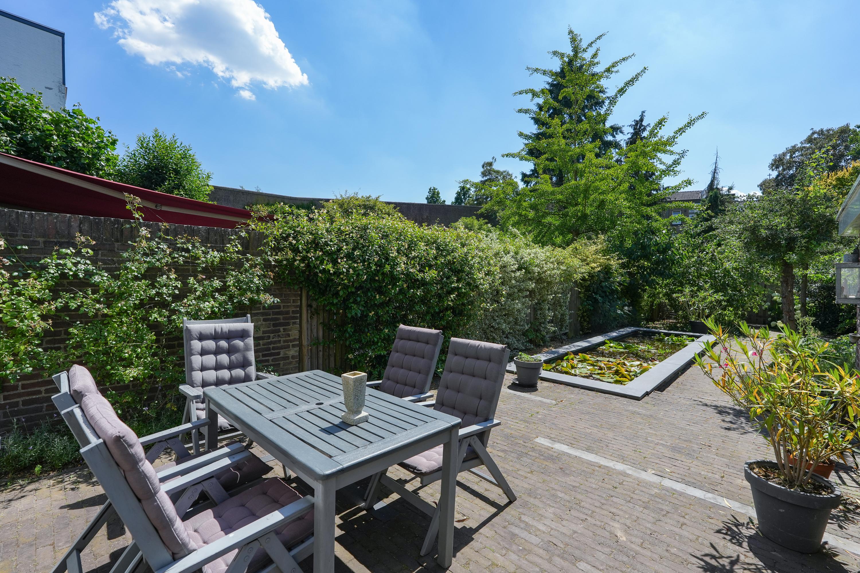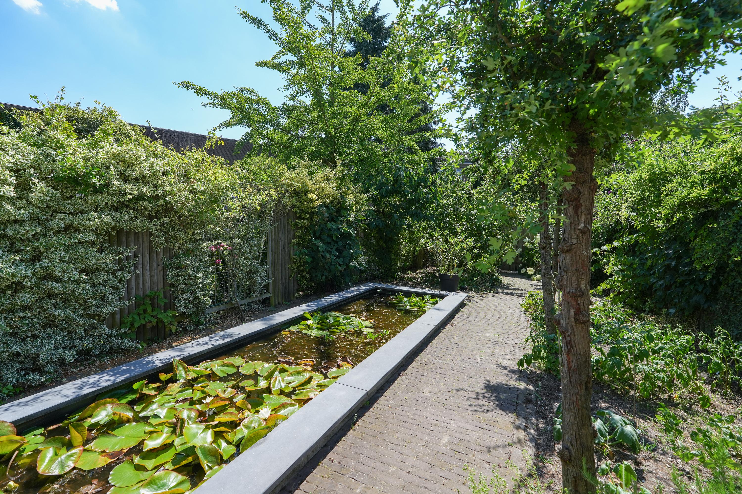 De achtertuin is diep, groen en biedt volop privacy. Dankzij de ligging op het zuidwesten is het een fijne plek om van de zon te genieten. Een moderne, langwerpige vijver voegt een stijlvol element toe aan het geheel. De tuin beschikt verder over een stenen berging en is bereikbaar via een achterom.