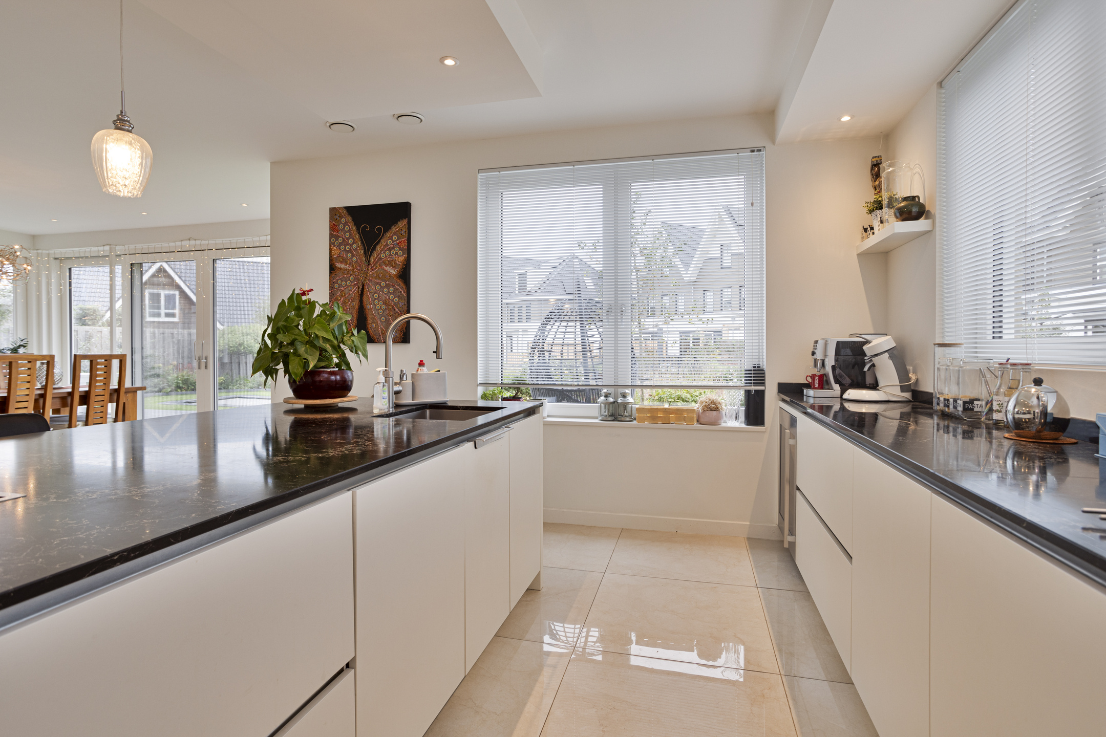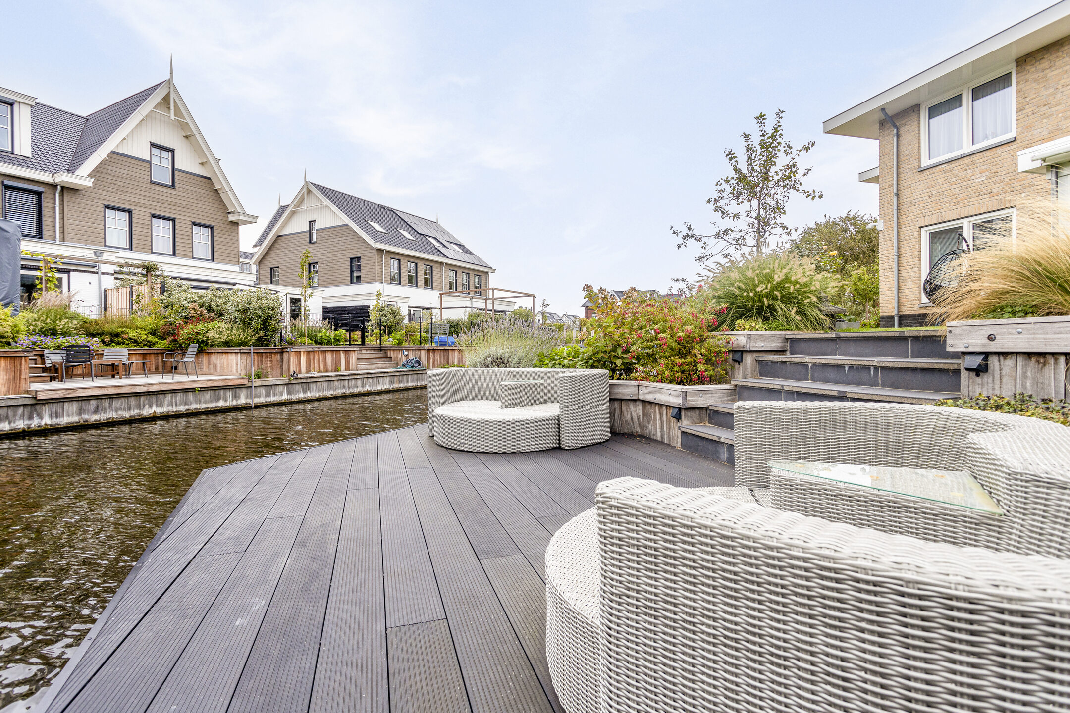 Upstairs, four large bedrooms accompany three elegant bathrooms. The principal suite features an extensive dressing room with crafted storage and a full ensuite. Additional features include a separate laundry, technical room, and a spacious attic. Located near Landskroonpark, with schools, shops, and key amenities easily reached, this luxury villa for sale in Oegstgeest merges a rare waterside setting with true contemporary ease.