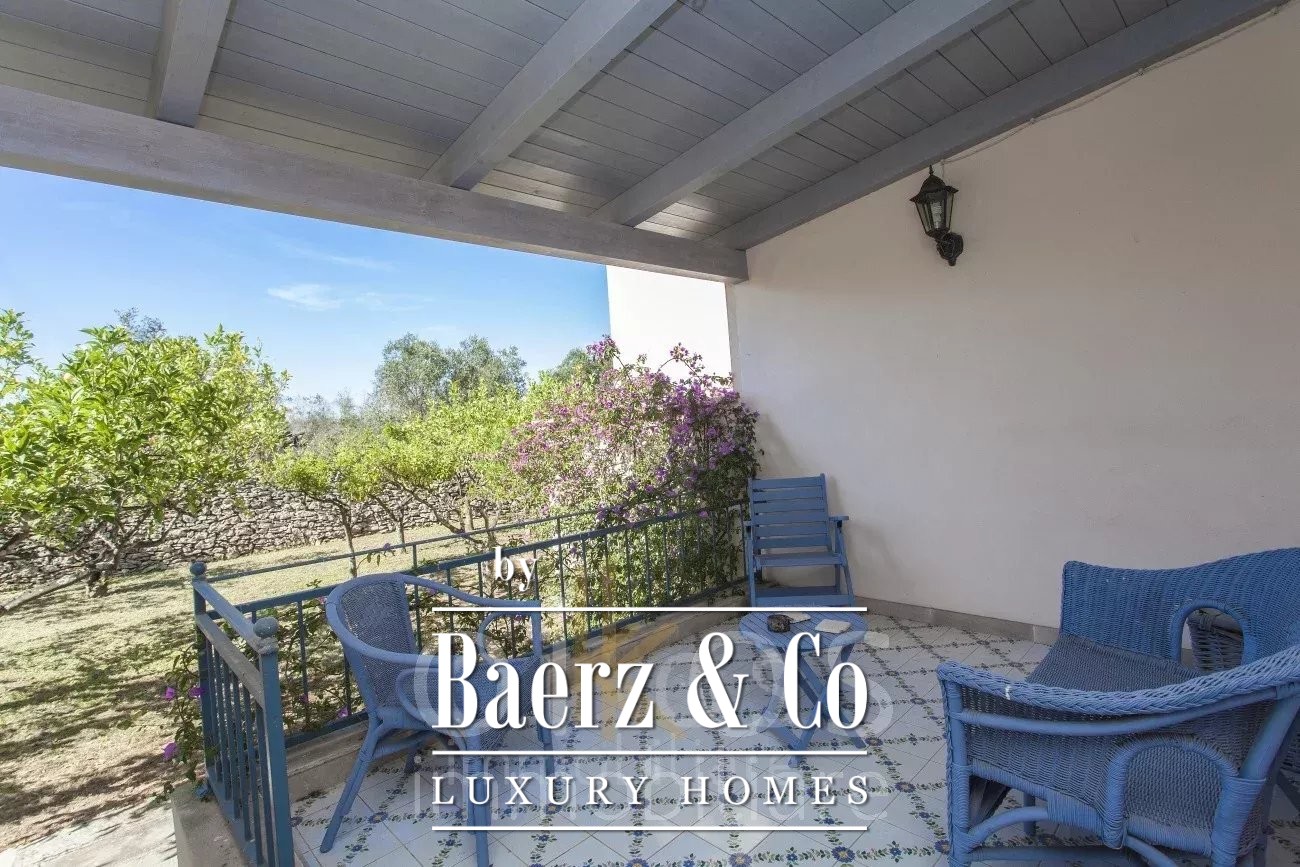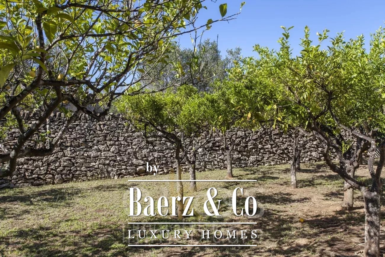 The property is set in an extensive 17,158 square metre garden, fenced for security and privacy, and includes a charming orange grove, all surrounded by traditional dry stone walls.