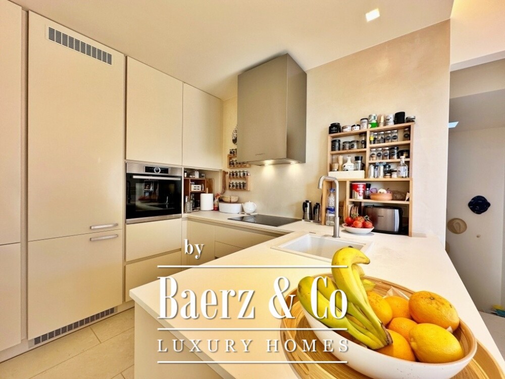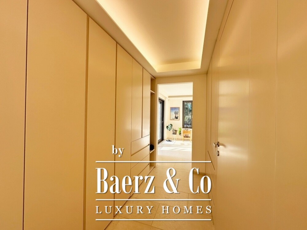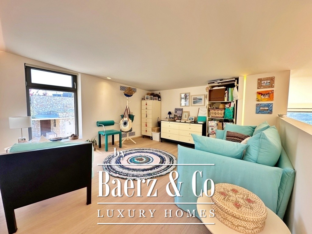 The main house offers 147.36 m², with a living room designed to draw the lush garden and bay views indoors. Large windows frame the shifting light and distant sea, while a fireplace, dining area, and underfloor heating create warmth and rhythm throughout the seasons. The master bedroom includes a dressing area and en-suite bathroom. The attic, extending 40 m², provides two flexible rooms for use as gym and bedroom. In the 138.90 m² basement, find an additional en-suite bedroom, hobby space, storage, and technical utility, all with direct external access.
