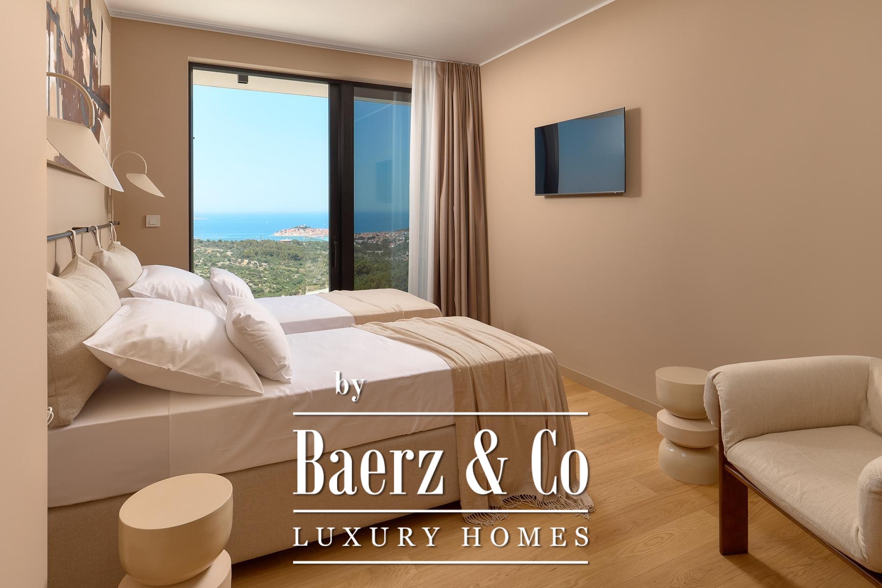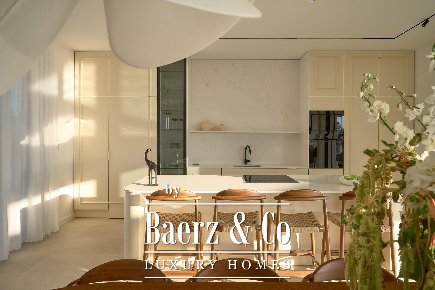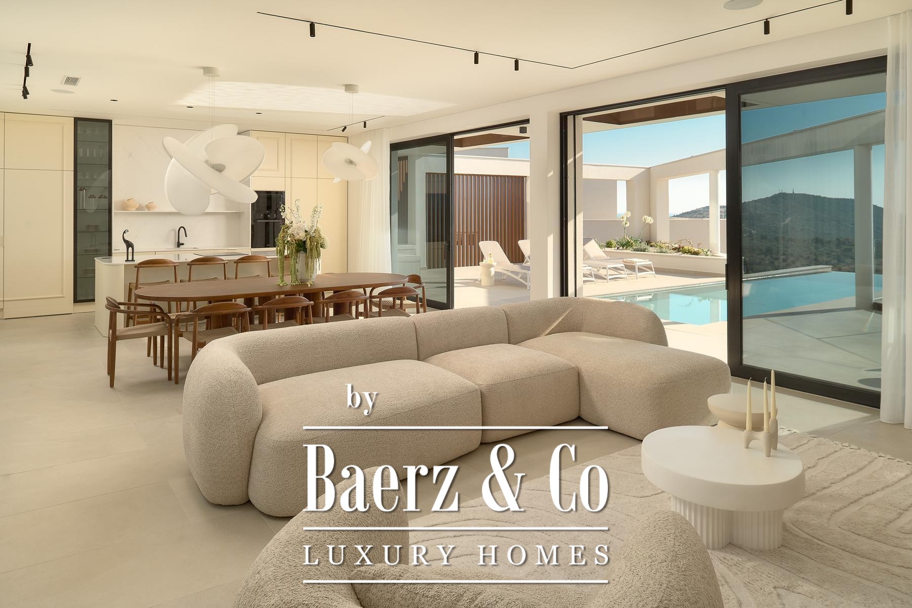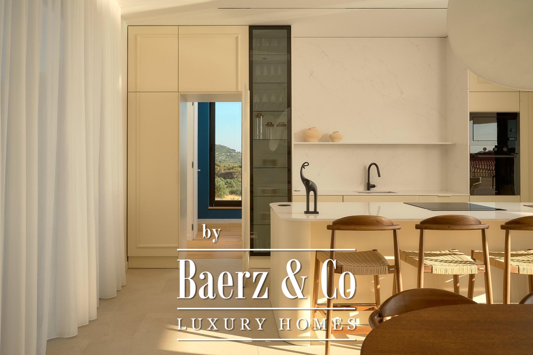 The ground floor welcomes you into a luminous, open-plan living and dining area seamlessly connected to a modern kitchen, enhanced by floor-to-ceiling glass walls that invite natural light and foster a seamless indoor-outdoor flow. Expansive terraces host zones for relaxation and entertaining, including a summer kitchen and barbecue beside the infinity pool and its sunbathing platform.