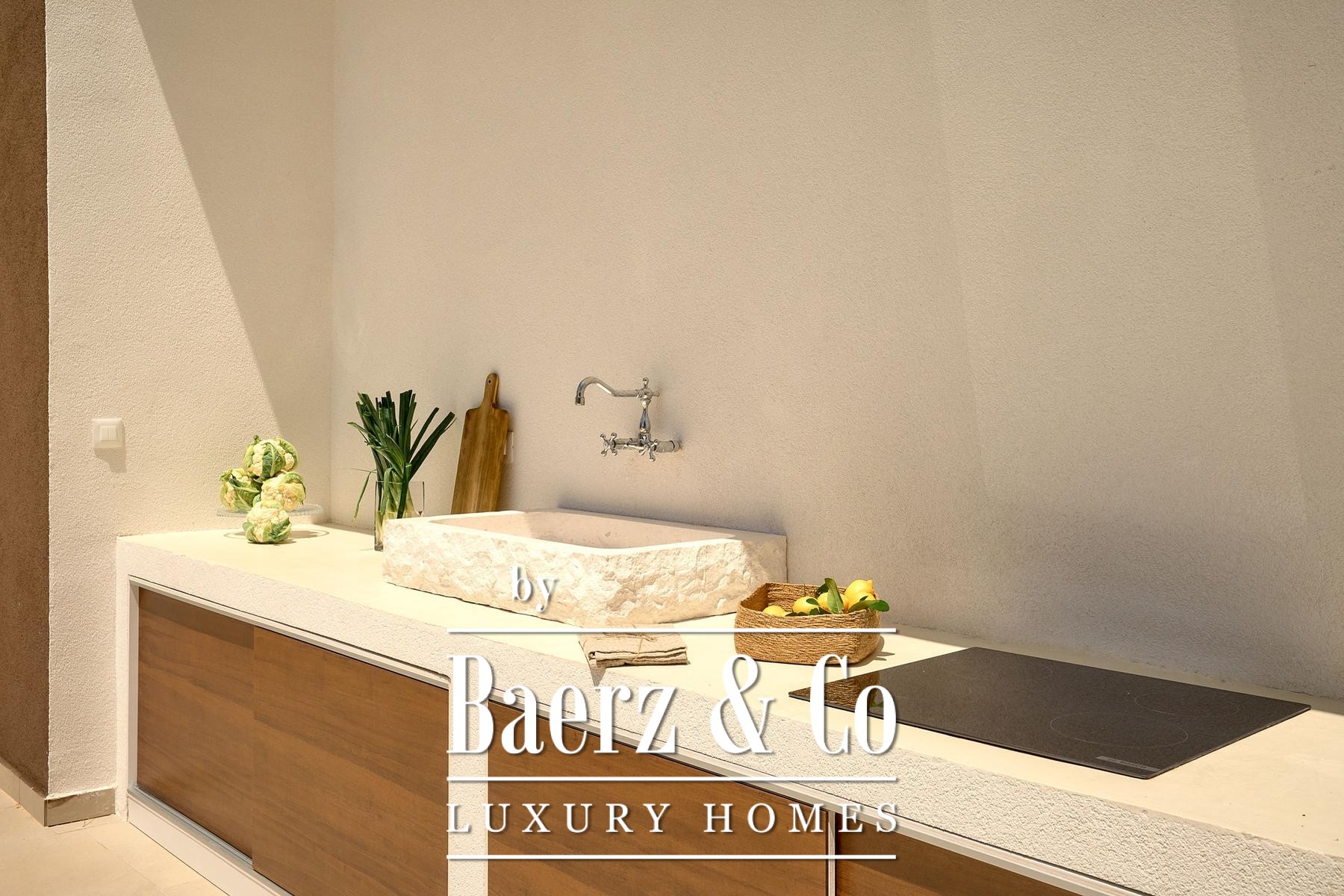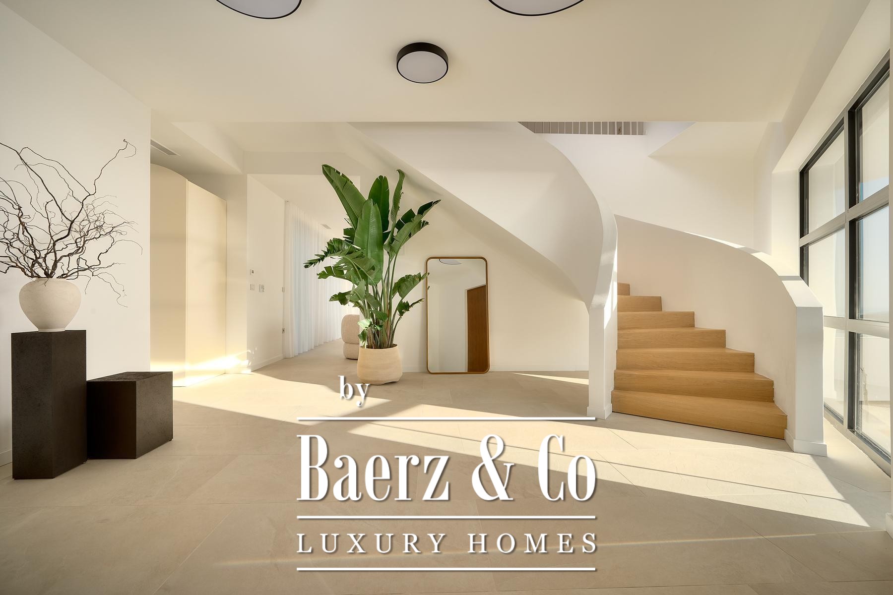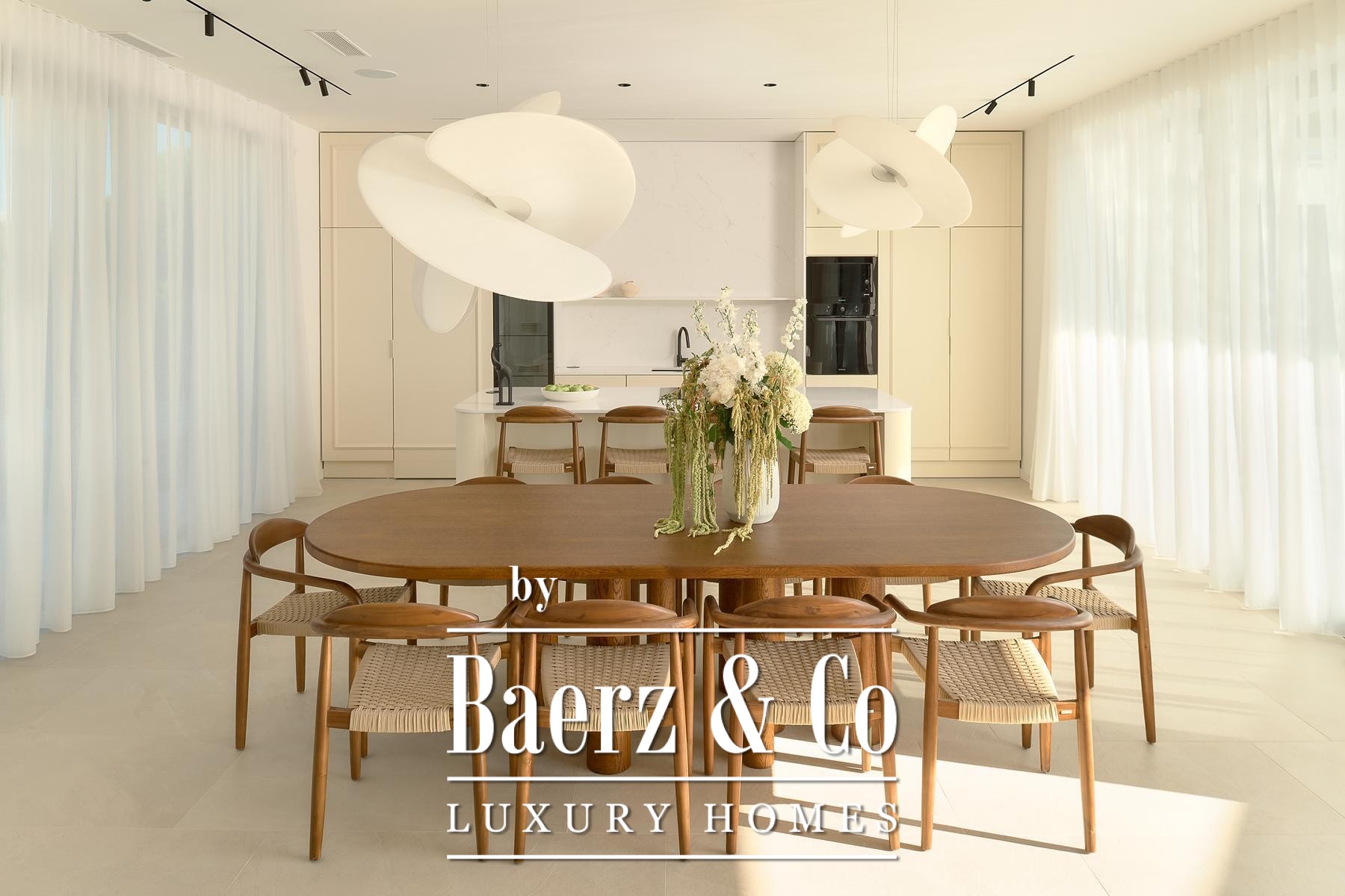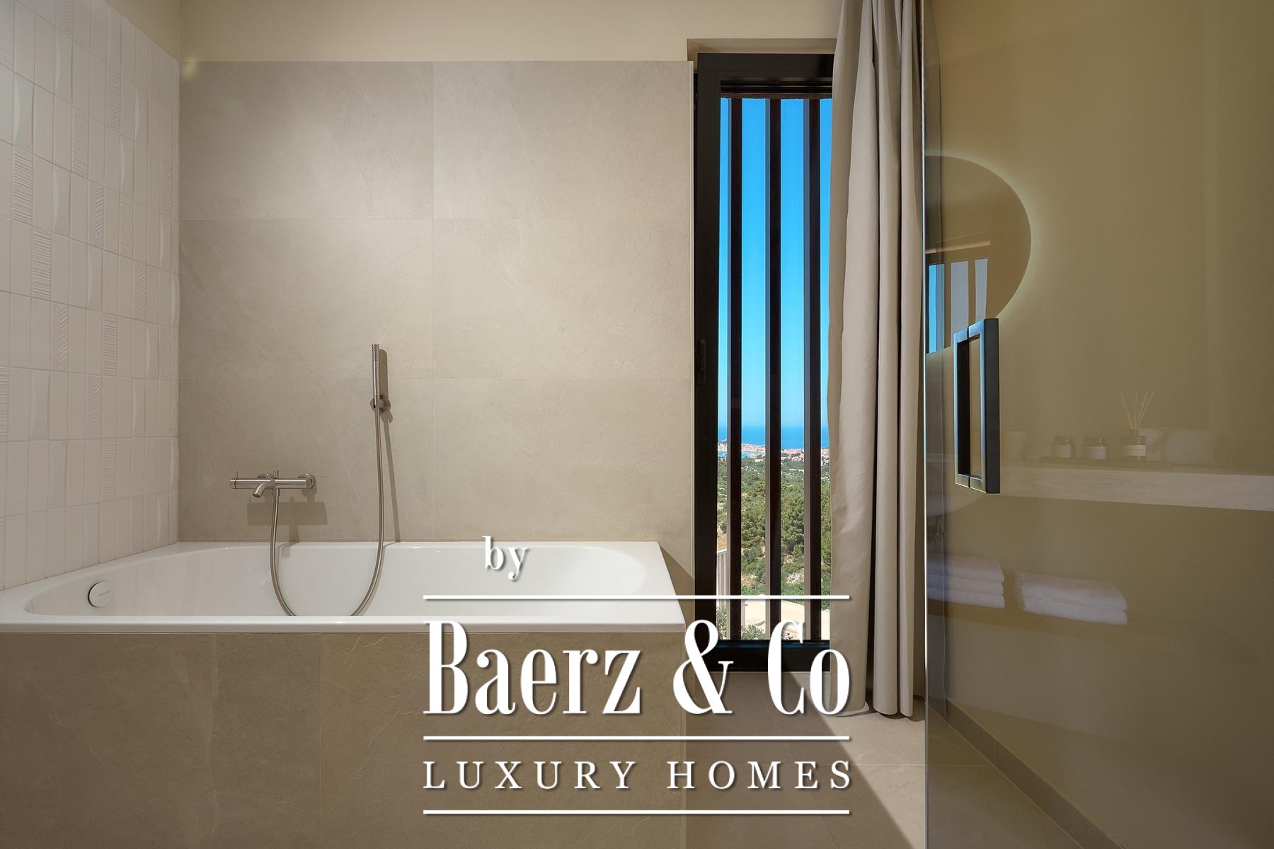The ground floor welcomes you into a luminous, open-plan living and dining area seamlessly connected to a modern kitchen, enhanced by floor-to-ceiling glass walls that invite natural light and foster a seamless indoor-outdoor flow. Expansive terraces host zones for relaxation and entertaining, including a summer kitchen and barbecue beside the infinity pool and its sunbathing platform.