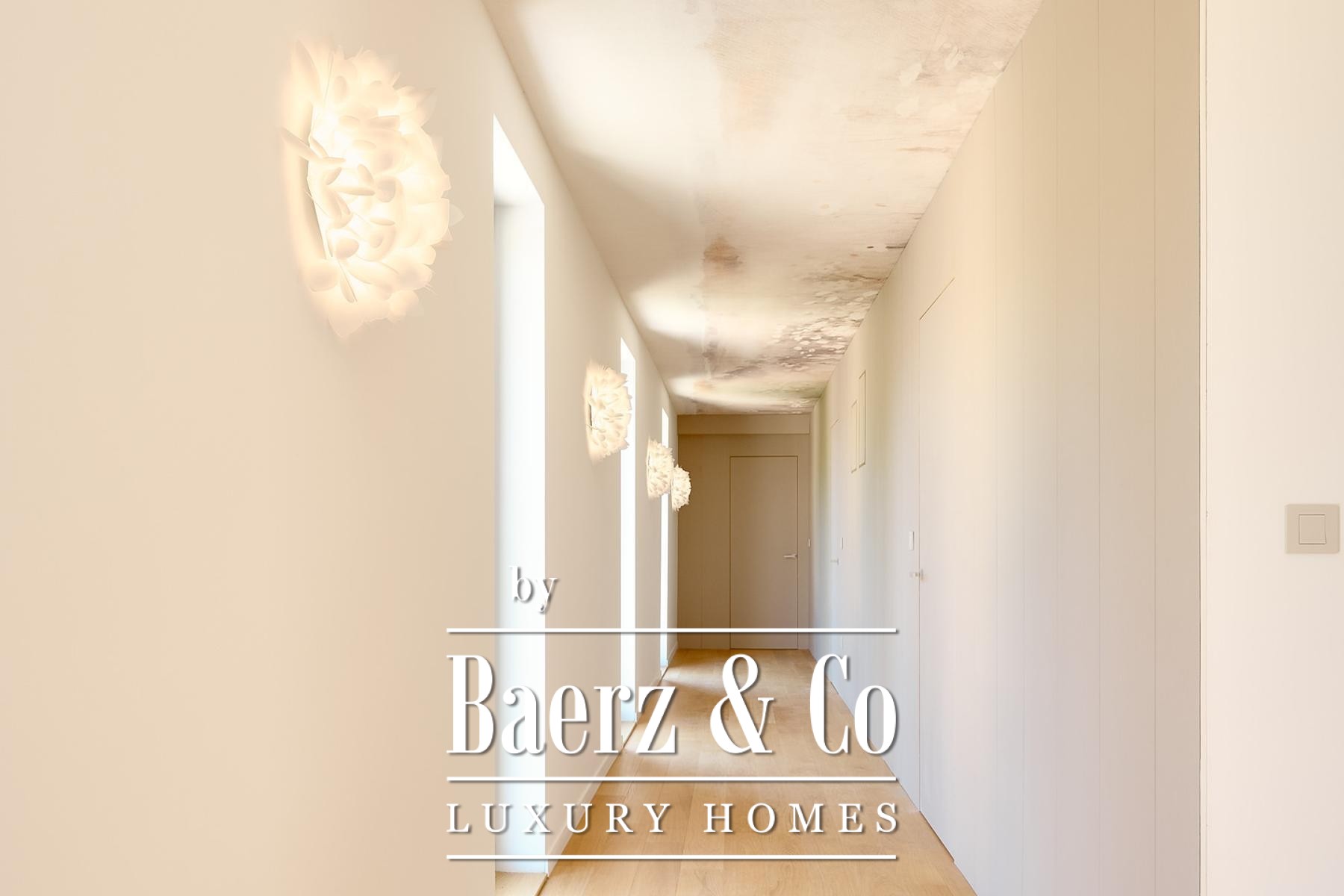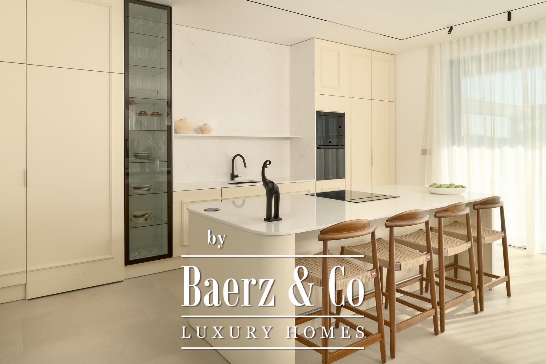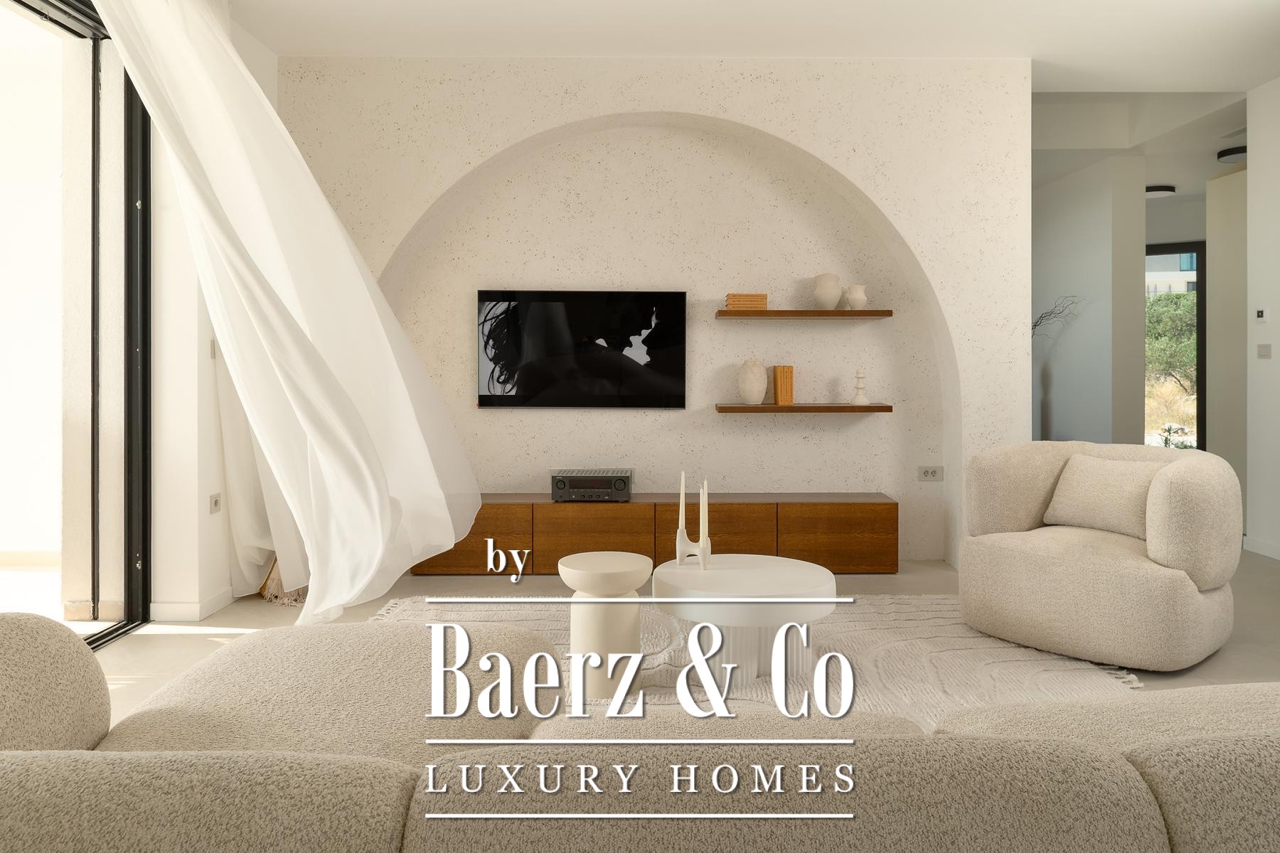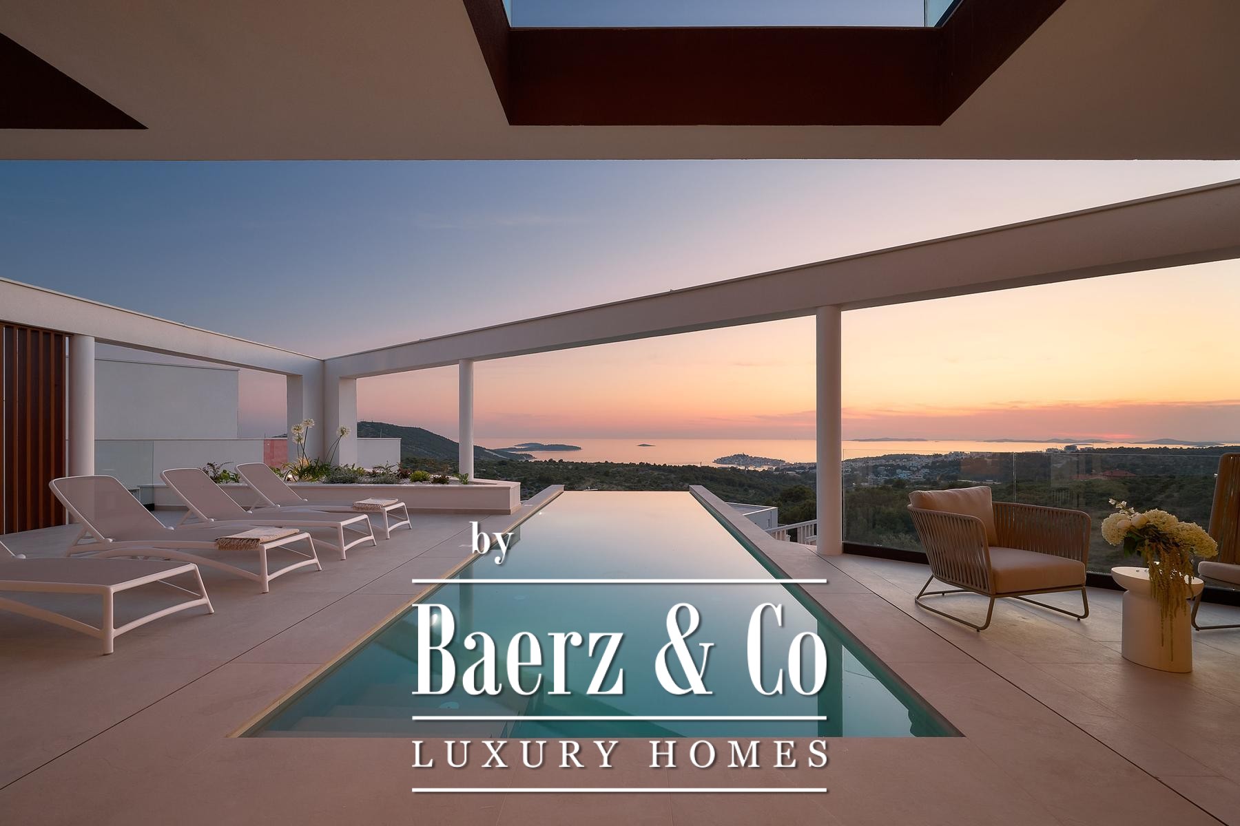 The ground floor welcomes you into a luminous, open-plan living and dining area seamlessly connected to a modern kitchen, enhanced by floor-to-ceiling glass walls that invite natural light and foster a seamless indoor-outdoor flow. Expansive terraces host zones for relaxation and entertaining, including a summer kitchen and barbecue beside the infinity pool and its sunbathing platform.