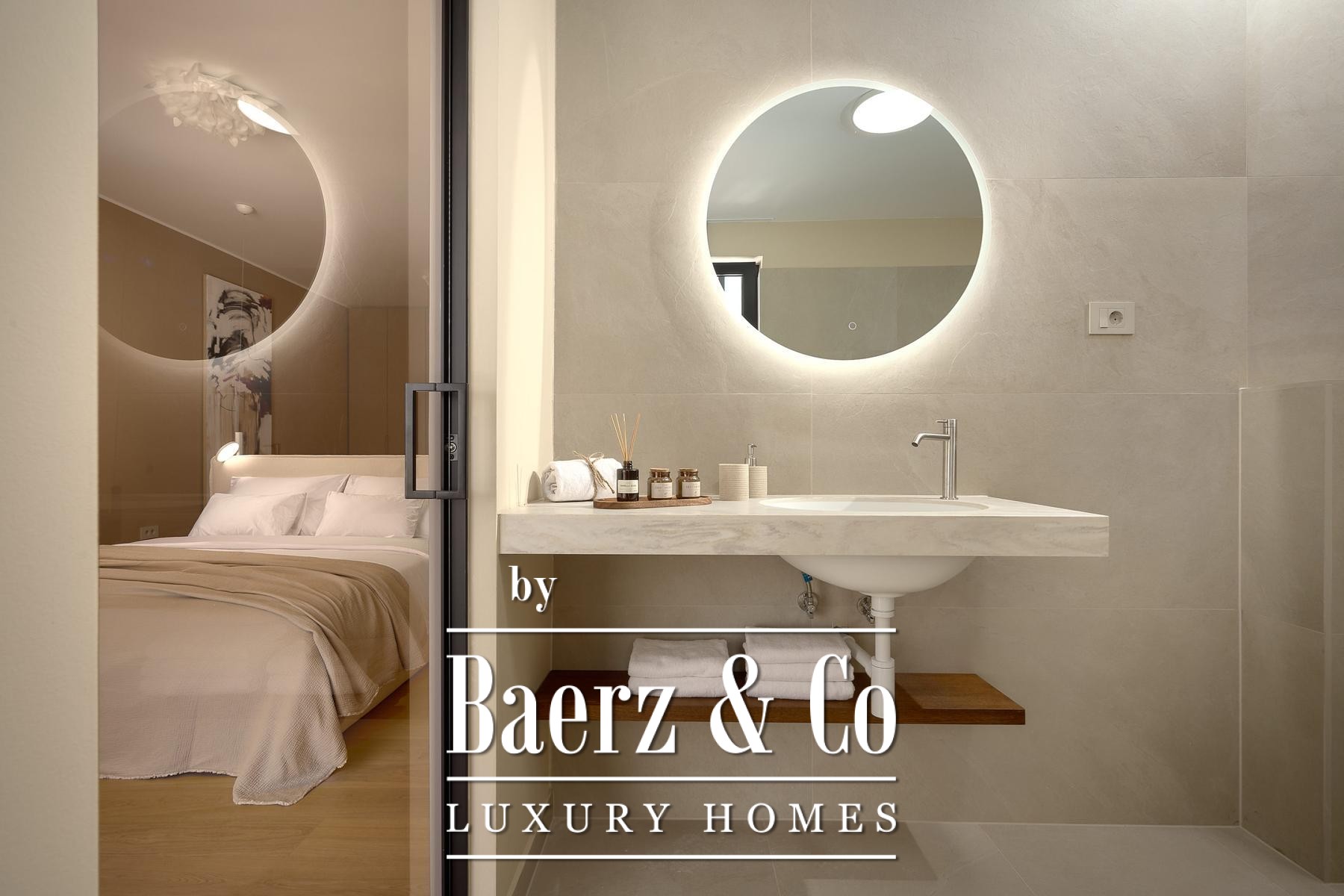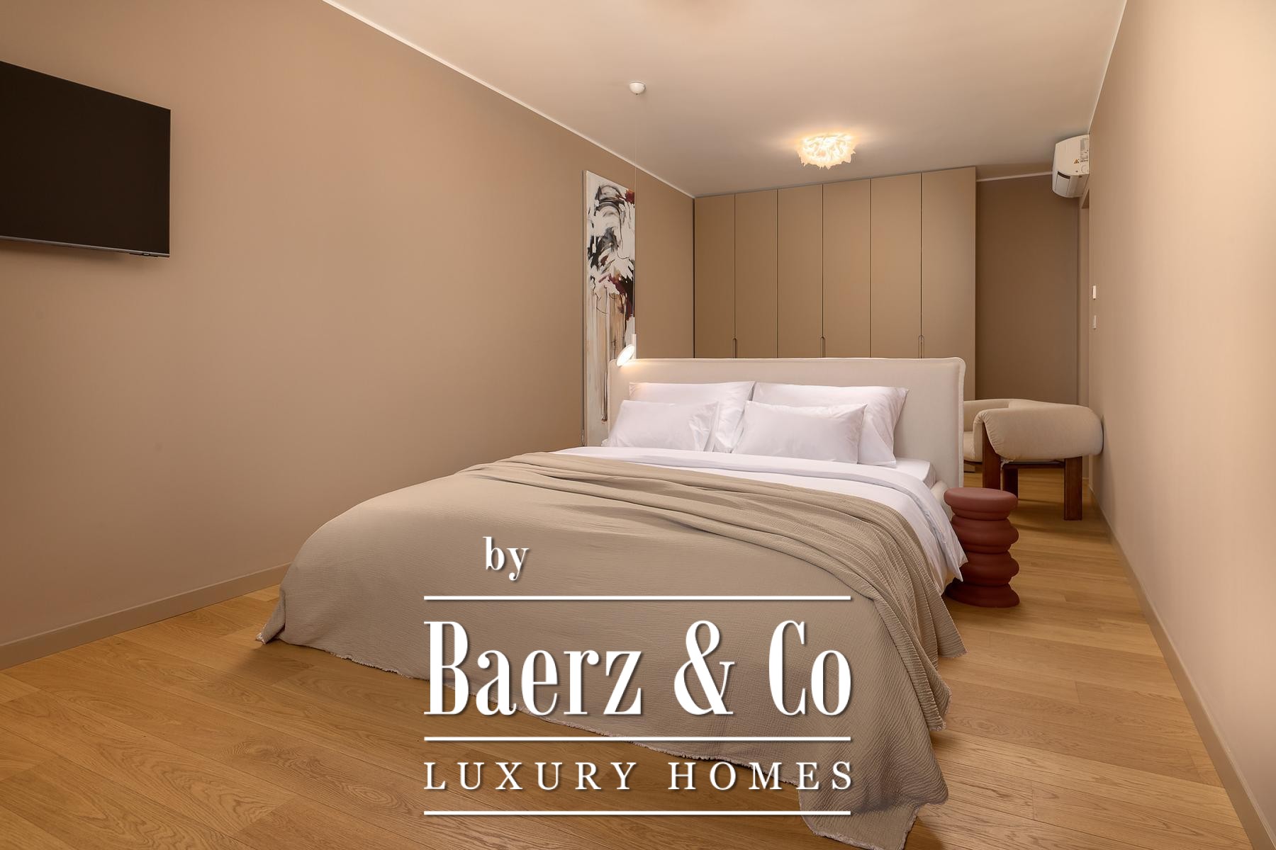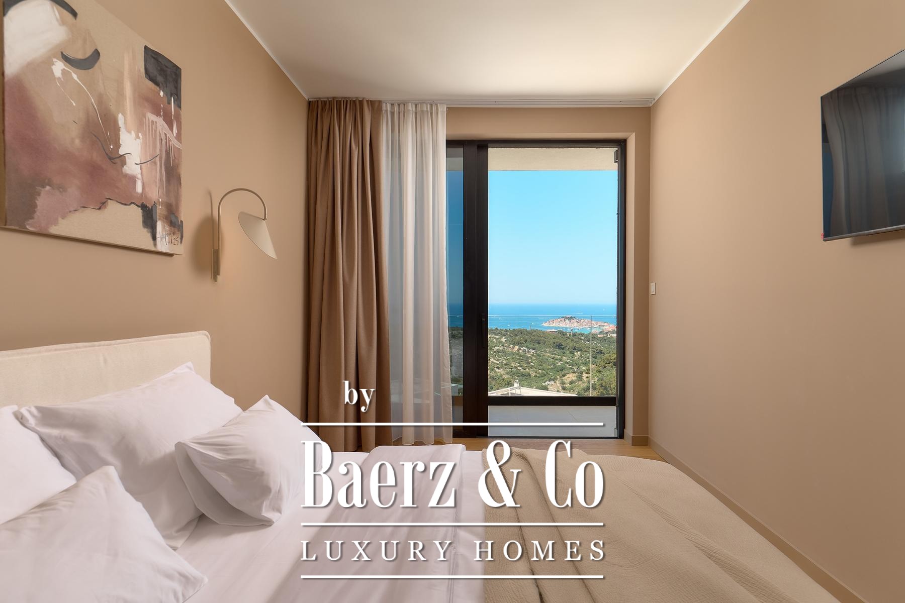 Across three floors, 379.58 m² are dedicated to vibrant daily living and personal retreat. The upper level houses four bedrooms, each with an en suite bathroom and balcony overlooking the Adriatic, fostering both exclusivity and tranquility. On the basement level, a guest or staff studio with its own terrace sits alongside a two-car garage, storage, and technical rooms.