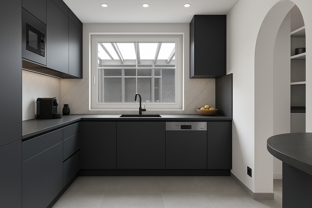 The open kitchen adjoins the living room and features an L-shaped worktop with hob, extractor, dishwasher, and sink. There is also a combination oven, a refrigerator, and ample storage. While the kitchen is functional and spacious, it can be modernized to suit personal taste.