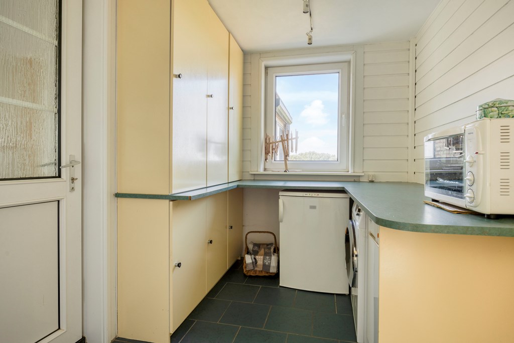A utility room adjoins the kitchen and offers practical storage for provisions or household items—a welcome addition for day-to-day convenience.