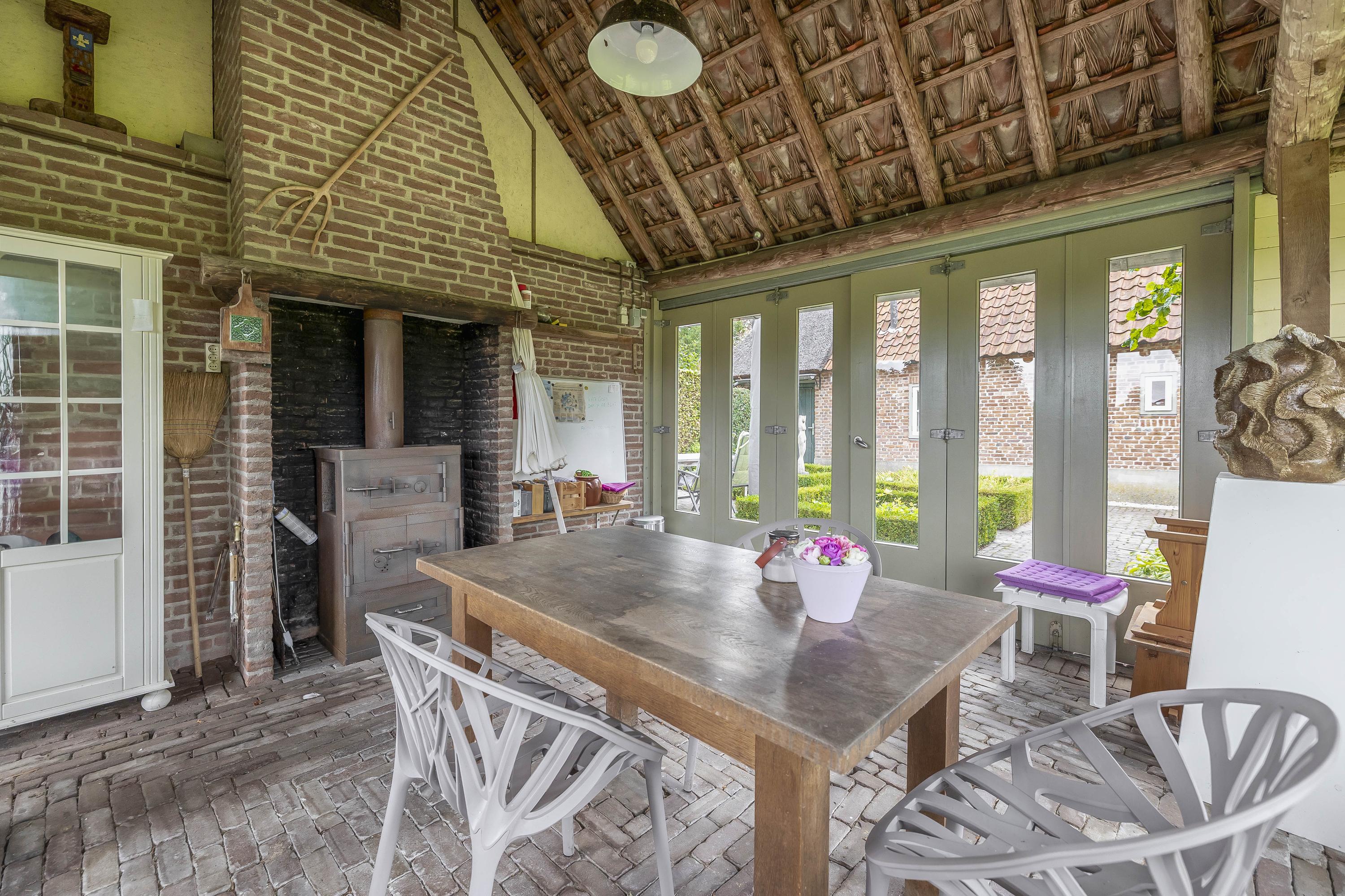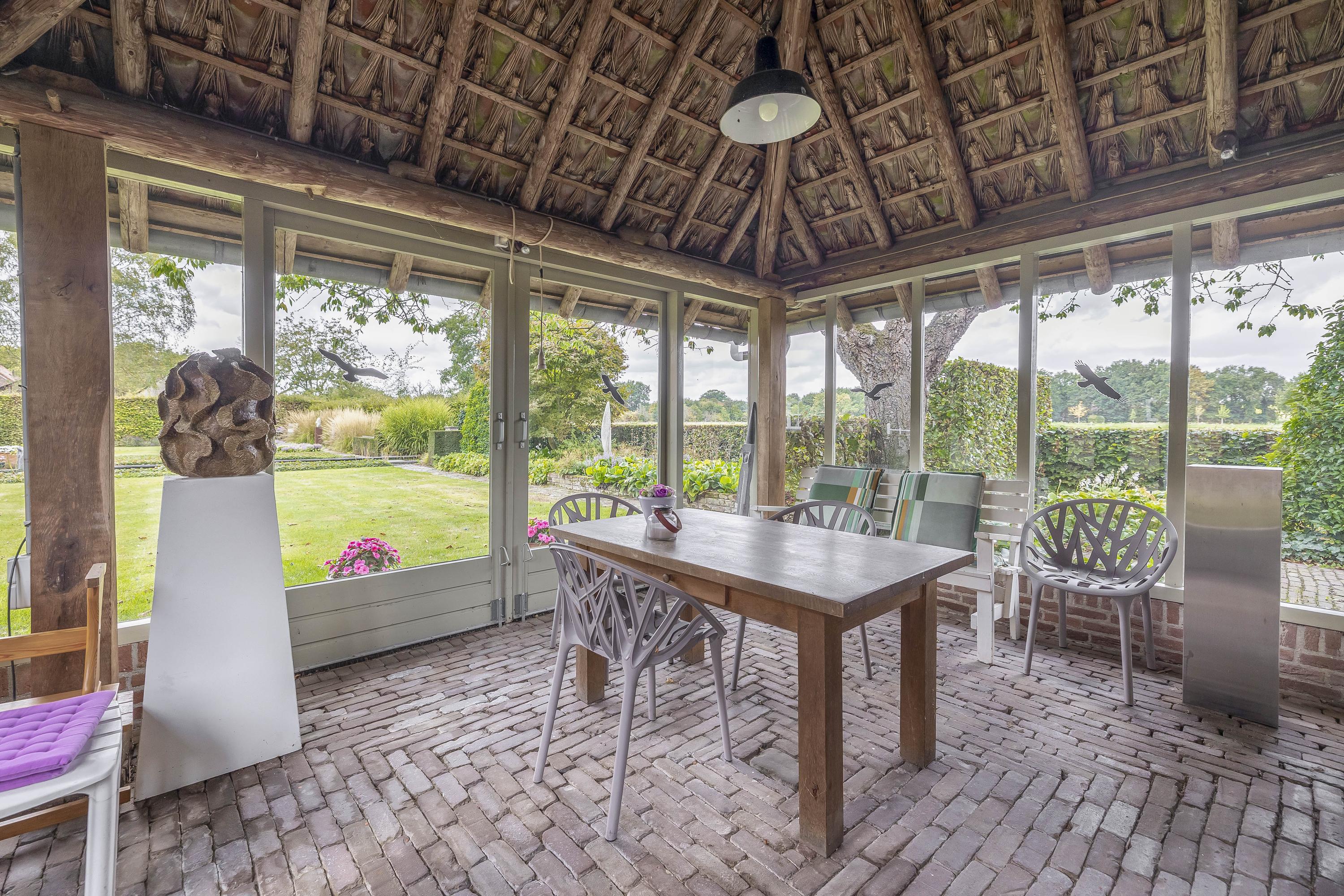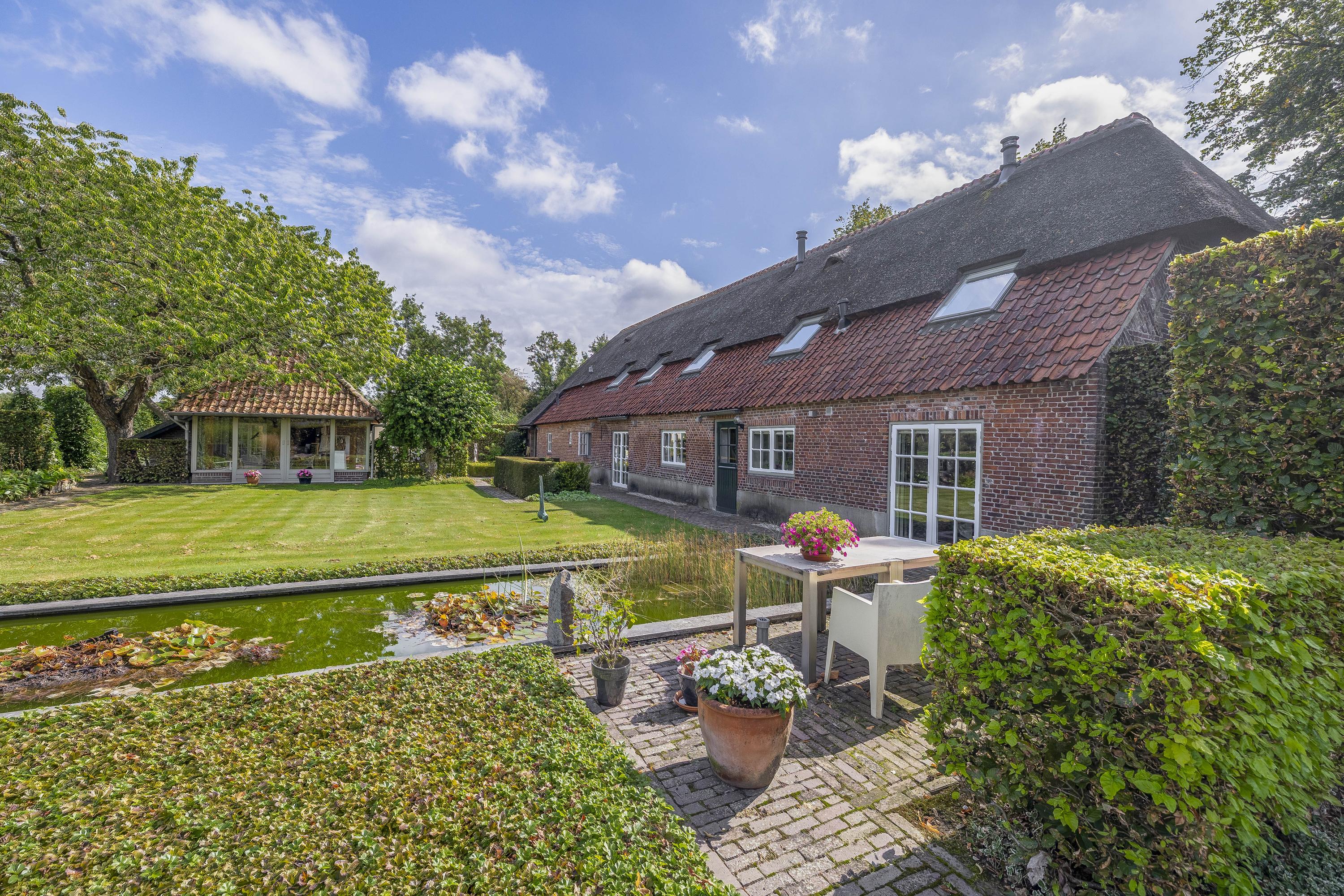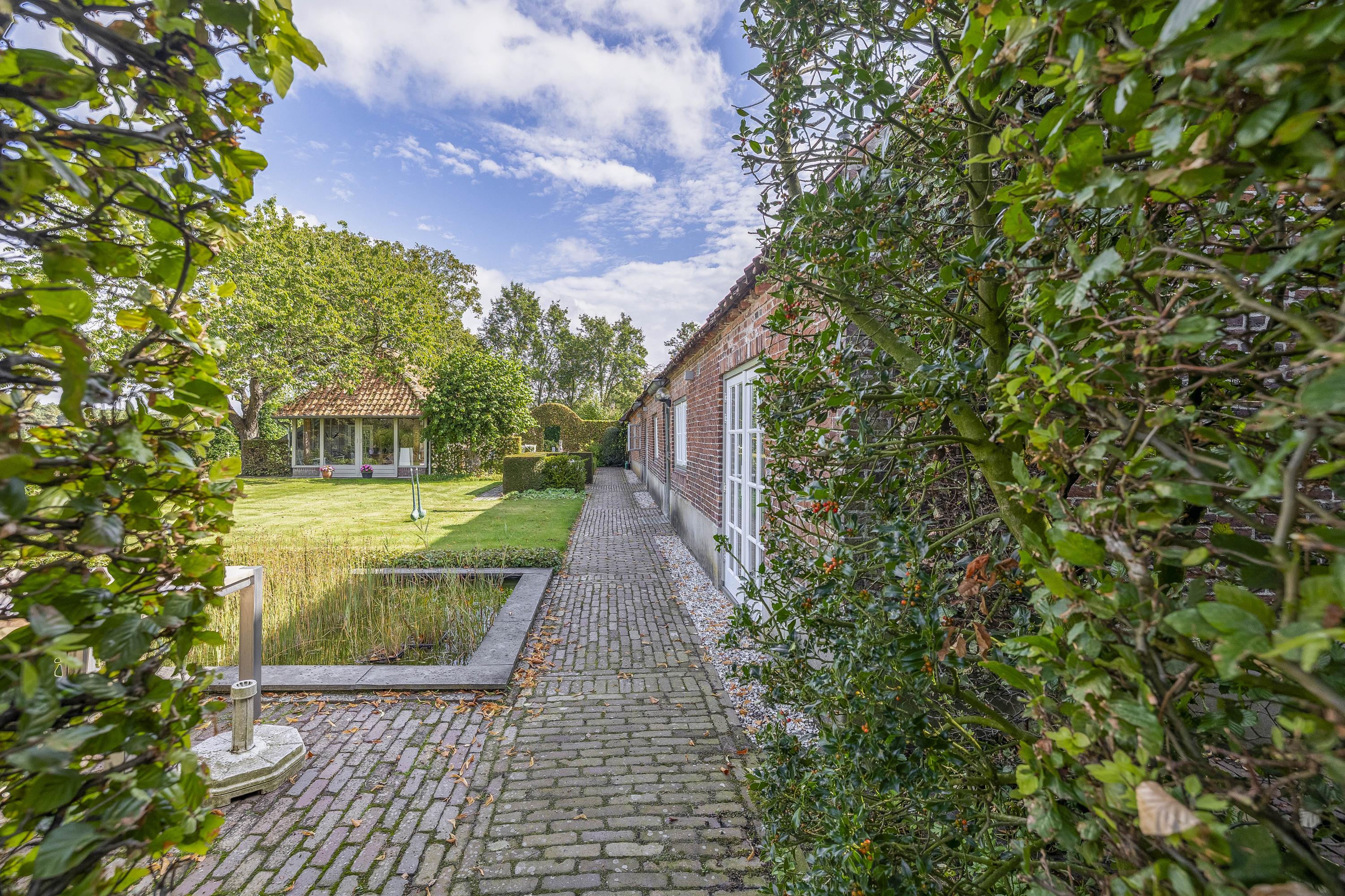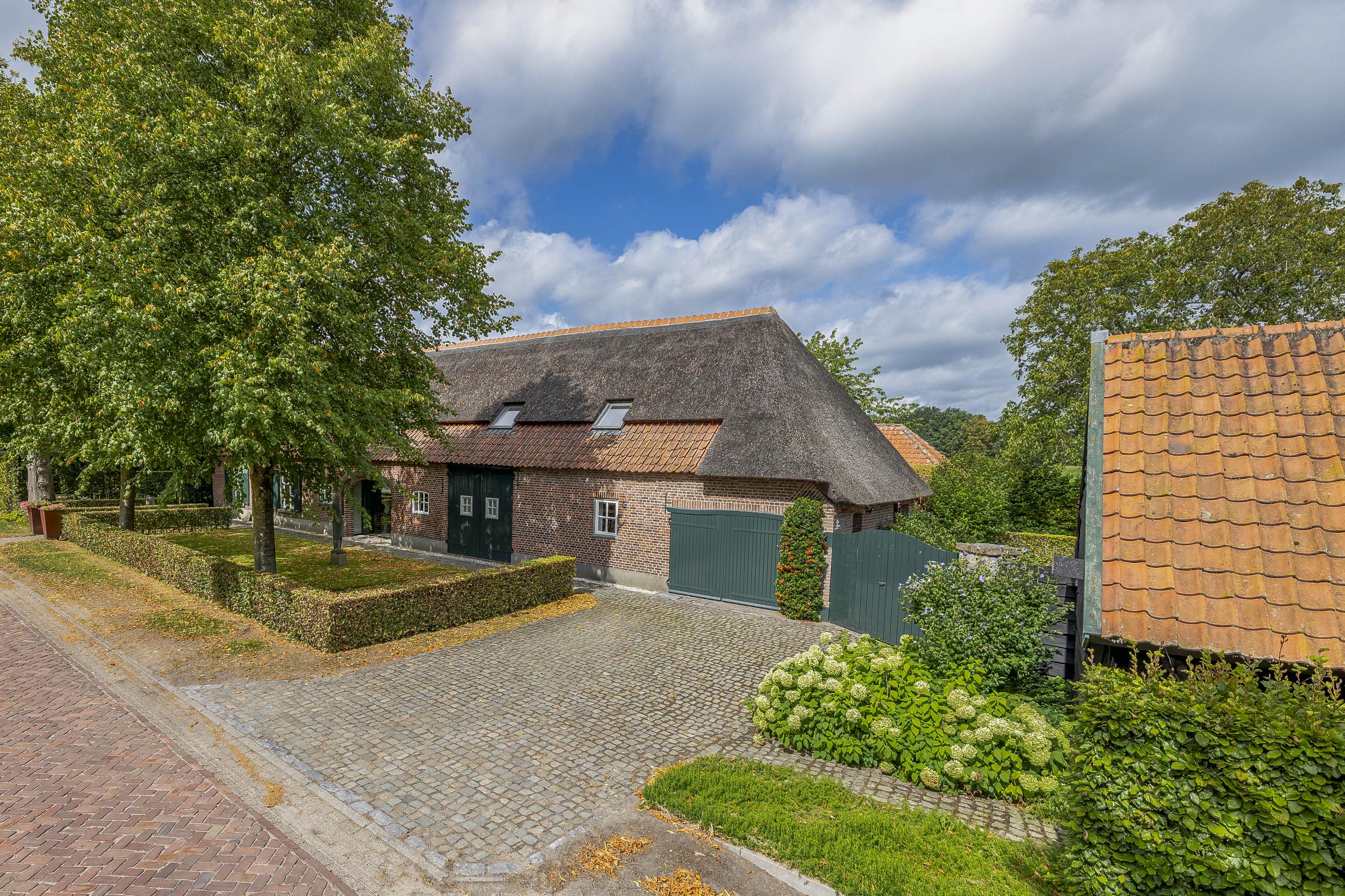 Beyond the primary residence, outbuildings extend possibility: a glazed garden house with fireplace, a studio with wine cellar, a double garage, and a barn crafted in old timber. Every segment is finished with practical sensibility—insulated, serviced, and offering ample storage. The gardens, landscaped and fully irrigated, unfold with private spaces and a variety of mature plantings, framed by rural views yet within easy reach of Valkenswaard and Veldhoven. This farmhouse for sale in Riethoven represents both continuity and progress—a place where every detail conveys care and consideration for a cultivated rural lifestyle.