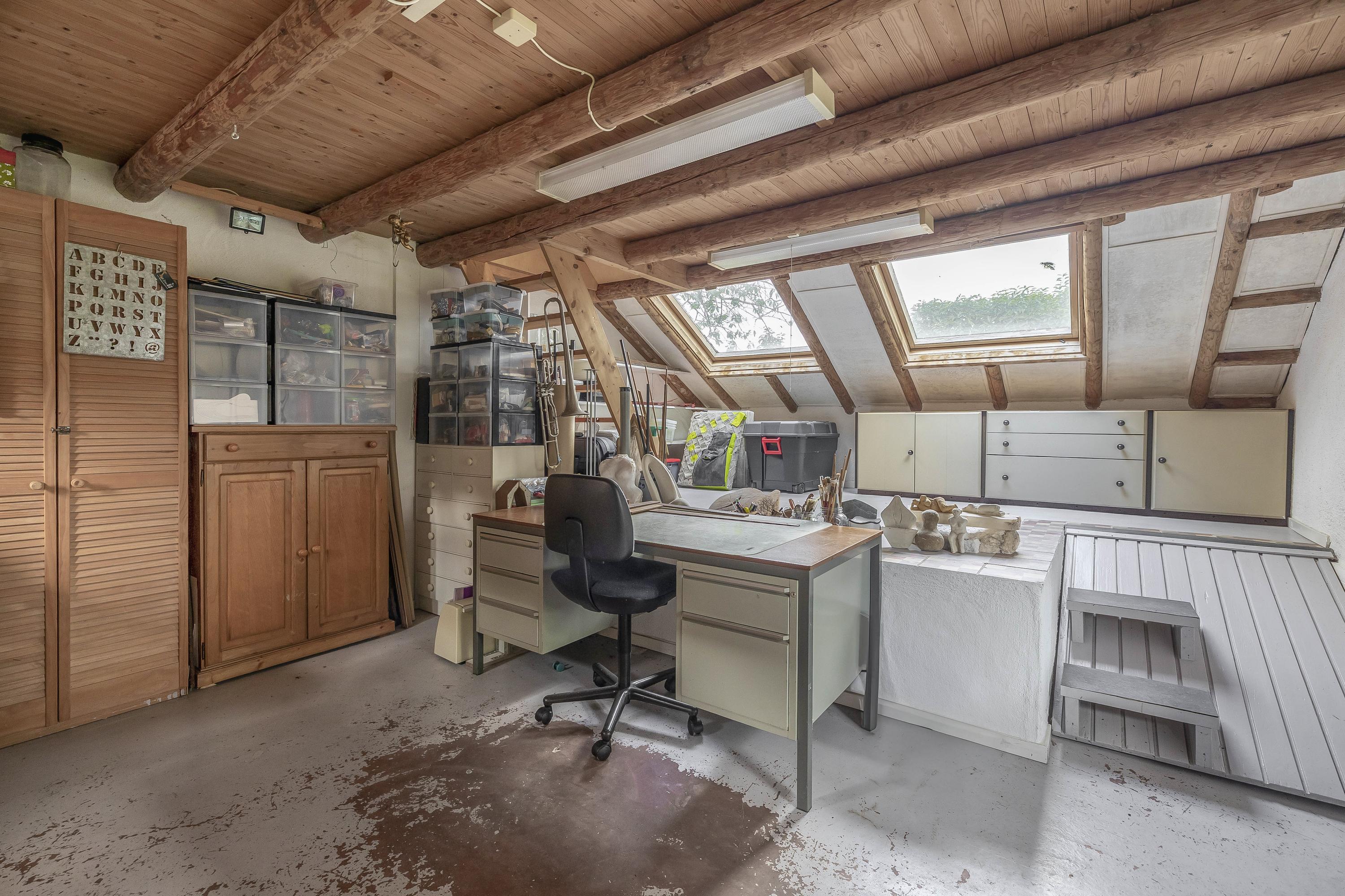 Upon entry, original beams cross over smooth plasterwork and heated tiled floors. The kitchen, fully renovated in 2011, centers domestic life around a composite-topped island, complemented by double French doors to the garden. The adjoining living room is anchored by a wood-burning stove and polished concrete, while extensive windows open onto mature lawns and a pond-defined landscape. A flexible plan flows to five bedrooms and two bathrooms, including adaptable spaces for a home office or studio, while the attic and landing offer further potential shaped by light from multiple skylights.