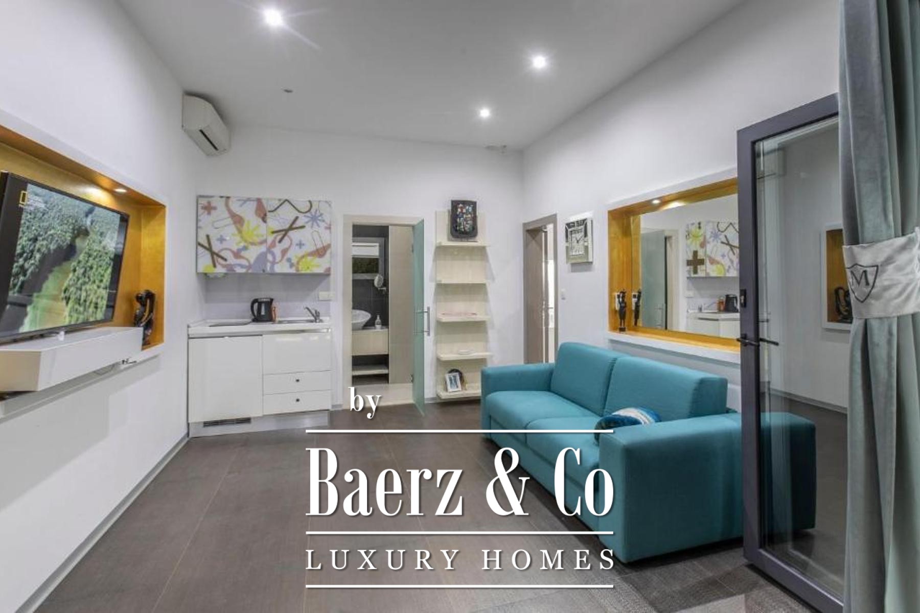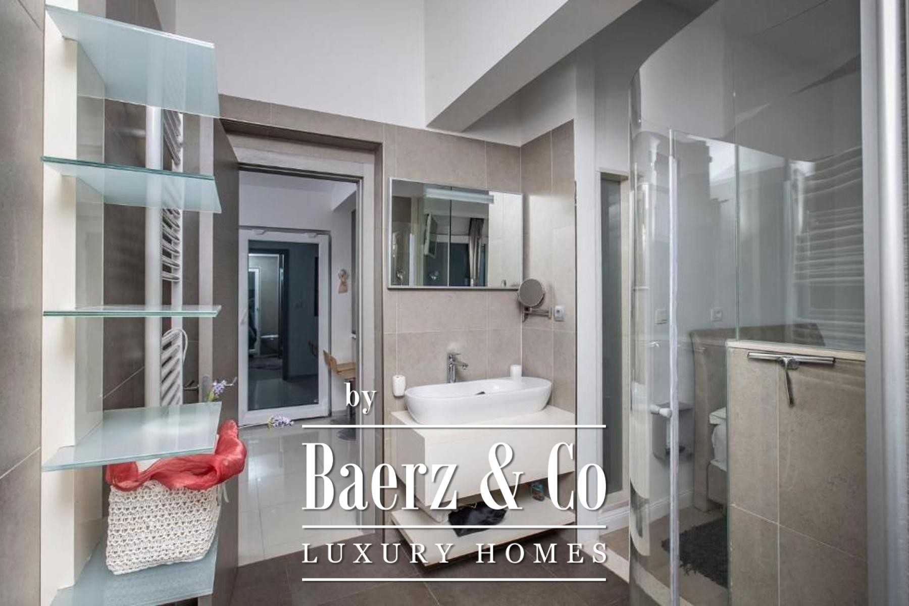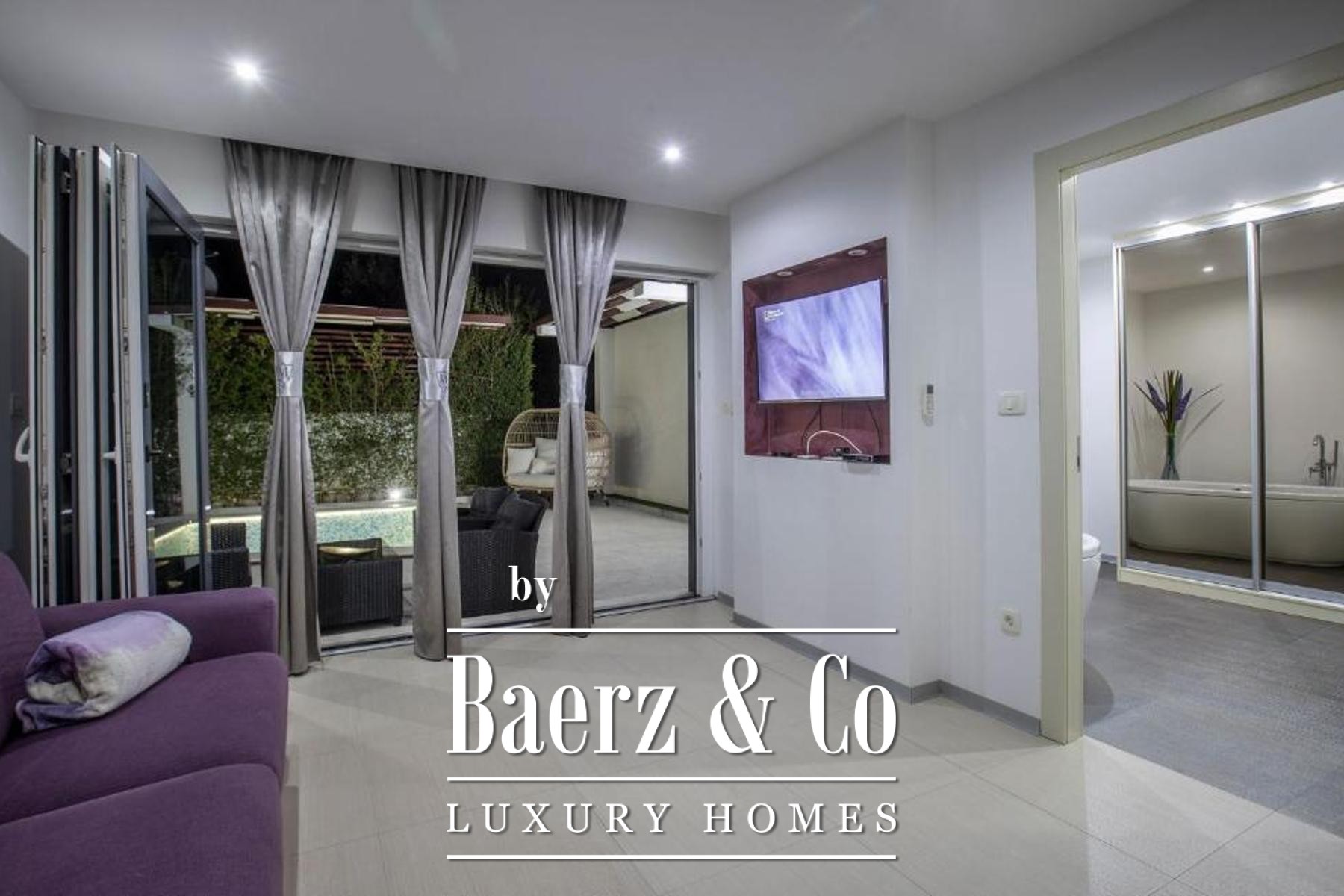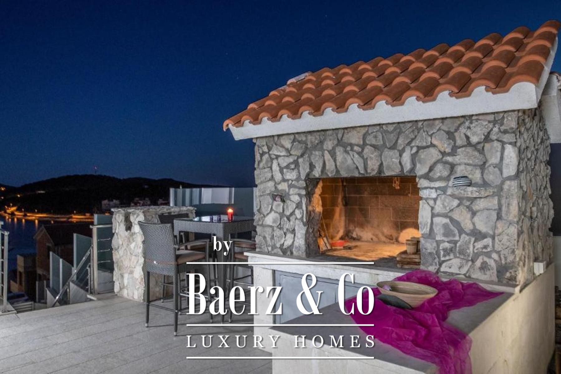 The upper level presents a luminous living space with a kitchen and dining area, two bedrooms, and two bathrooms, with each main room connecting to balconies oriented towards sea and pool views. Flexibility is integral, as the first floor can be separated into independent apartments to suit a range of lifestyles or hospitality needs. Refined finishes and premium furnishings underscore every detail, while thoughtful amenities include a tavern with barbecue, an inviting space for dining and gathering, and a sunlit yard. Three parking spaces complete the picture of relaxation and opportunity in Croatia’s coastal landscape.