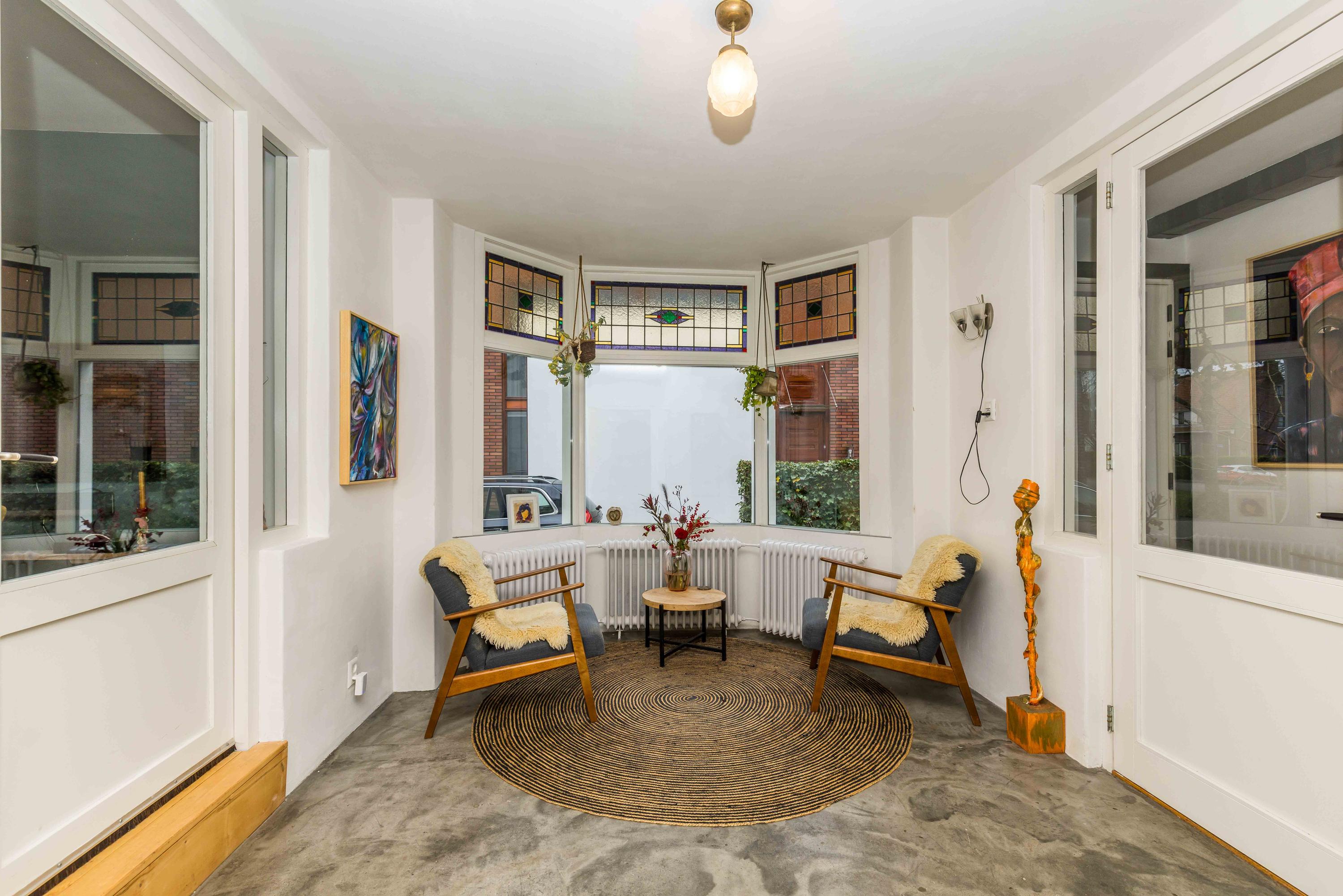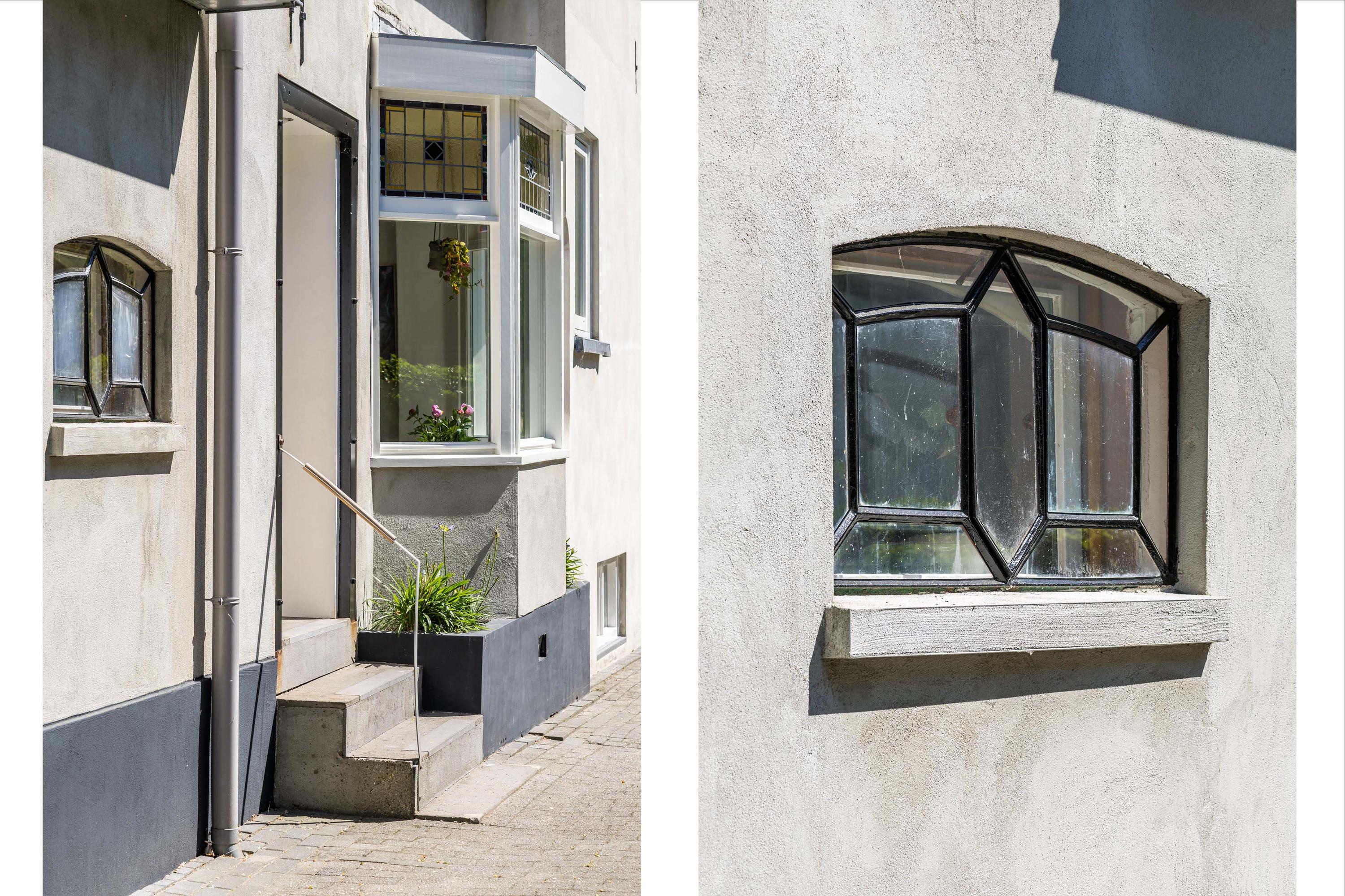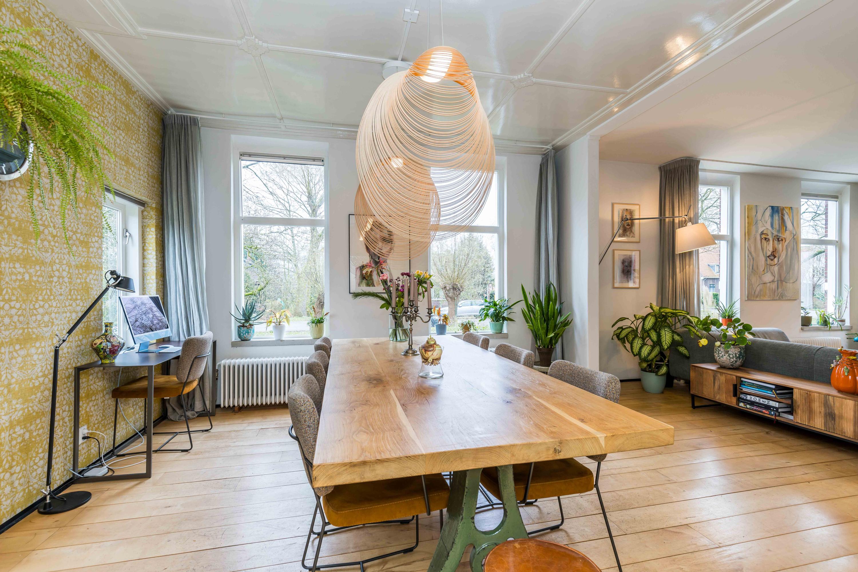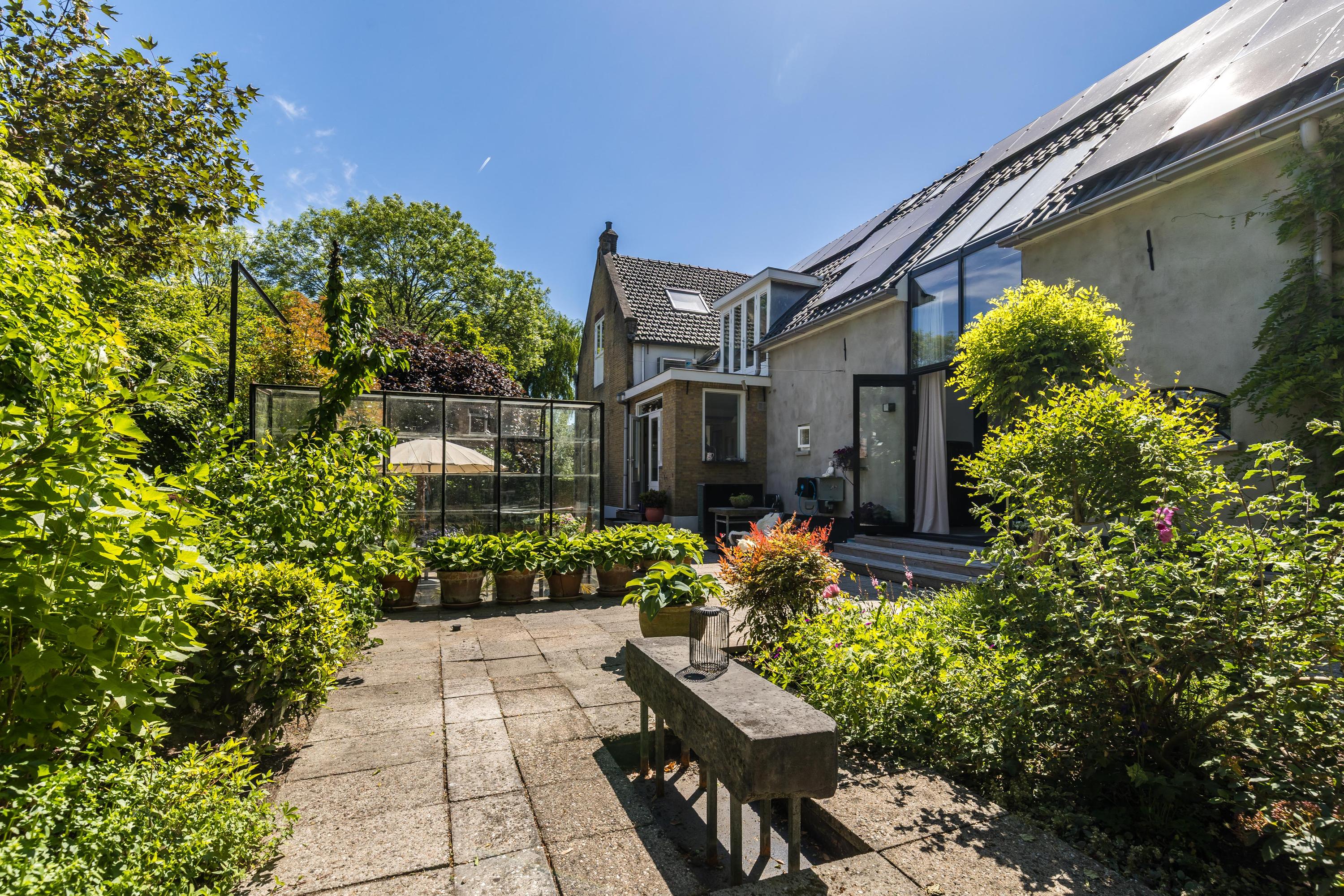 Entrance on the side of the house, spacious hall with toilet, wardrobe and staircase, attractive intermediate room with stained glass windows, cupboard space and a door to the kitchen, spacious wide living room with windows on three sides that provide lots of light, a beautiful wooden floor, high ceilings and a beautiful view, under the sitting room is also a (wine) cellar with daylight. The stained glass separation also leads to the kitchen, equipped with a kitchen unit and patio doors to the side garden and a door to the basement. From this kitchen there is access to the utility room with laundry room and heat pump installation. This utility room in turn provides access to the beautiful very spacious and garden-oriented kitchen in the back house with stairs to the first floor, a private toilet, a loft, high ceiling, large windows and patio doors to the garden.