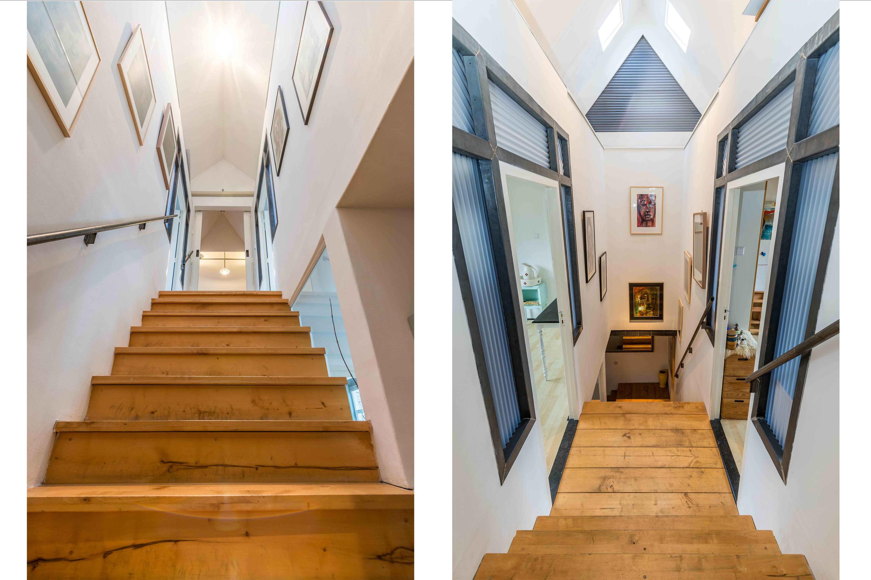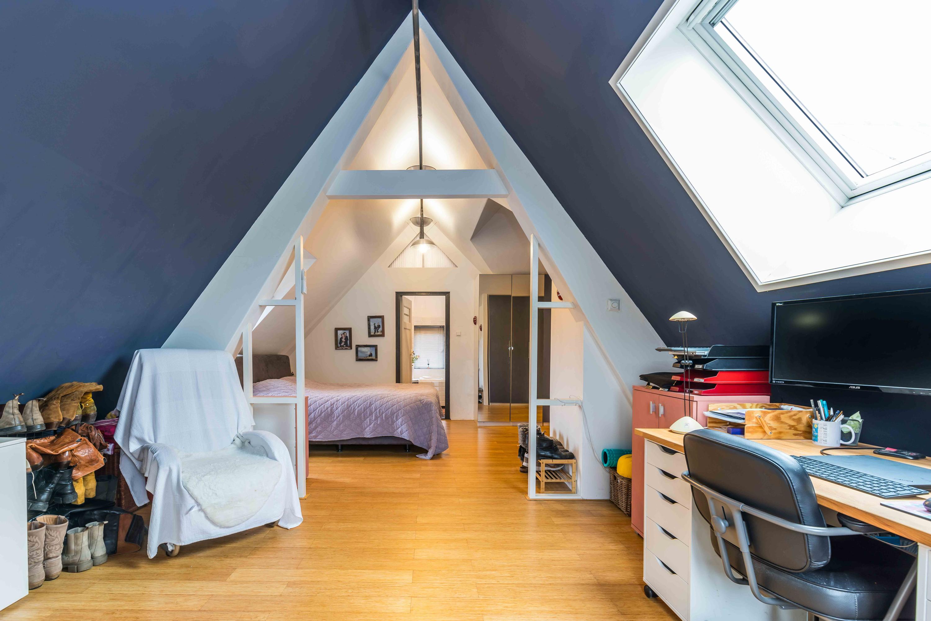 Landing at the back of the house with French doors and a loft. Spacious bedroom with access to a second bathroom with the toilet, walk-in shower and a double sink. This bathroom also provides access to a bedroom in the front house.