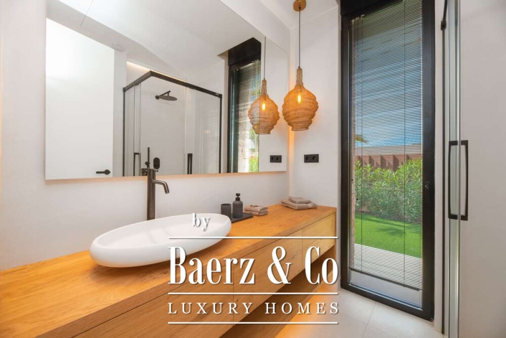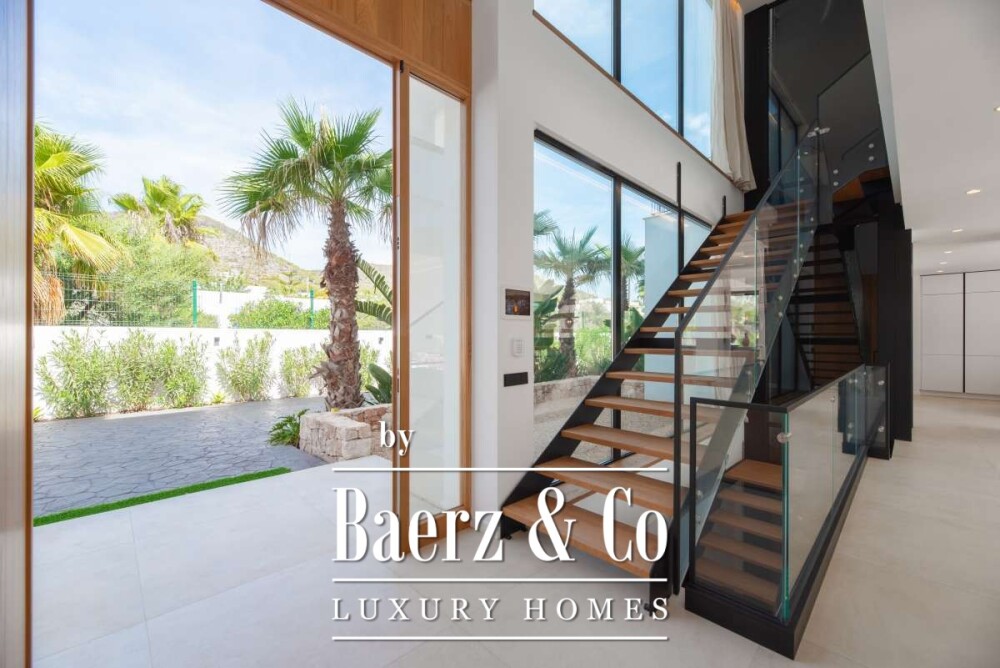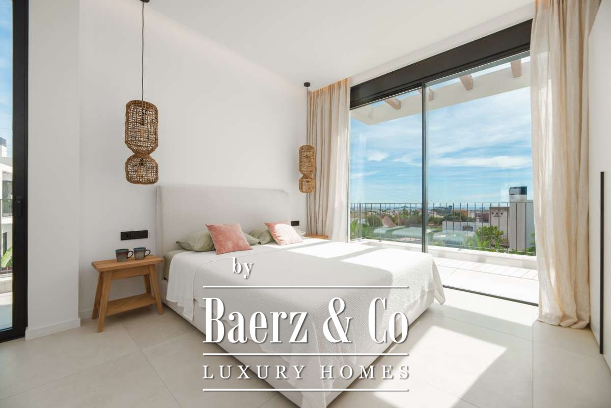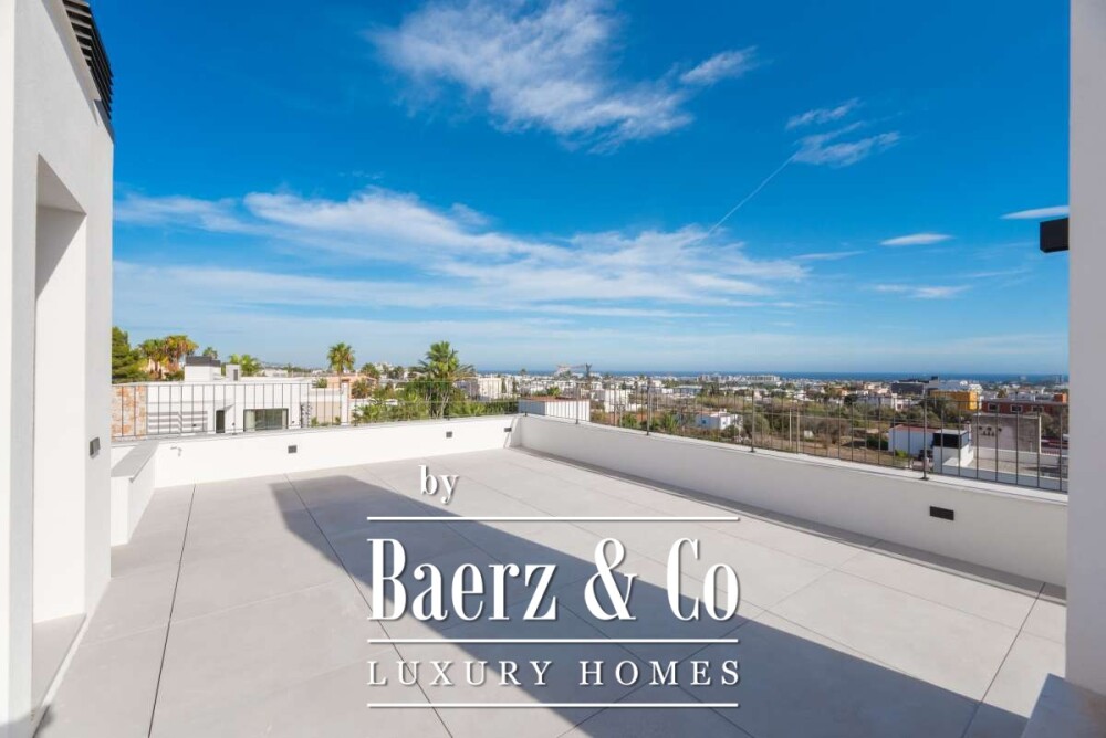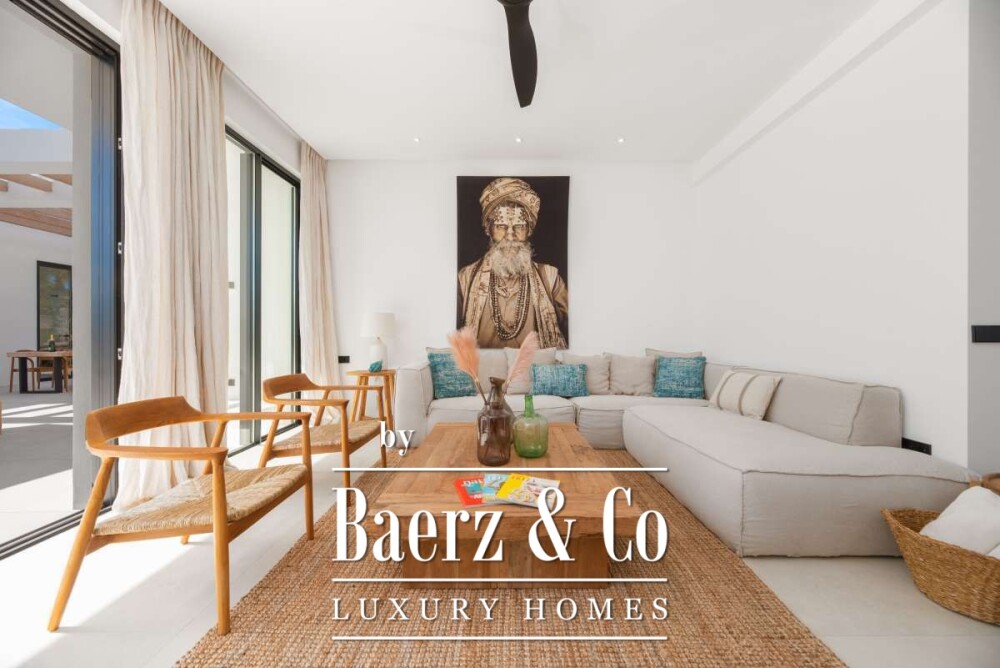 Villa Sa Carroca Ibiza is an expression of contemporary elegance rooted in the enduring character of the island. Set on a 1,208m² plot, this 460m² residence resides in one of Ibiza’s most tranquil yet accessible enclaves. Within a short drive, the celebrated beaches of Ses Salines, the energy of Ibiza Town, and the convenience of the airport shape an inviting rhythm of island life. Designed with restraint and clarity, the villa blends modern architecture with rustic Ibiza influences. Light tones of white, beige, and natural wood accentuate volume and space. The expansive open-plan living area flows seamlessly to a sunlit terrace, revealing Mediterranean views, a sculptural saltwater pool, and lush garden landscaping. Oak, natural stone, and lacquered finishes center the chef’s kitchen, while the living room’s fireplace and high ceilings frame natural light and open views. Six bedrooms, each with terrace access, include two master suites on the upper floor with en-suite bathrooms and two bedrooms sharing a third bathroom. The ground floor master and flexible additional room combine calm privacy with connectivity. A glass lift connects basement to rooftop, securing accessibility, while smart-home systems discreetly orchestrate comfort and security. Outdoor spaces draw attention to 360-degree panoramas, from the sunken lounge and waterfall pool to the open pergola with a summer kitchen, bar, and barbecue. The property offers five car spaces, including an underground garage and electric vehicle charging, ensuring practicality and sustainability. This villa, a synthesis of luxury and traditional Ibiza style, suits those who value quiet beauty, seamless living, and unrivalled vistas—an exceptional luxury villa for sale in Sa Carroca Ibiza.