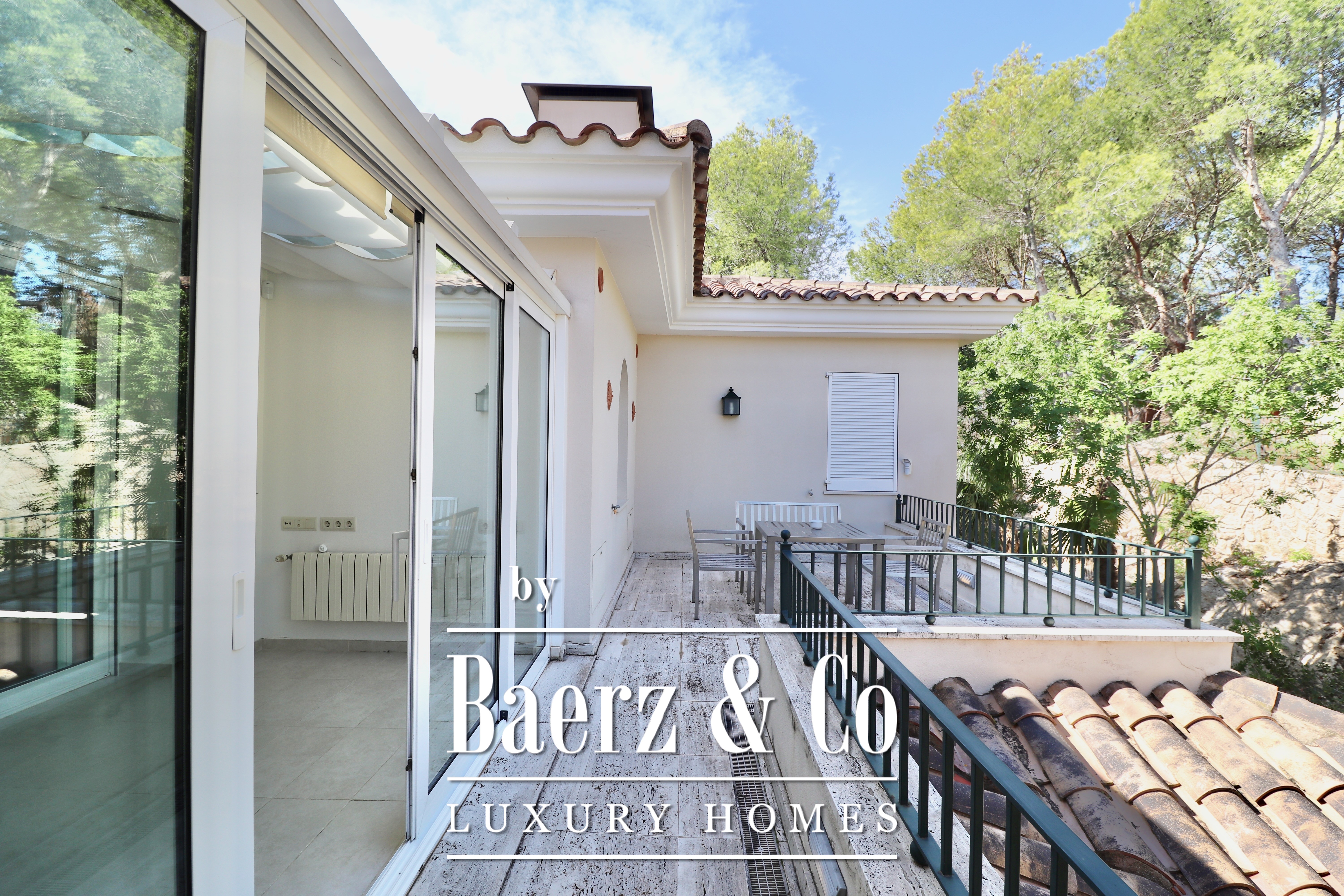 The upper floor is dedicated to rest, offering four suites, each with dressing rooms and private terraces against a backdrop of the Mediterranean. The lower level enhances daily ritual with a gym, sauna, wine cellar with dining zone, an additional bedroom, laundry, and a garage with capacity for eight vehicles. Fine materials, marble floors, high-end carpentry, and seamless home automation define every surface. Minutes from the centre of Sitges and the sea, this luxury villa for sale in Sitges offers a life of ease, privacy, and enduring style.