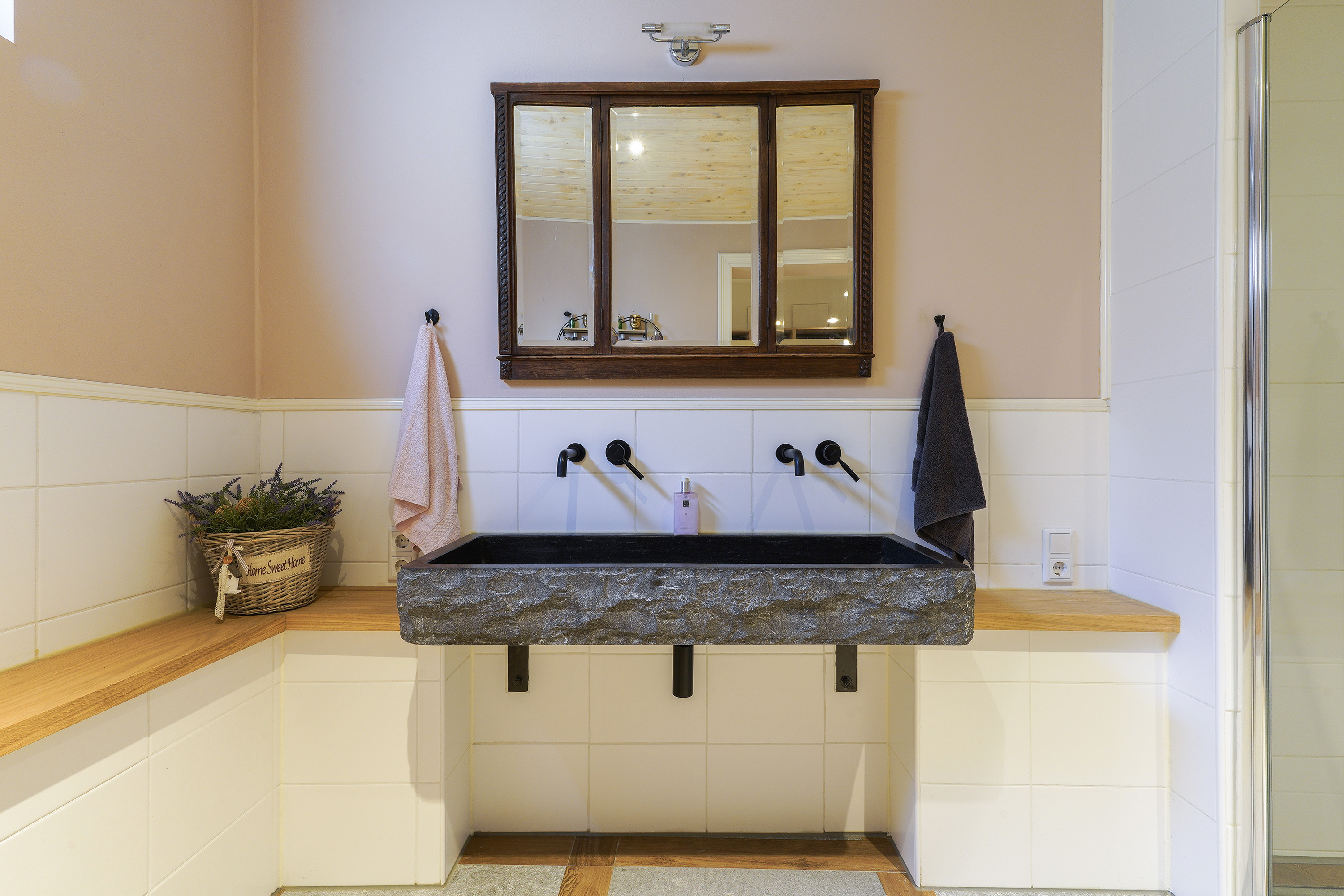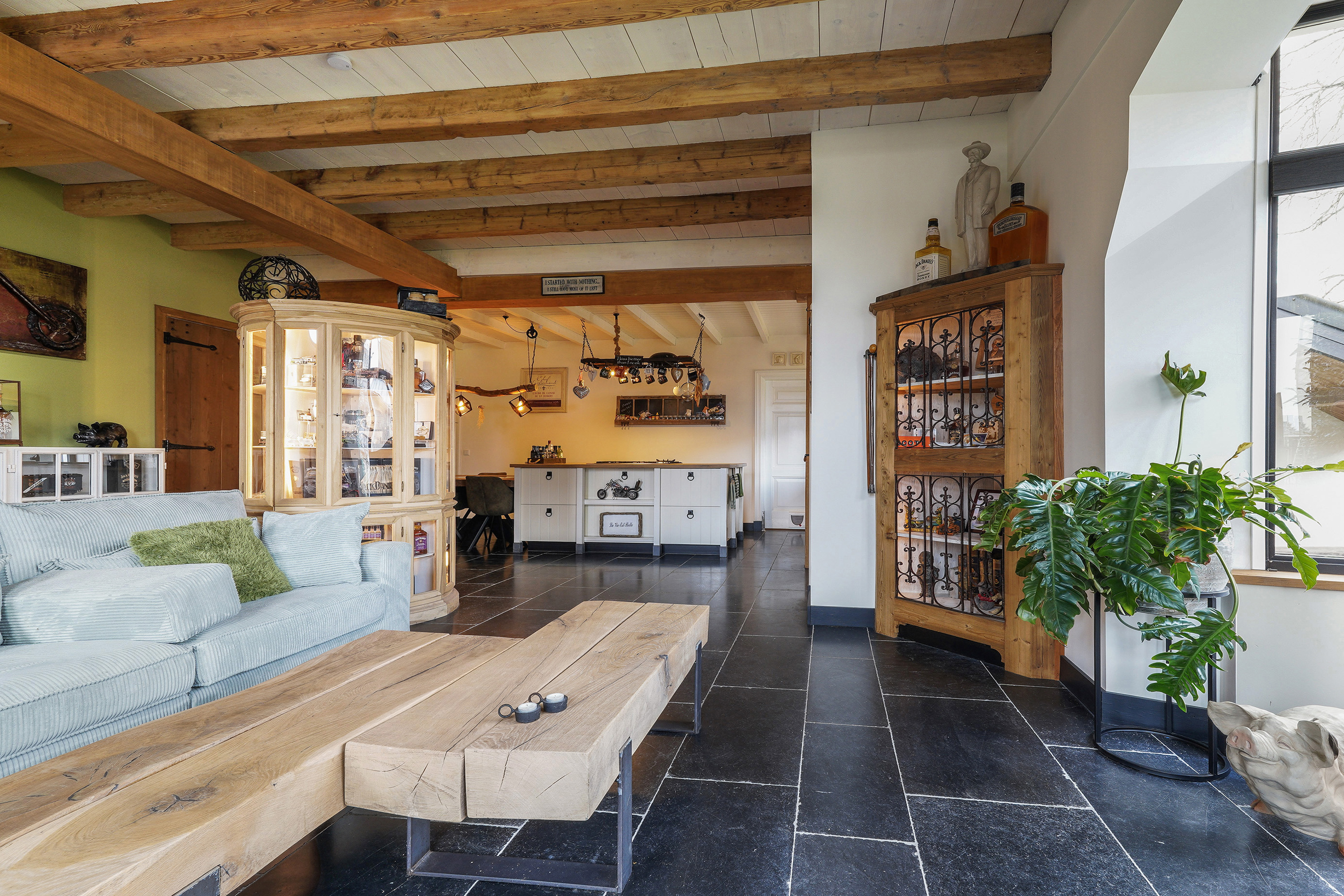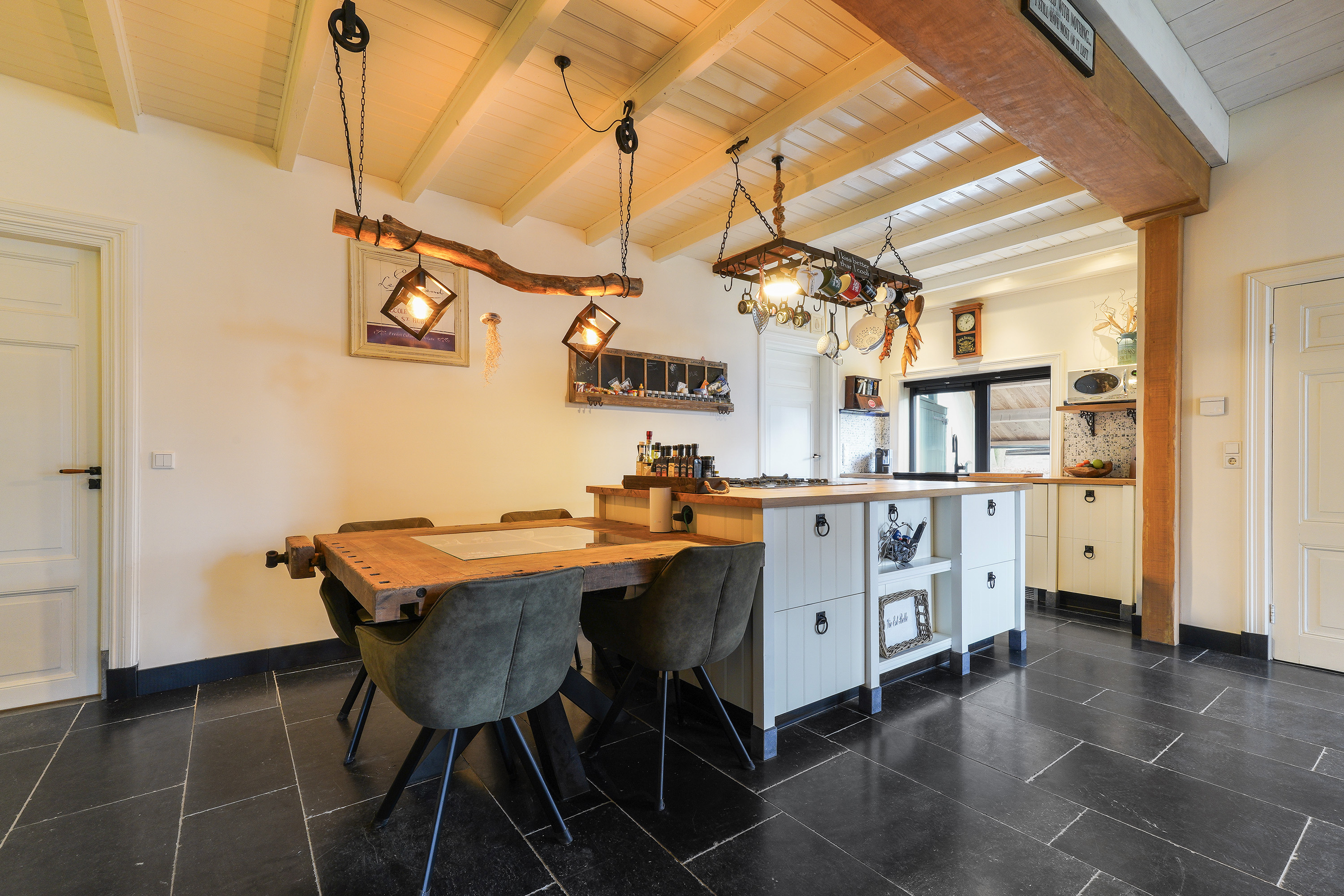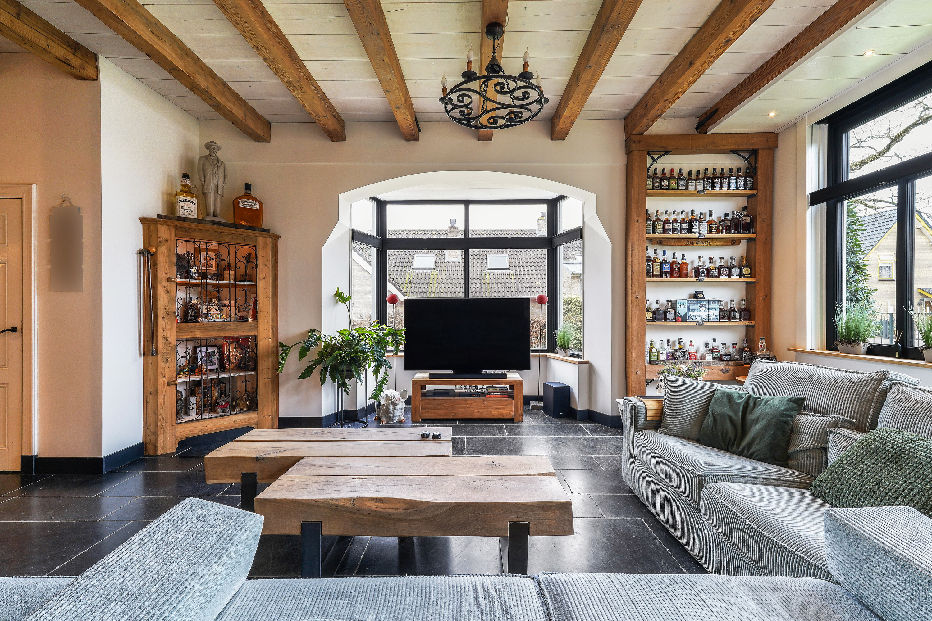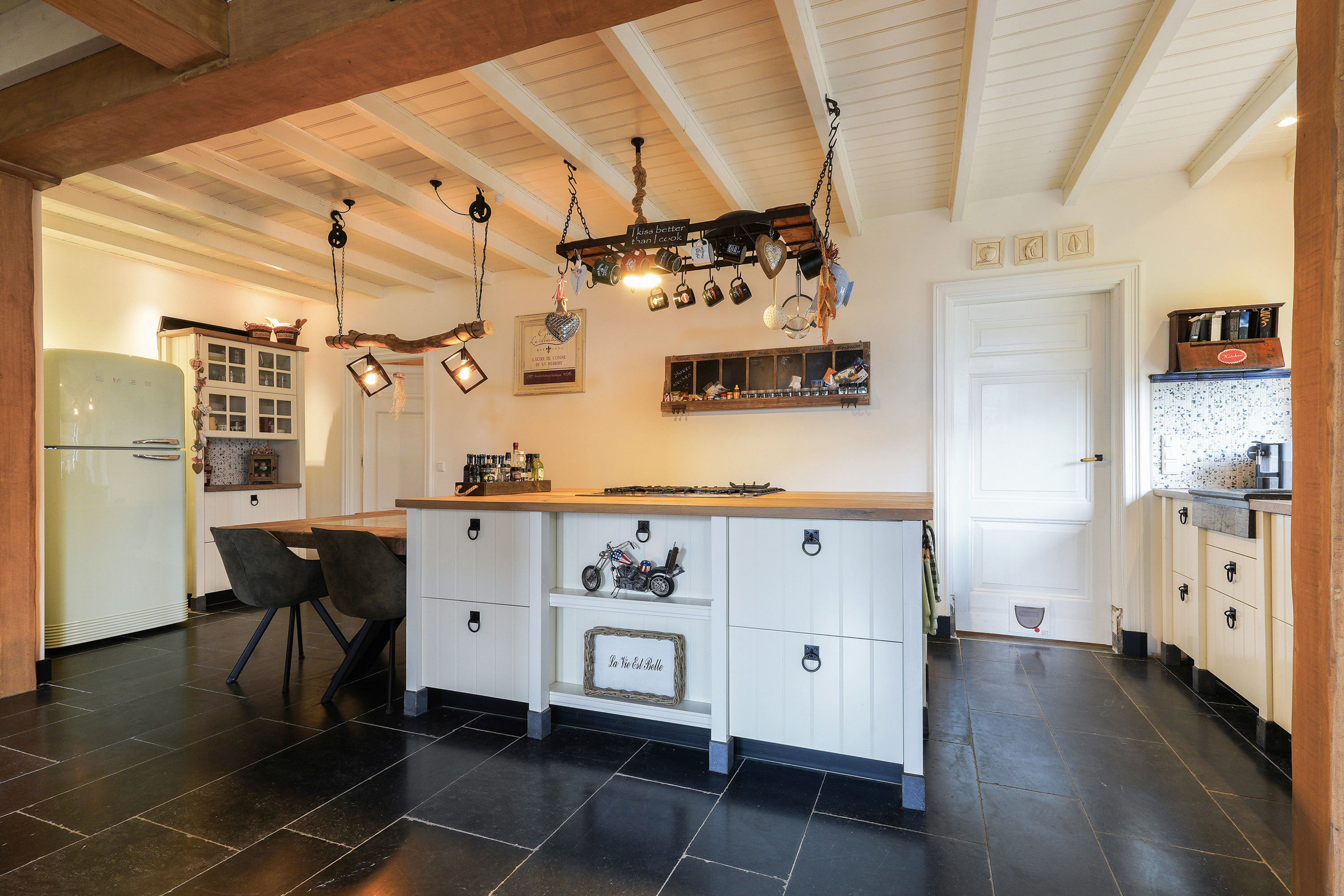 De sfeervolle keuken vormt één geheel met de gezellige woonkamer en is voorzien van een kookeiland met aangrenzend een houten eettafel, veel bergruimte en uiteraard alle luxe inbouwapparatuur. En dan... bereikbaar via de bijkeuken, de garage of de veranda aan de achterzijde… de bar. Compleet uitgevoerd met koelingen, een eigen toiletruimte met toilet en urinoir en een indrukwekkende vide tot in de nok. Zelfs vanaf de zolderverdieping kijk je via die vide weer de bar in. Dit is een ruimte die je moet ervaren.