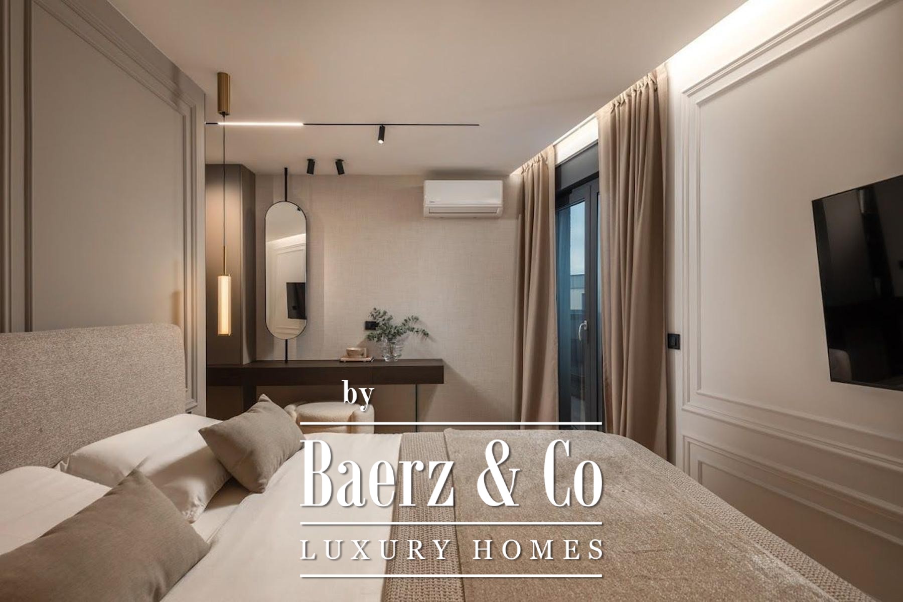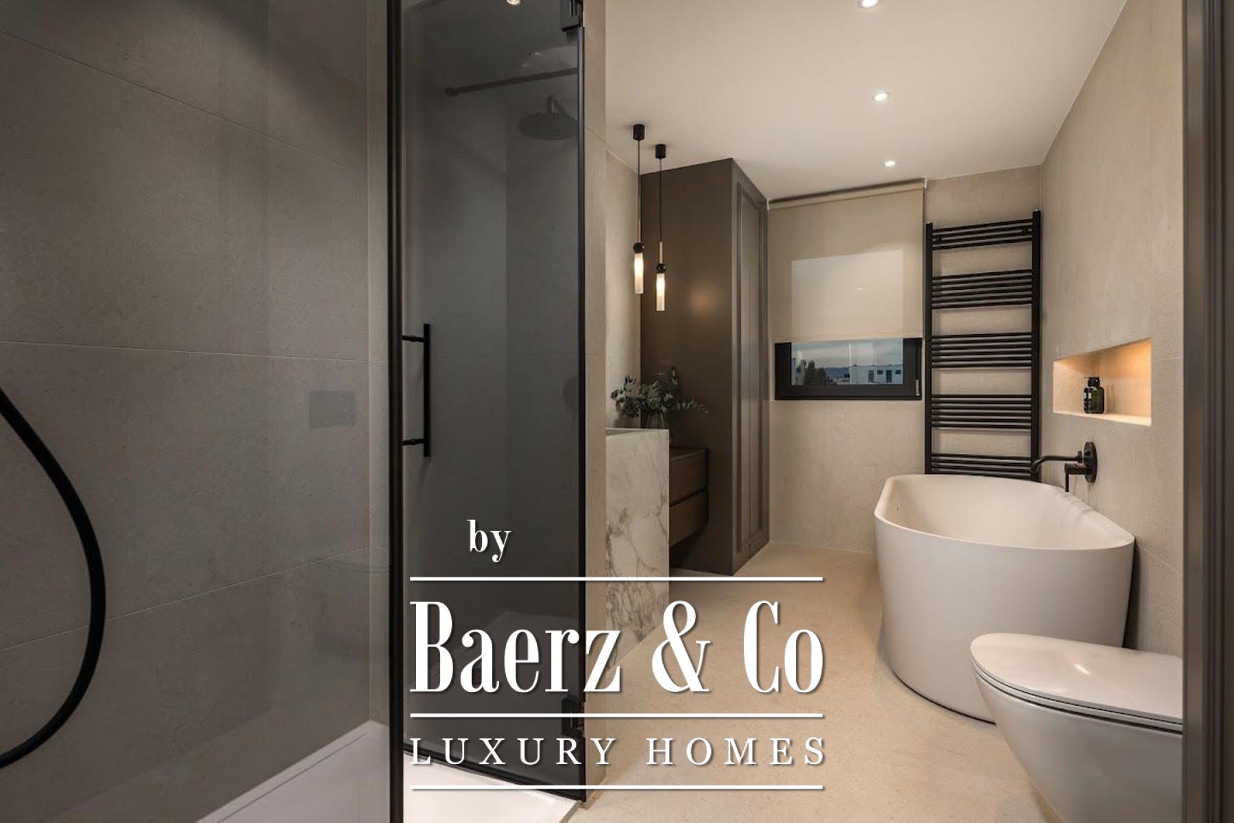 A modern bioethanol fireplace anchors the living area, while the master suite offers a generous walk-in closet, touch lighting, and carefully selected furnishings. Every room opens onto the surrounding terraces, blending natural airflow and outdoor access. Further distinctions include a storage room of 13.10 m², a designer kitchen with premium appliances, a 65" Samsung Frame TV, a wine cabinet, and curated art installations.